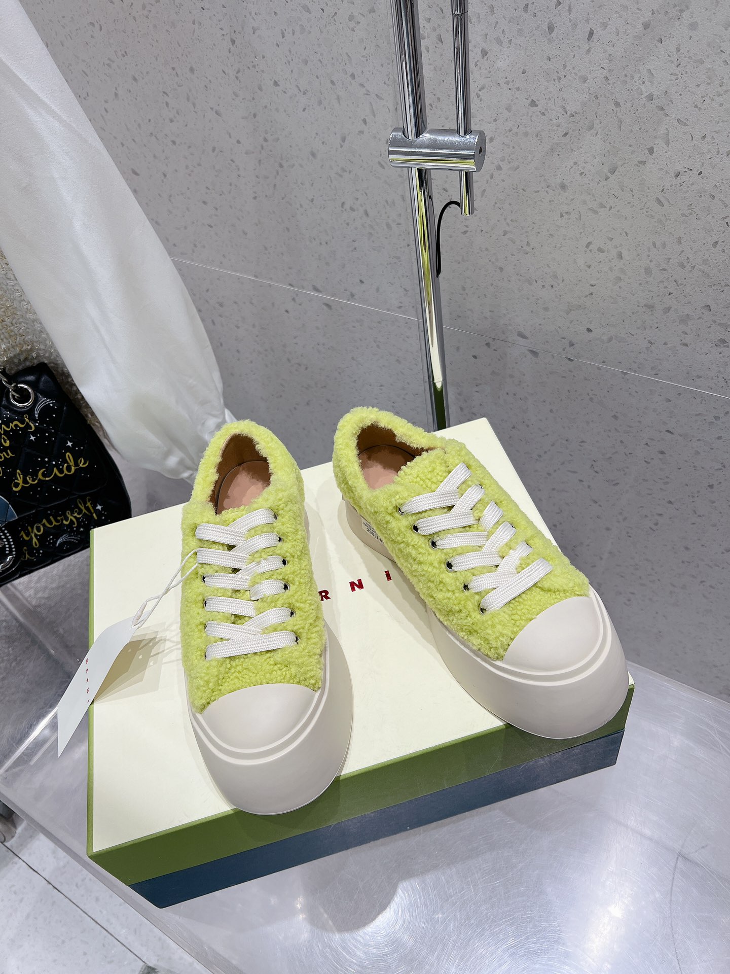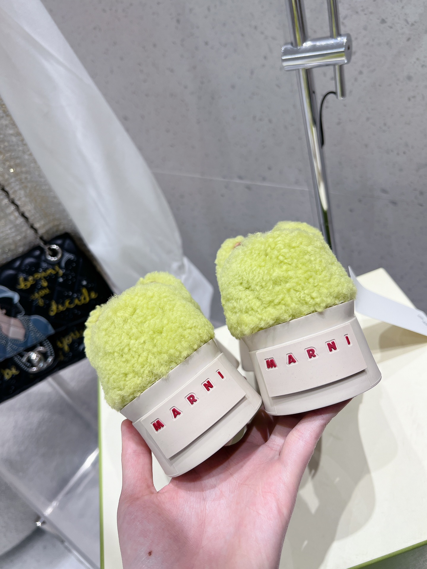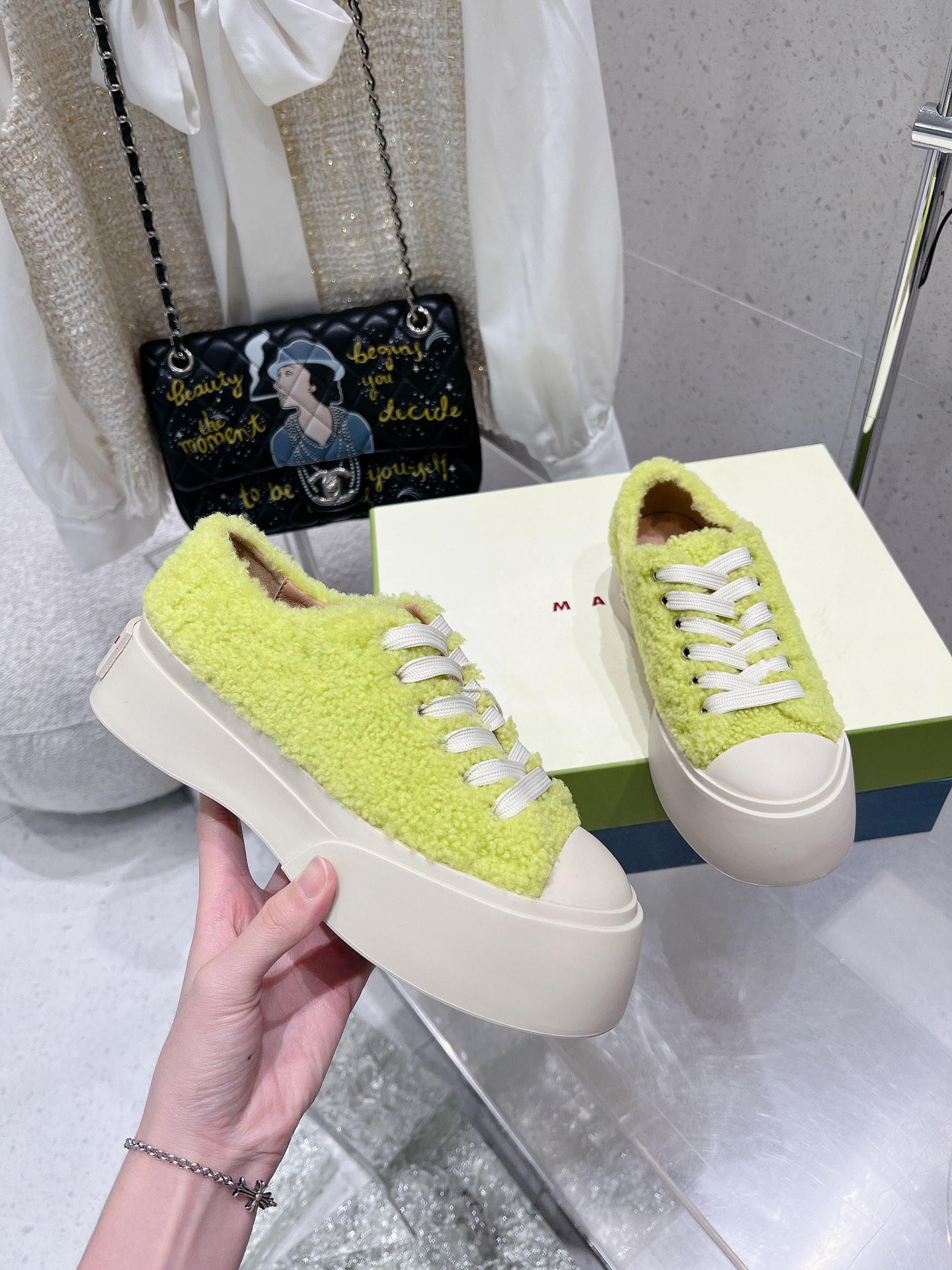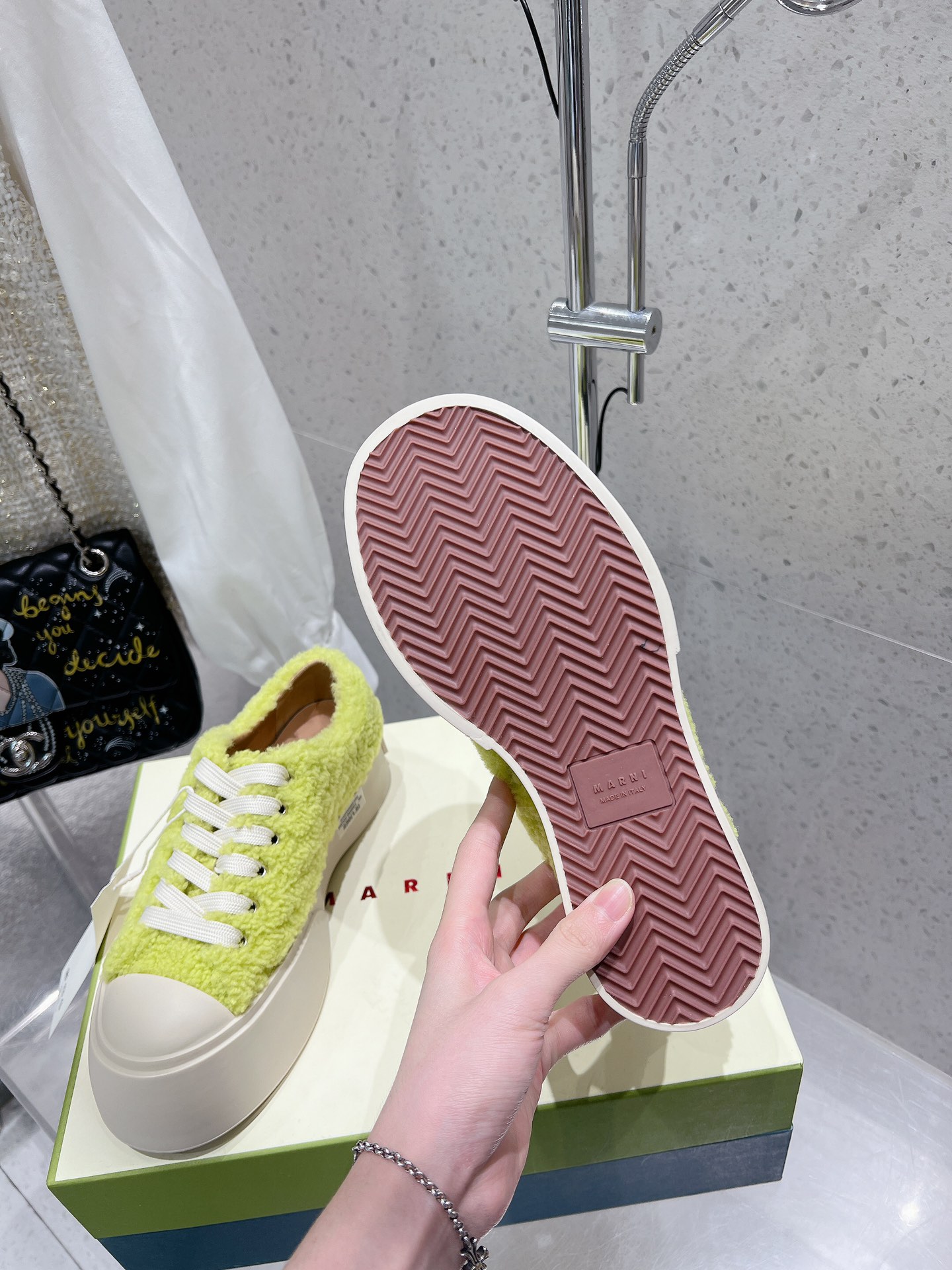 这款鞋子是AAAAA 1:1 质量 (非常棒). 使用了和原版一模一样的材料. 商标部分也保持了和马尔尼/Marni一样. 图片拍摄是实物鞋子拍摄, 您所收到的实物保证和我们图片一模一样.