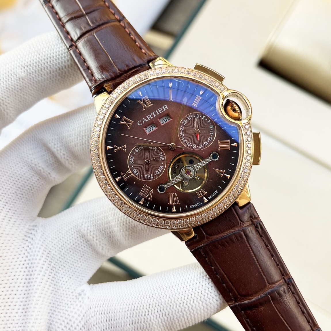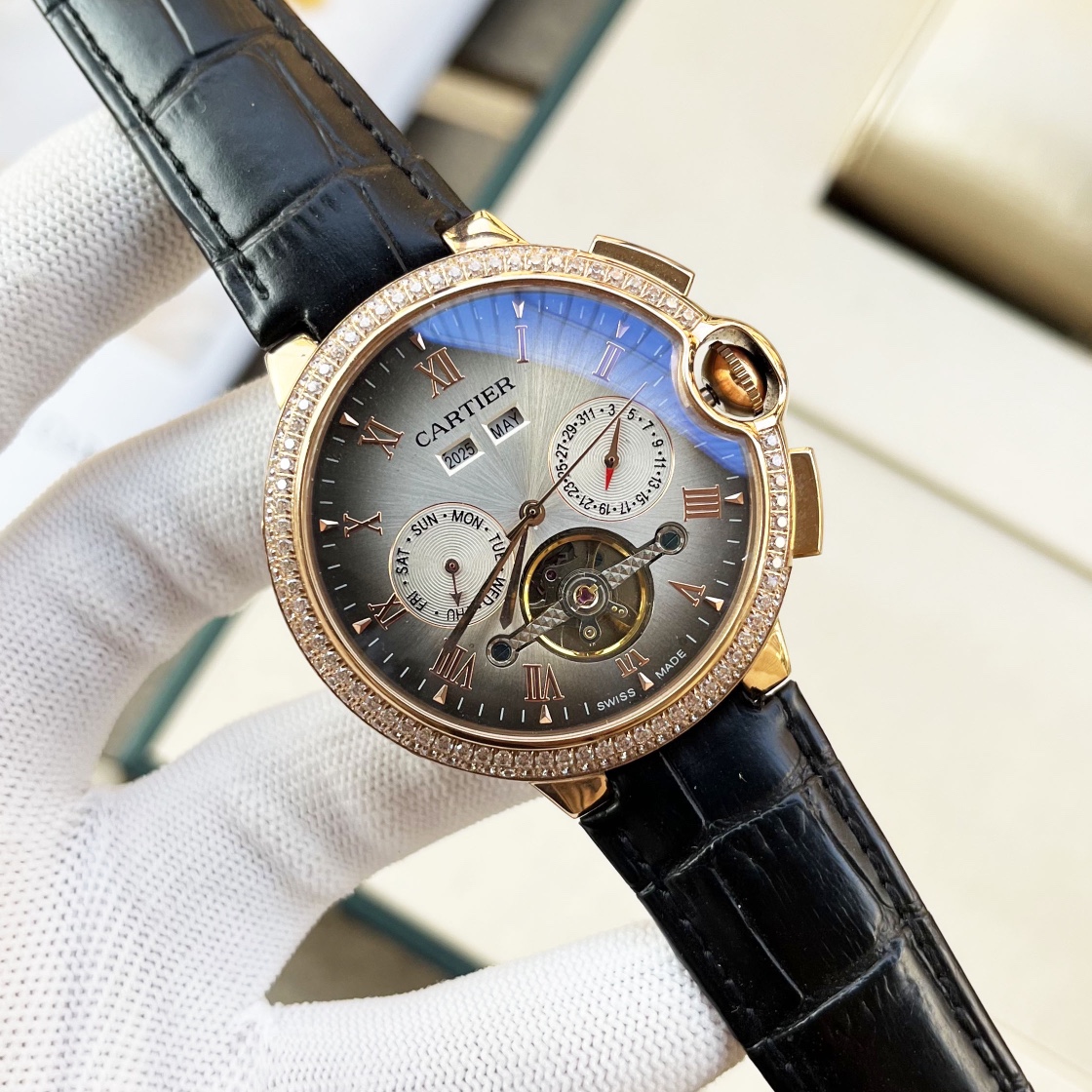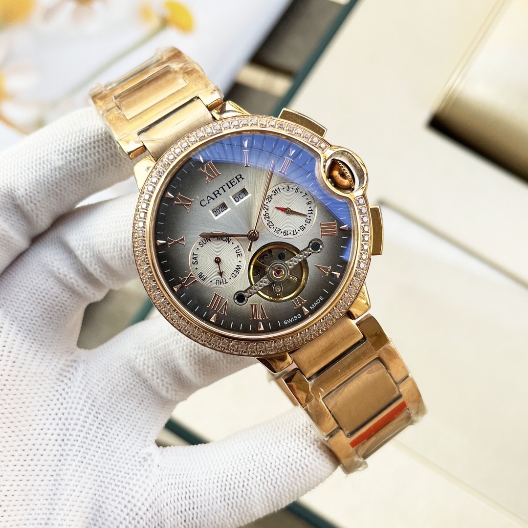 这款手表是AAAAA 1:1 质量 (非常棒). 使用了和原版一模一样的材料. 商标部分也保持了和卡地亚/Cartier一样. 图片拍摄是实物手表拍摄, 您所收到的实物保证和我们图片一模一样.