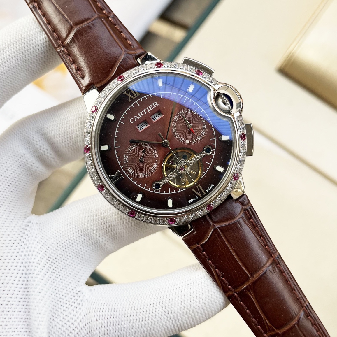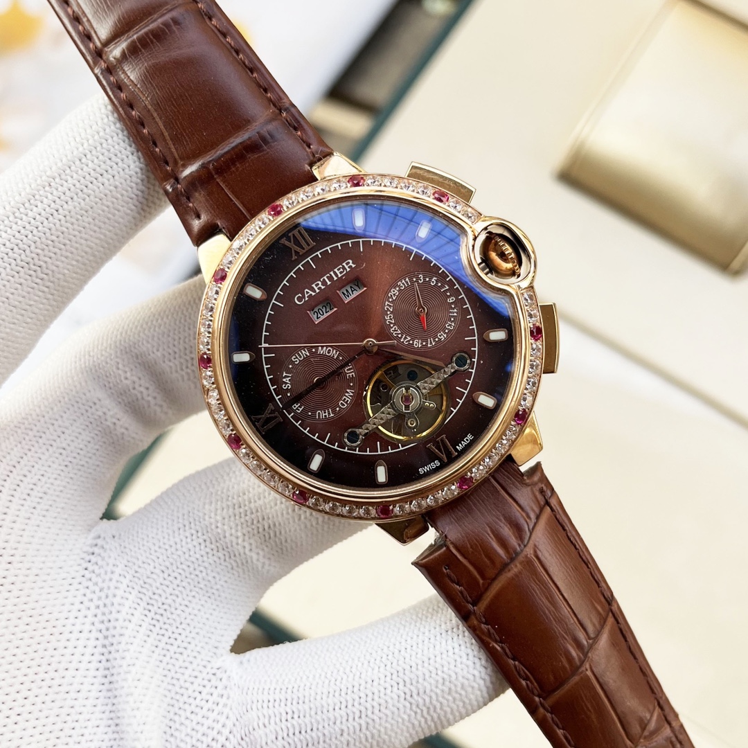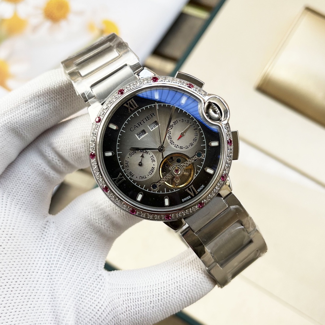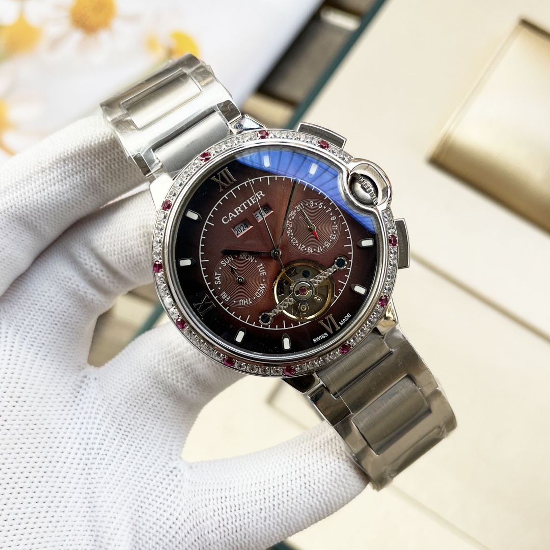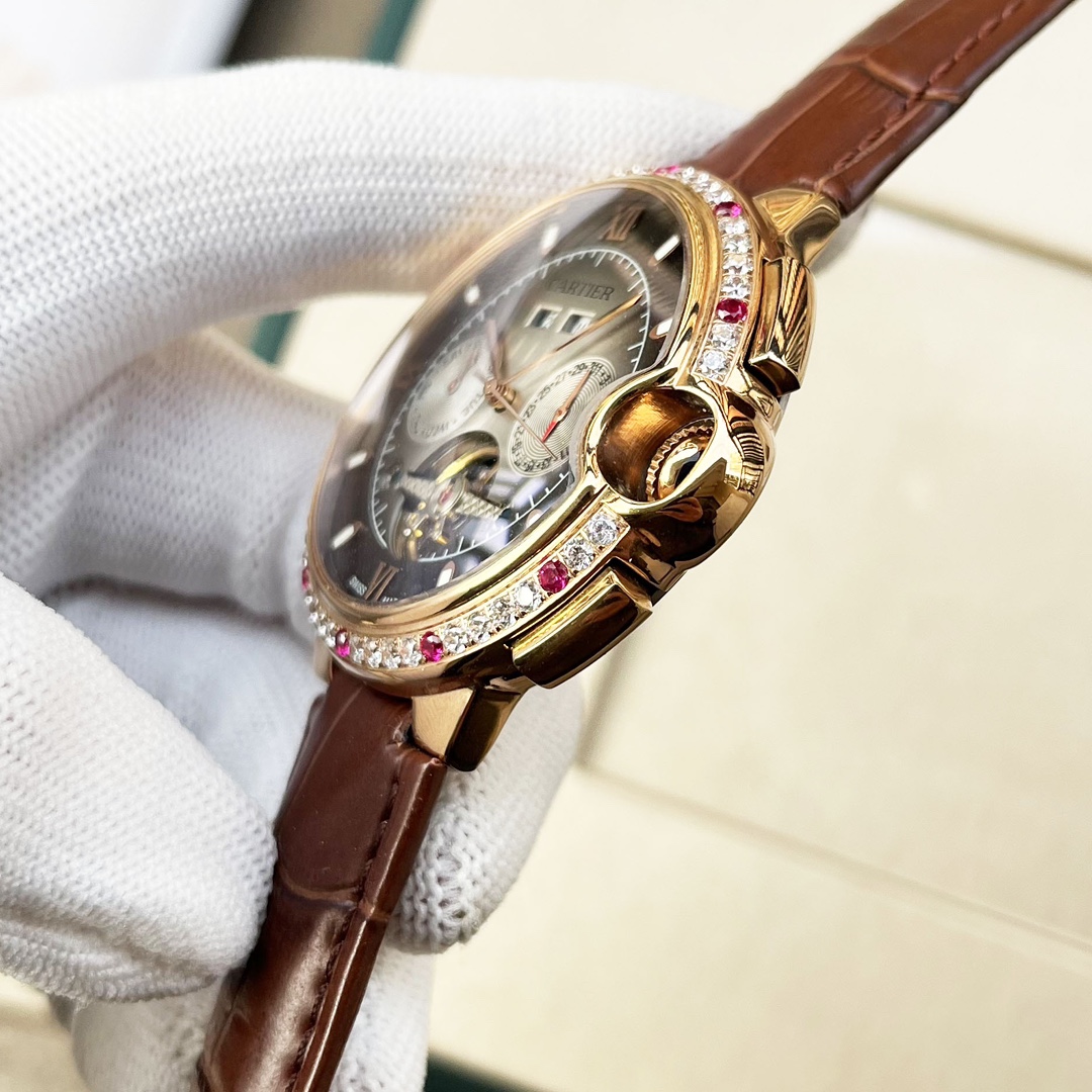 这款手表是AAAAA 1:1 质量 (非常棒). 使用了和原版一模一样的材料. 商标部分也保持了和卡地亚/Cartier一样. 图片拍摄是实物手表拍摄, 您所收到的实物保证和我们图片一模一样.