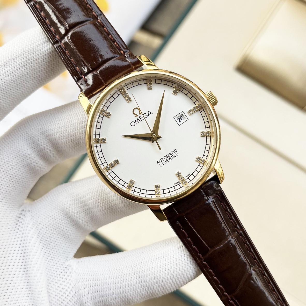 这款手表是AAAAA 1:1 质量 (非常棒). 使用了和原版一模一样的材料. 商标部分也保持了和欧米茄/Omega一样. 图片拍摄是实物手表拍摄, 您所收到的实物保证和我们图片一模一样.