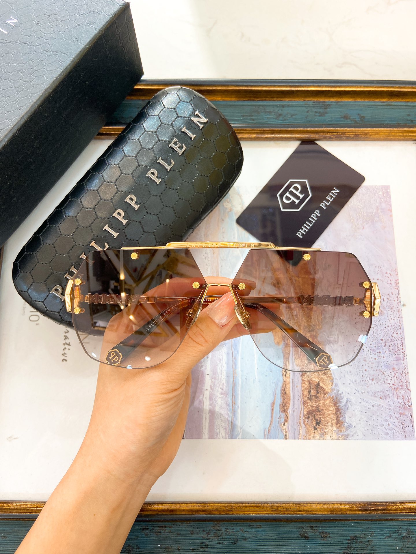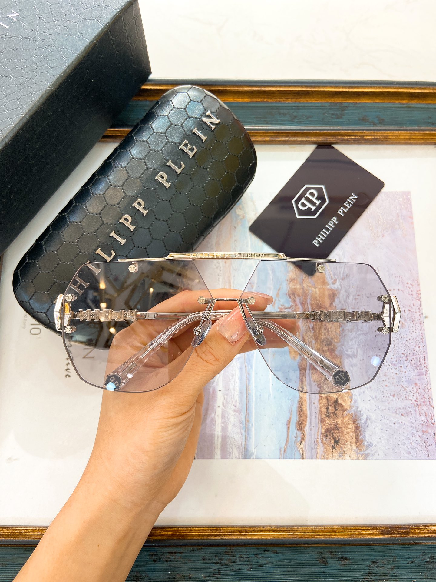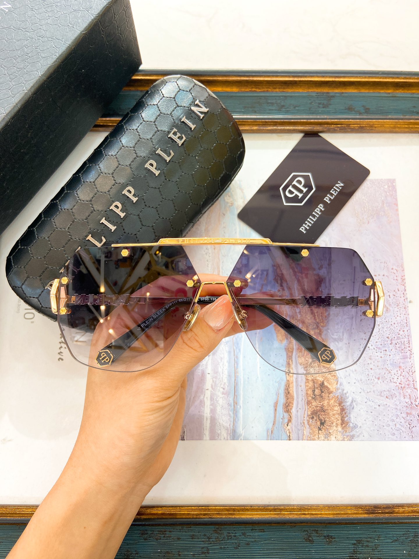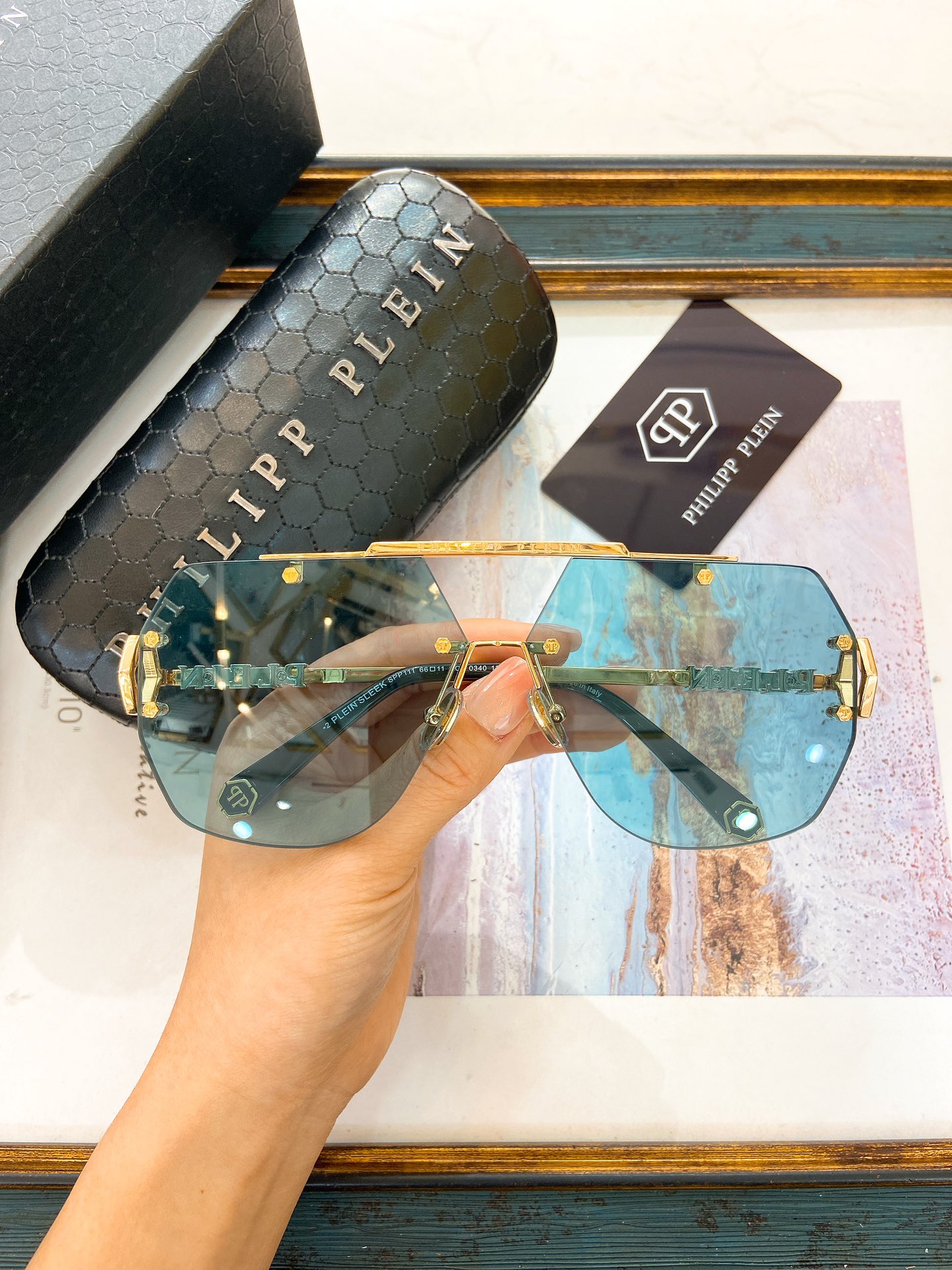 这款太阳眼镜是AAAAA 1:1 质量 (非常棒). 使用了和原版一模一样的材料. 商标部分也保持了和菲利普·普林/Philipp Plein一样. 图片拍摄是实物太阳眼镜拍摄, 您所收到的实物保证和我们图片一模一样.