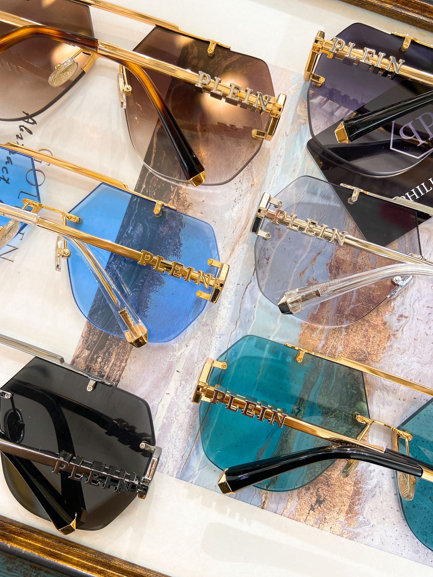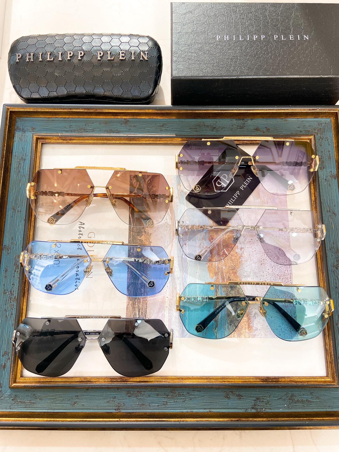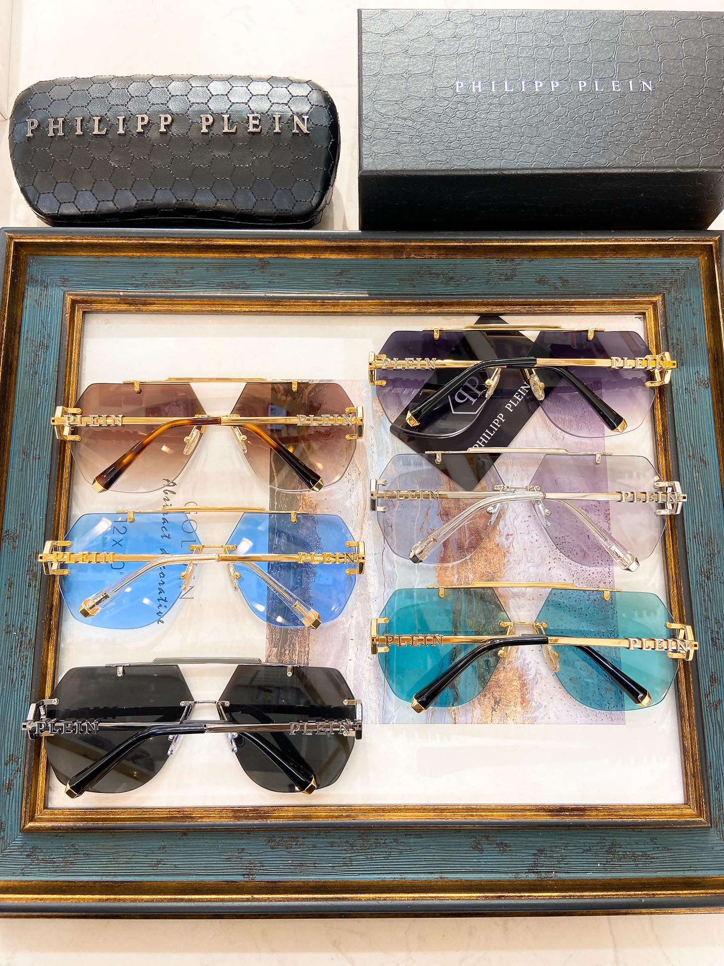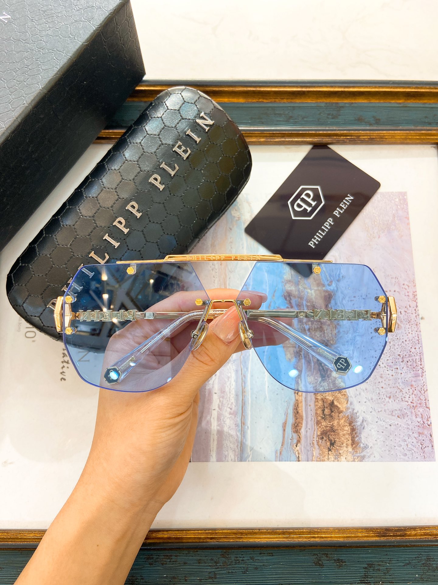 这款太阳眼镜是AAAAA 1:1 质量 (非常棒). 使用了和原版一模一样的材料. 商标部分也保持了和菲利普·普林/Philipp Plein一样. 图片拍摄是实物太阳眼镜拍摄, 您所收到的实物保证和我们图片一模一样.