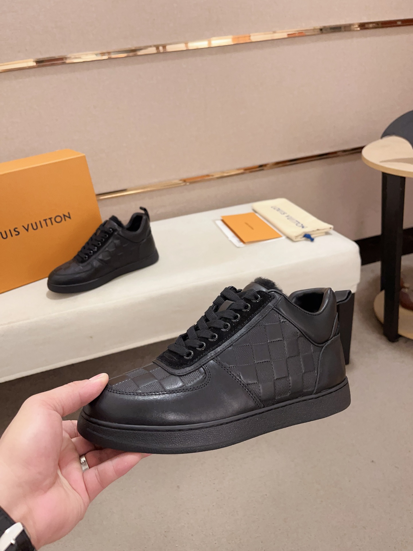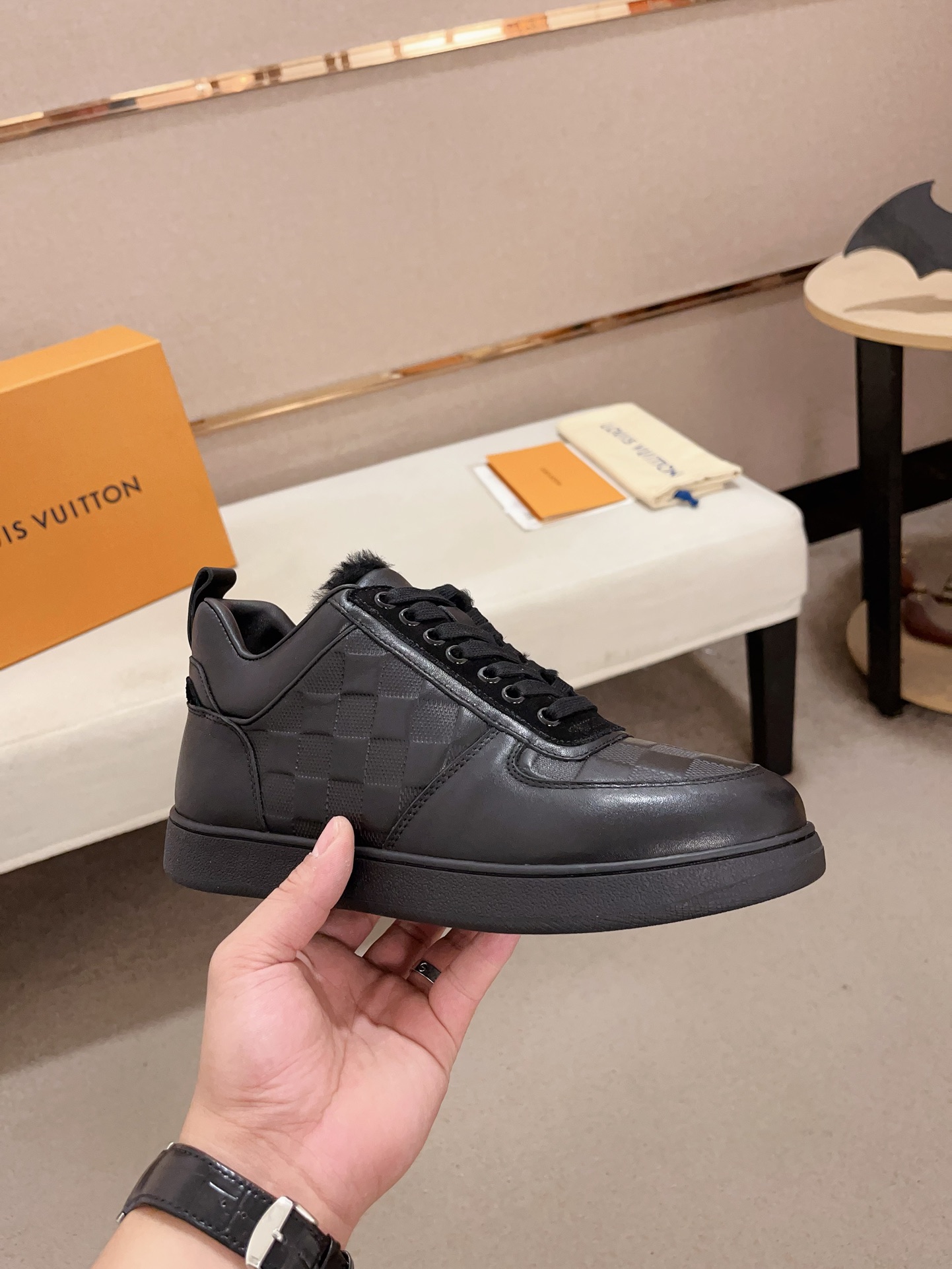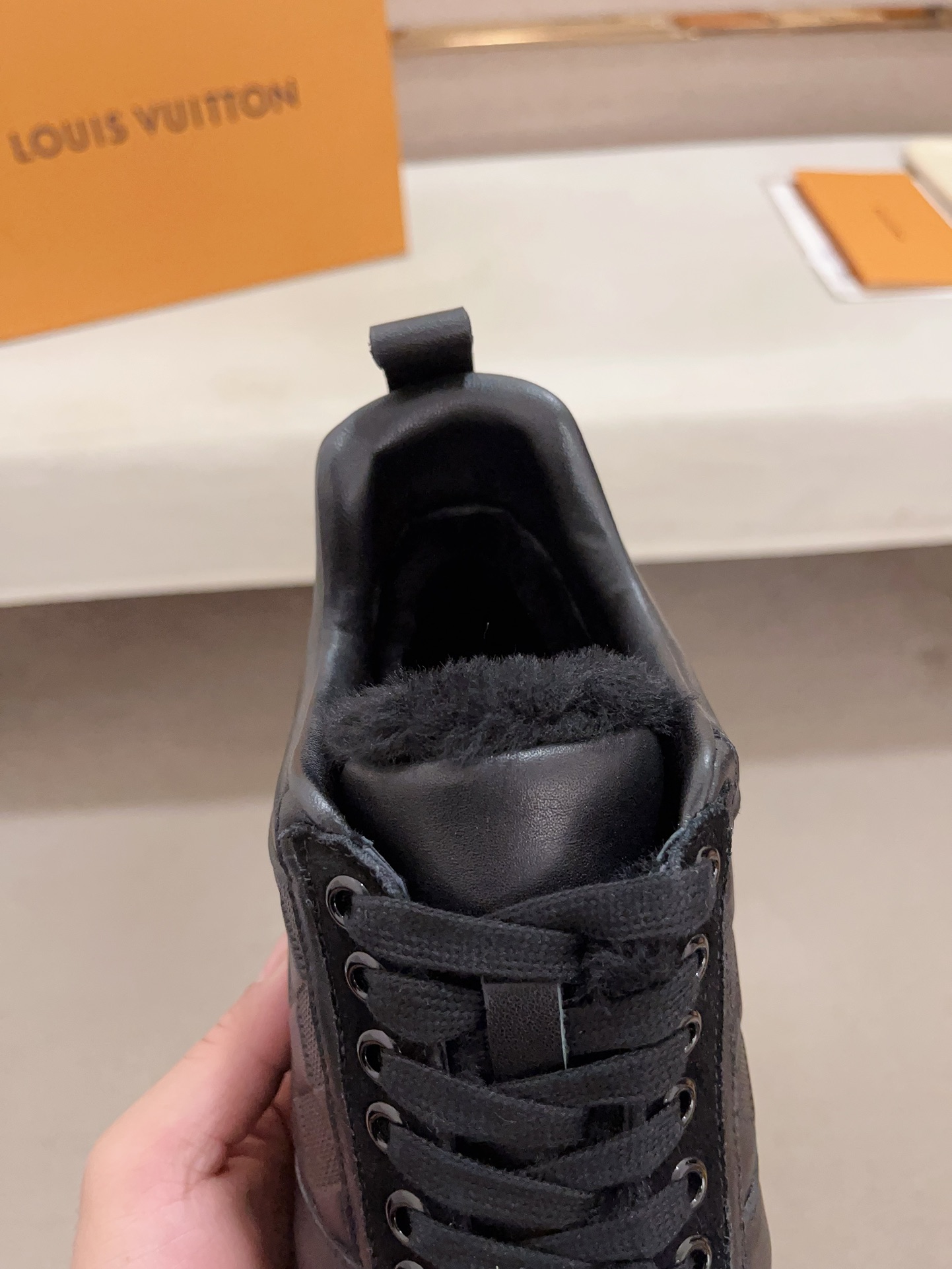 这款鞋子是AAAAA 1:1 质量 (非常棒). 使用了和原版一模一样的材料. 商标部分也保持了和路易威登/Louis Vuitton一样. 图片拍摄是实物鞋子拍摄, 您所收到的实物保证和我们图片一模一样.