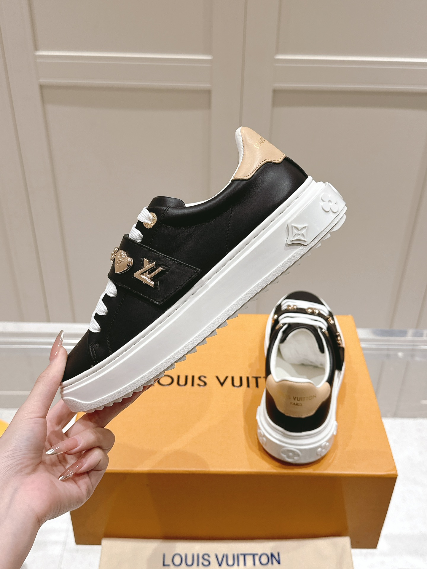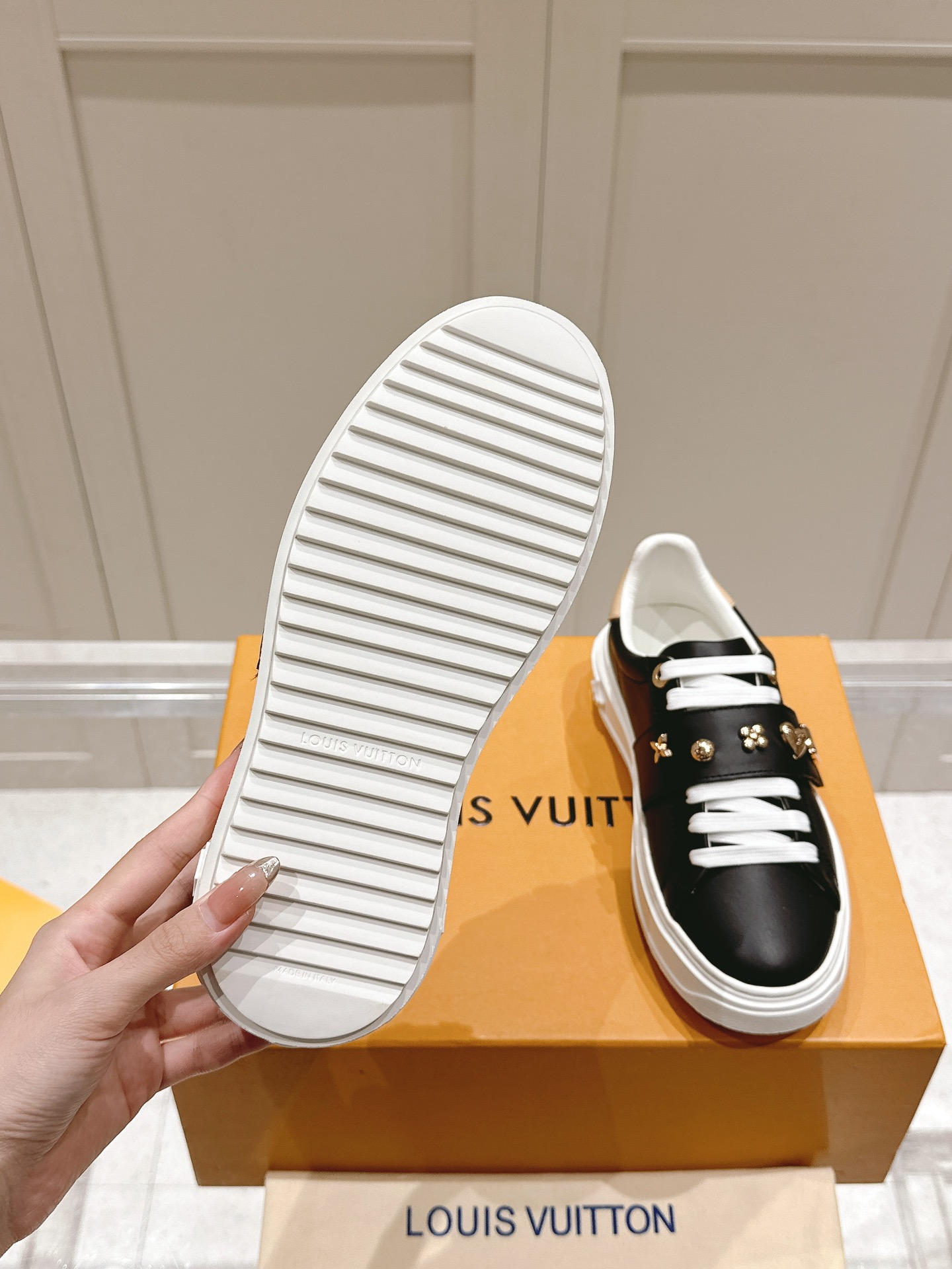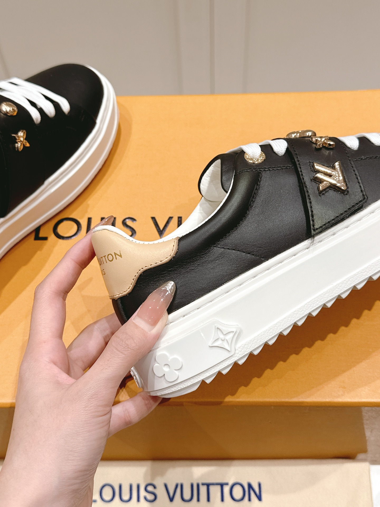 这款鞋子是AAAAA 1:1 质量 (非常棒). 使用了和原版一模一样的材料. 商标部分也保持了和路易威登/Louis Vuitton一样. 图片拍摄是实物鞋子拍摄, 您所收到的实物保证和我们图片一模一样.