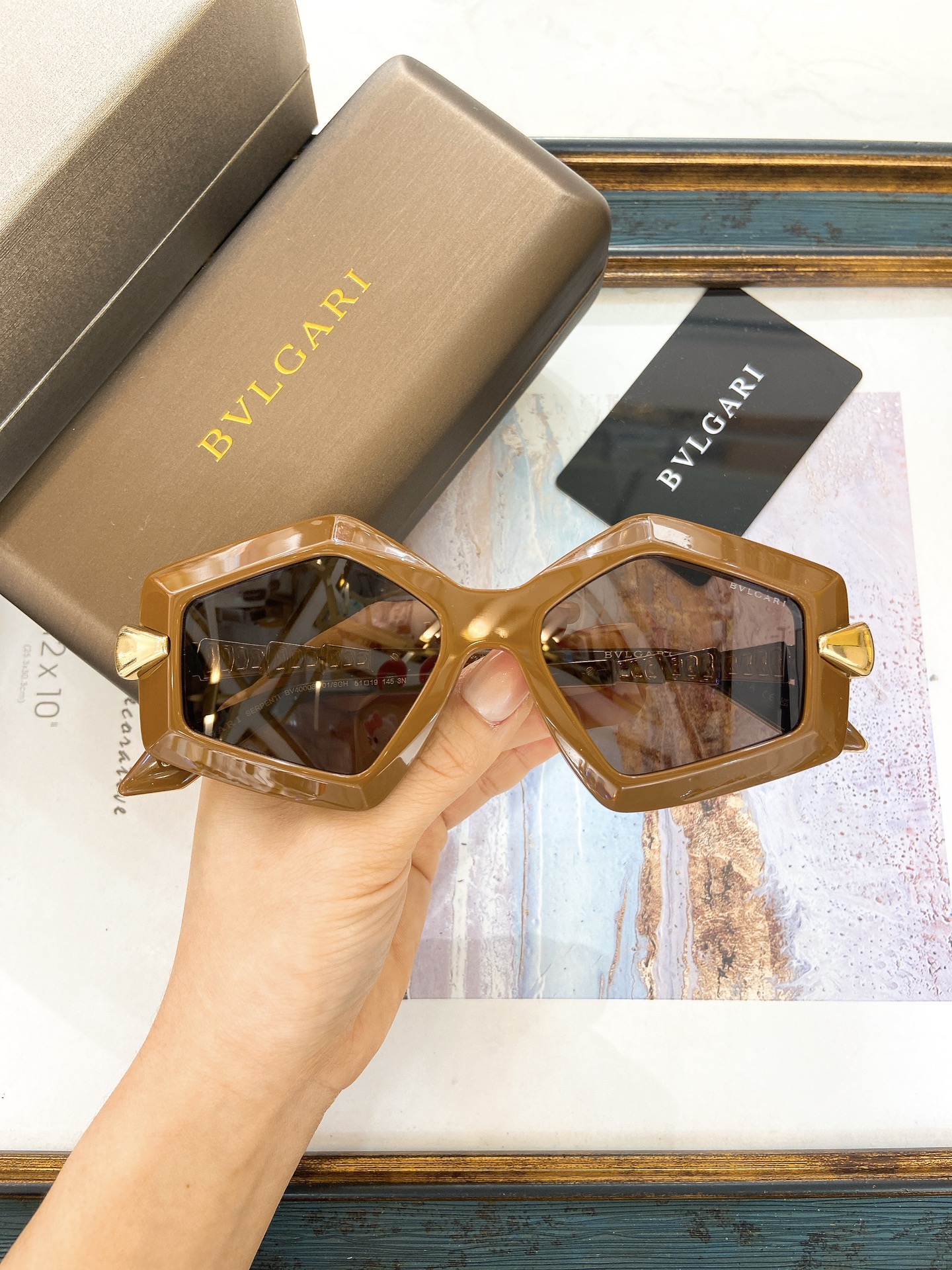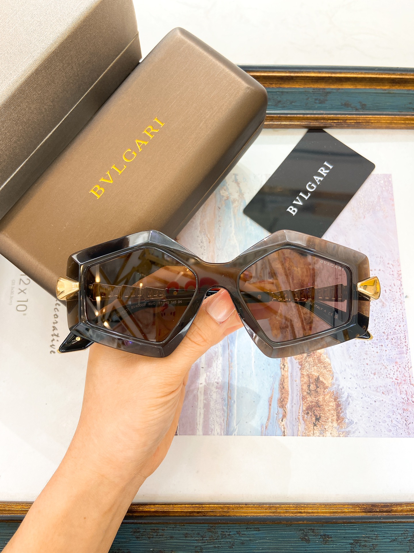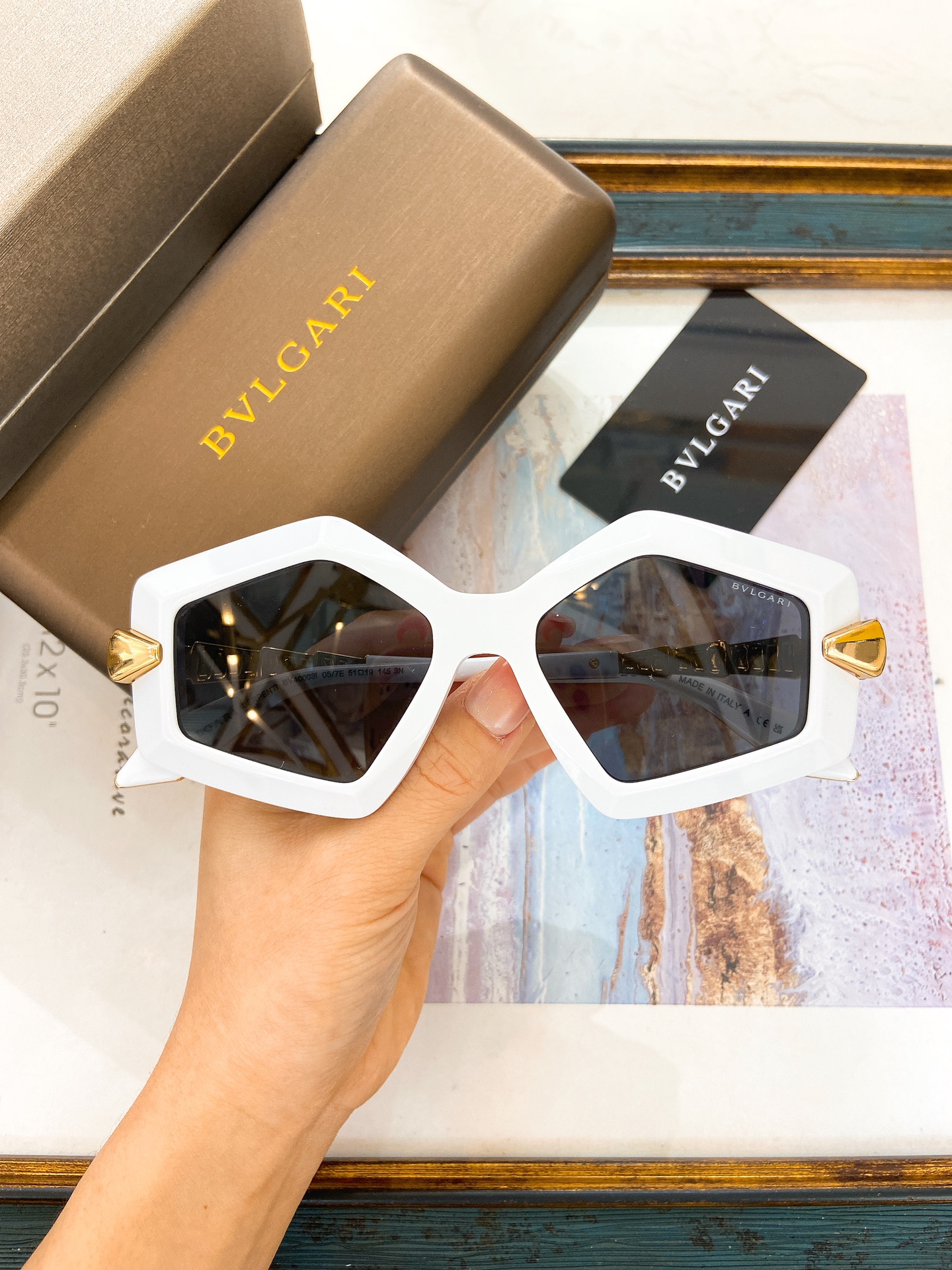 这款太阳眼镜是AAAAA 1:1 质量 (非常棒). 使用了和原版一模一样的材料. 商标部分也保持了和宝格丽/Bulgari一样. 图片拍摄是实物太阳眼镜拍摄, 您所收到的实物保证和我们图片一模一样.