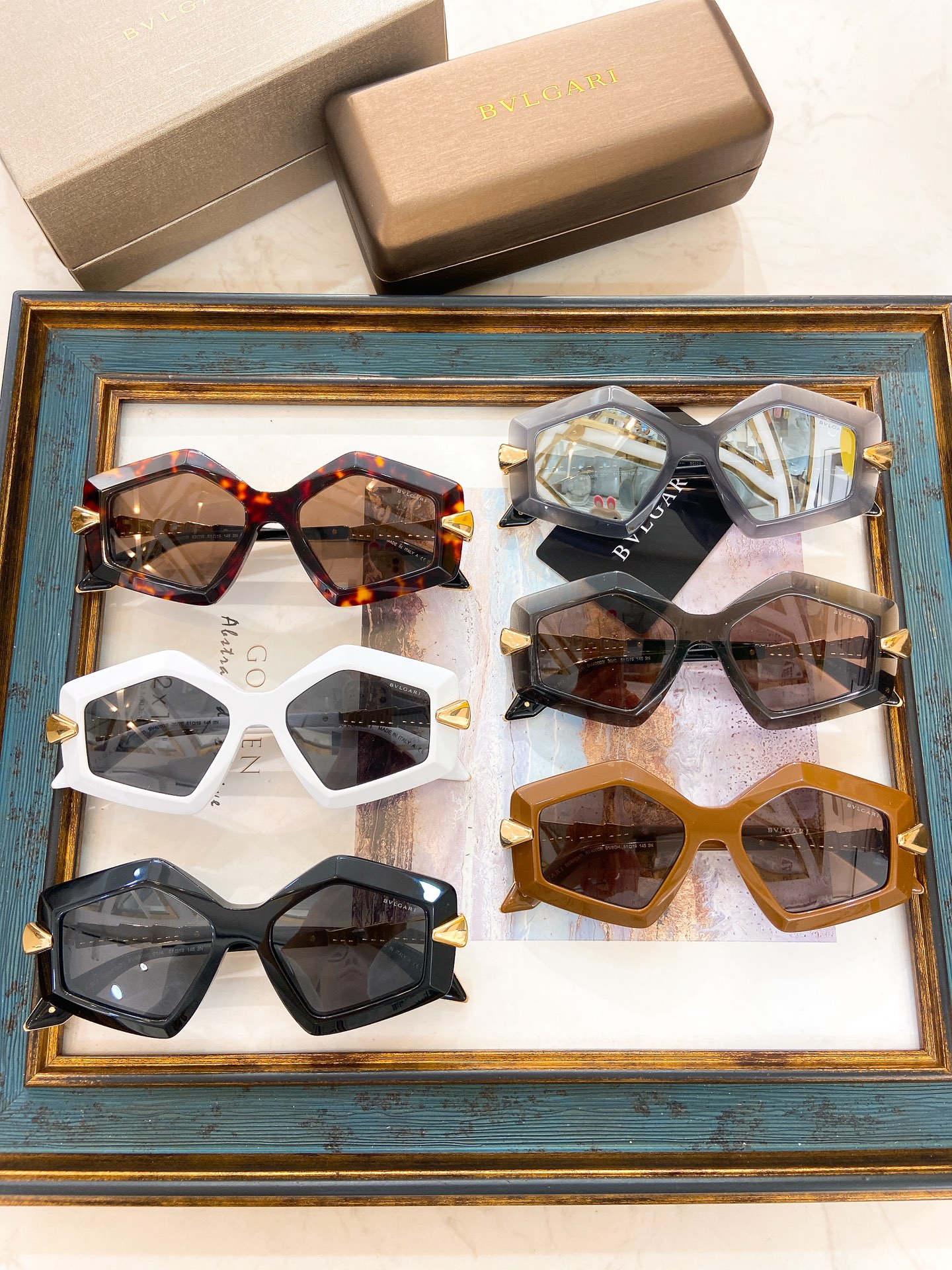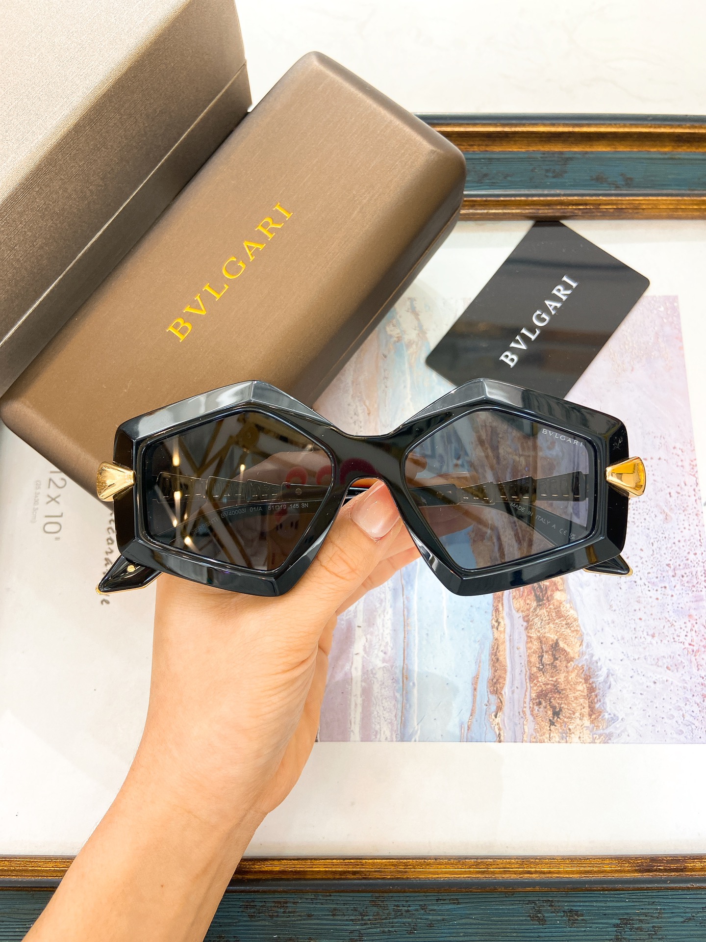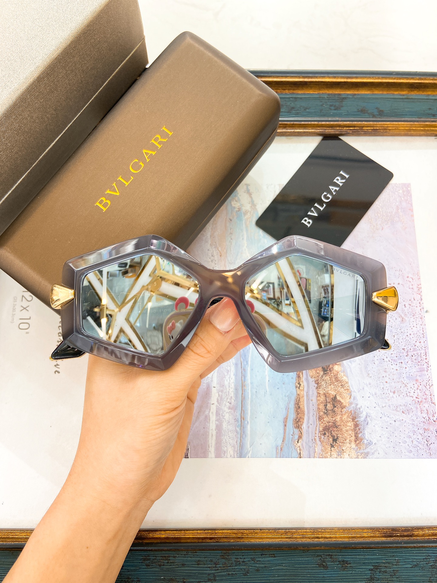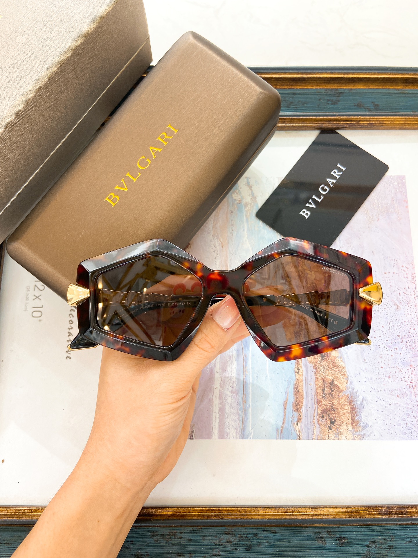 这款太阳眼镜是AAAAA 1:1 质量 (非常棒). 使用了和原版一模一样的材料. 商标部分也保持了和宝格丽/Bulgari一样. 图片拍摄是实物太阳眼镜拍摄, 您所收到的实物保证和我们图片一模一样.