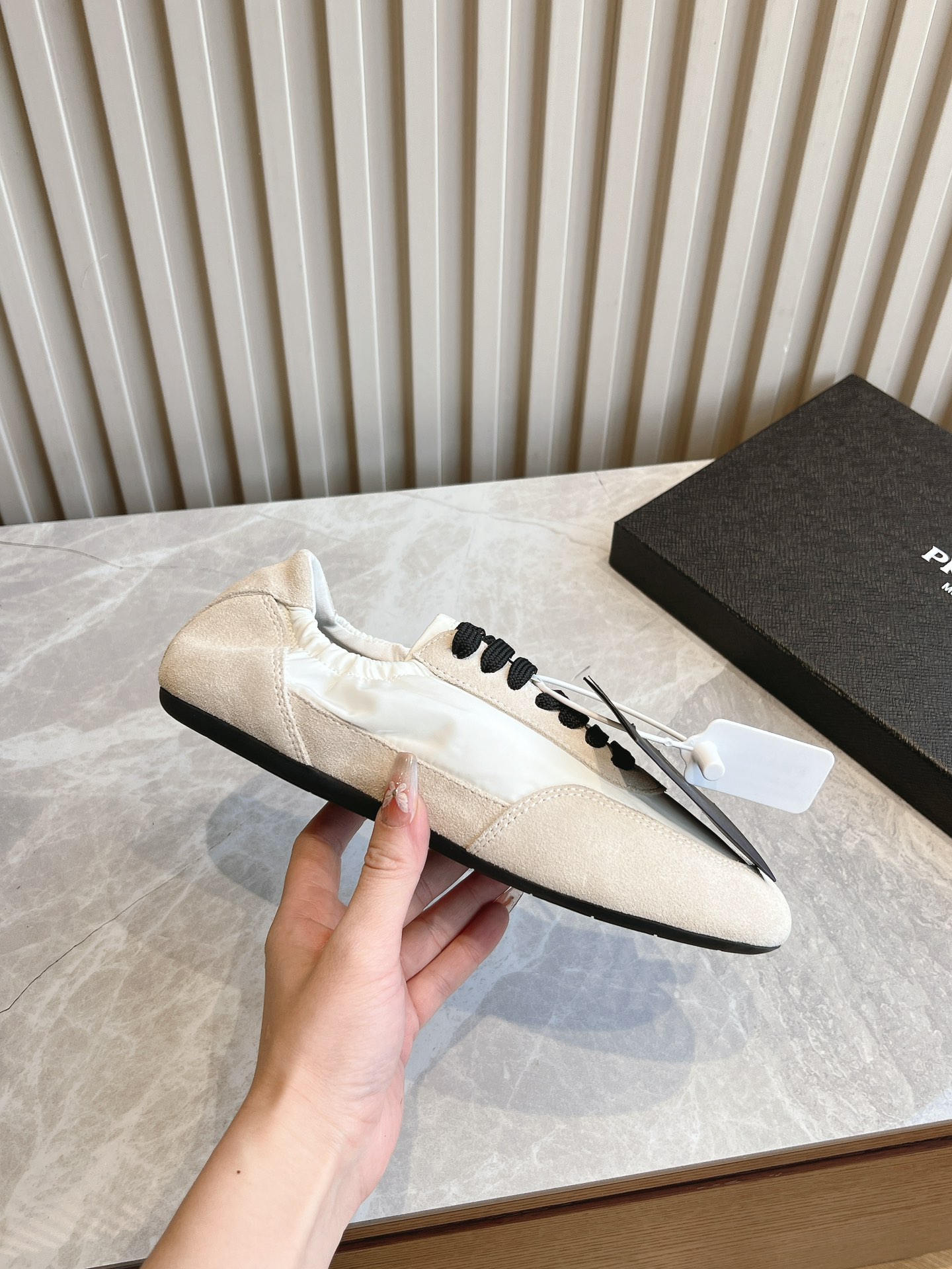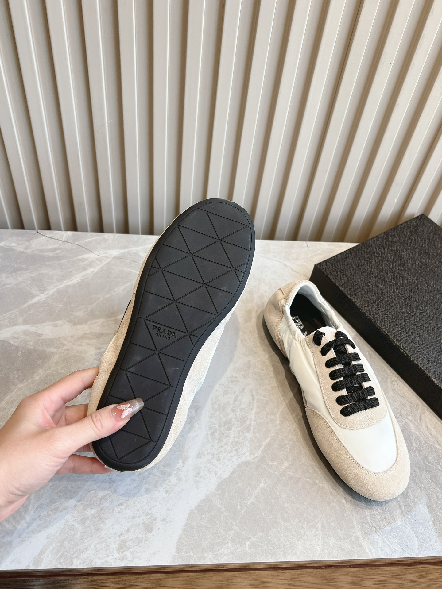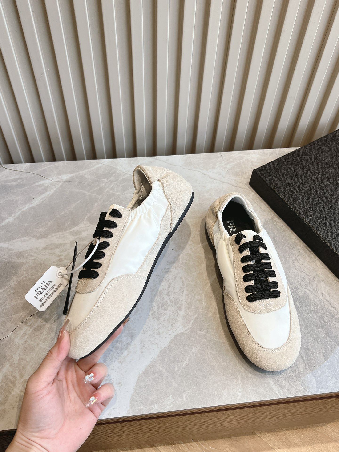 这款鞋子是AAAAA 1:1 质量 (非常棒). 使用了和原版一模一样的材料. 商标部分也保持了和普拉达/Prada一样. 图片拍摄是实物鞋子拍摄, 您所收到的实物保证和我们图片一模一样.
