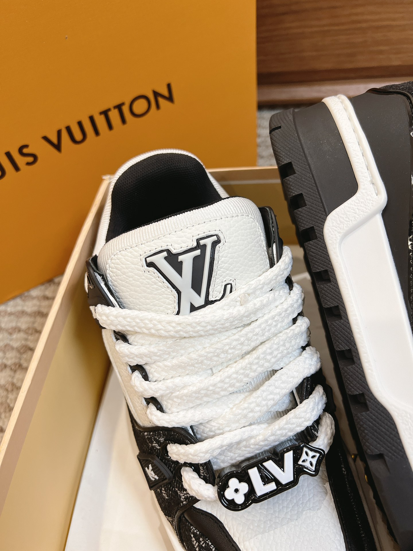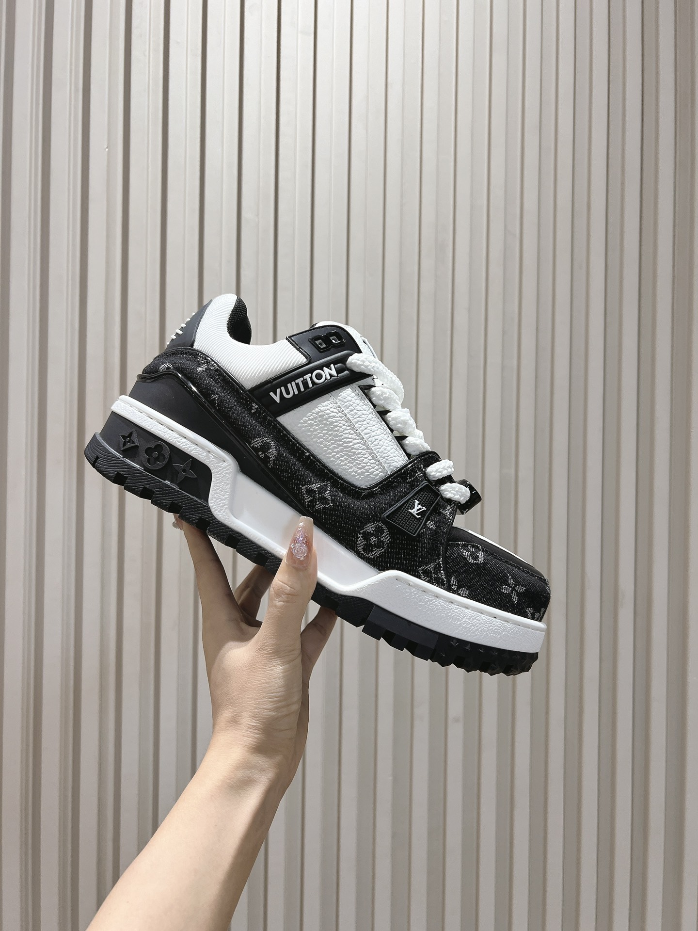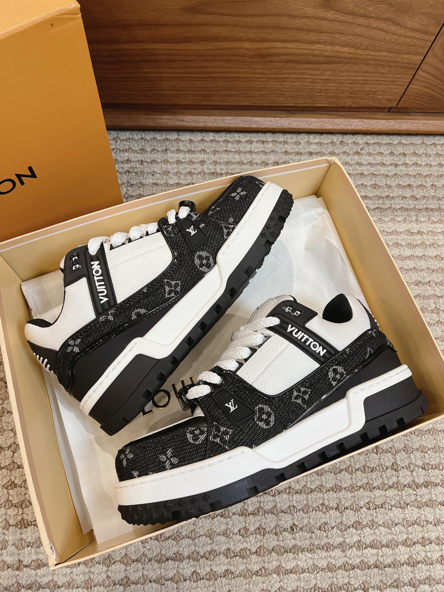 这款鞋子是AAAAA 1:1 质量 (非常棒). 使用了和原版一模一样的材料. 商标部分也保持了和路易威登/Louis Vuitton一样. 图片拍摄是实物鞋子拍摄, 您所收到的实物保证和我们图片一模一样.