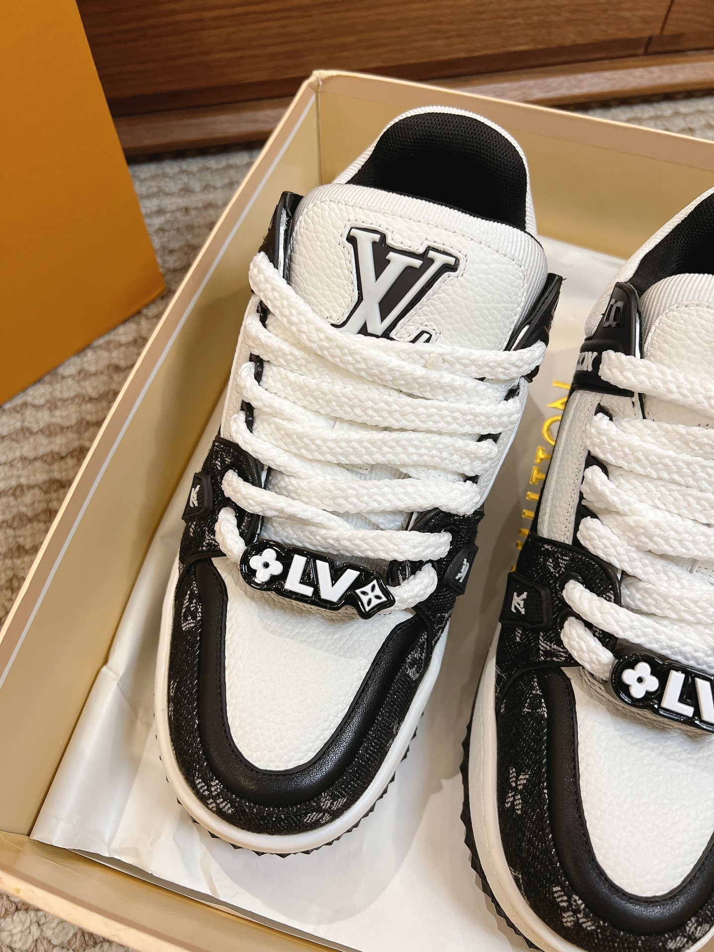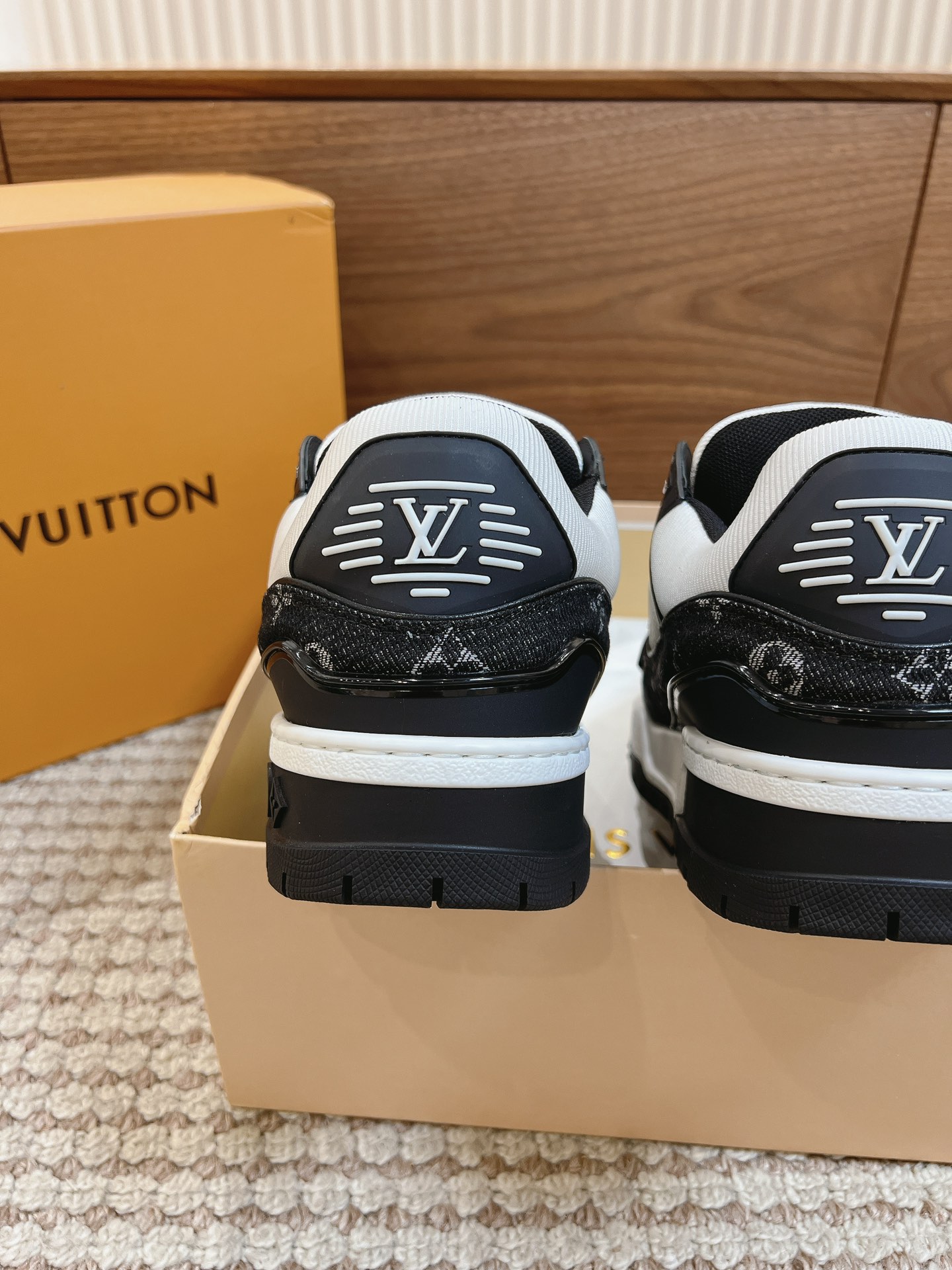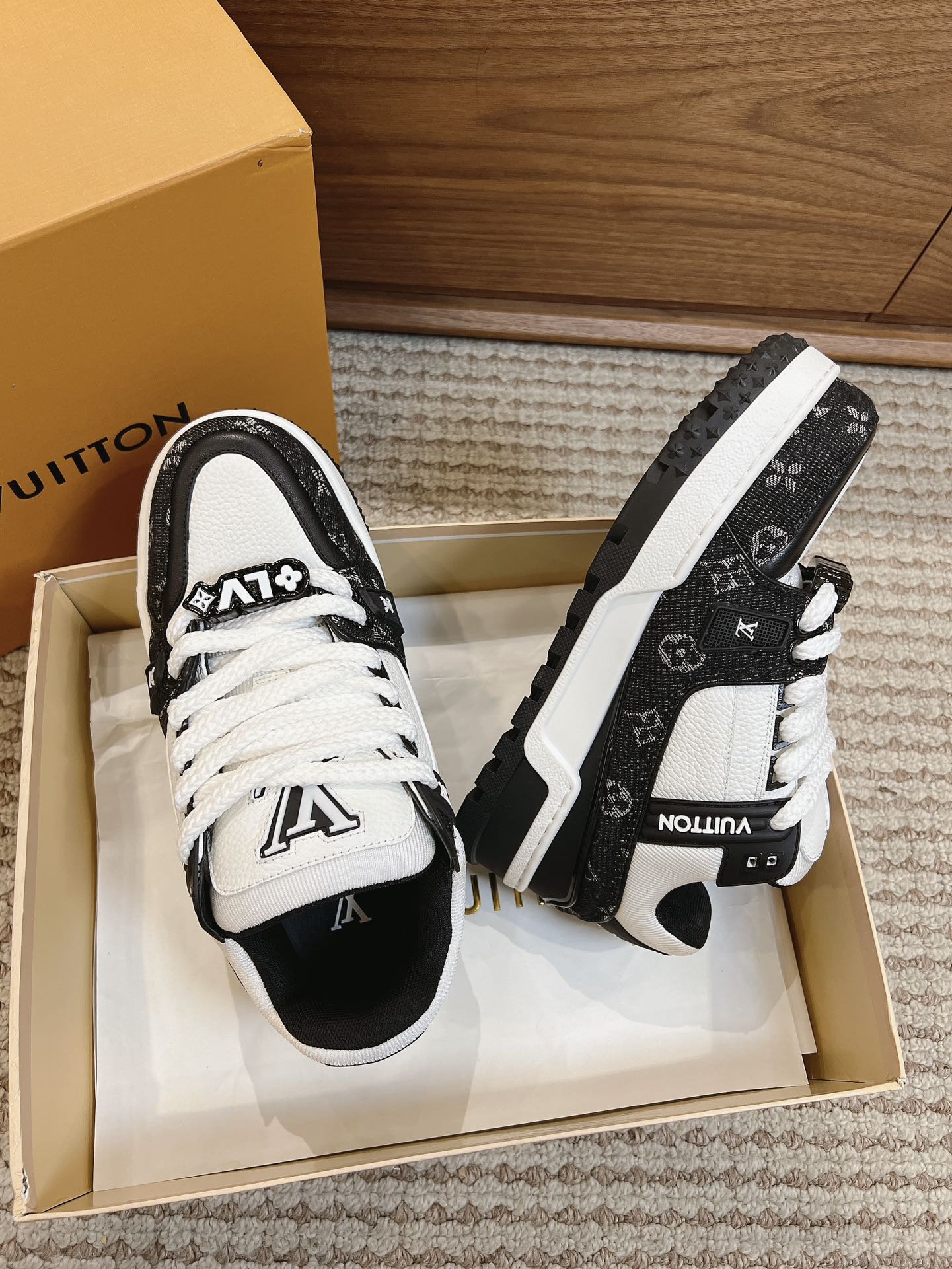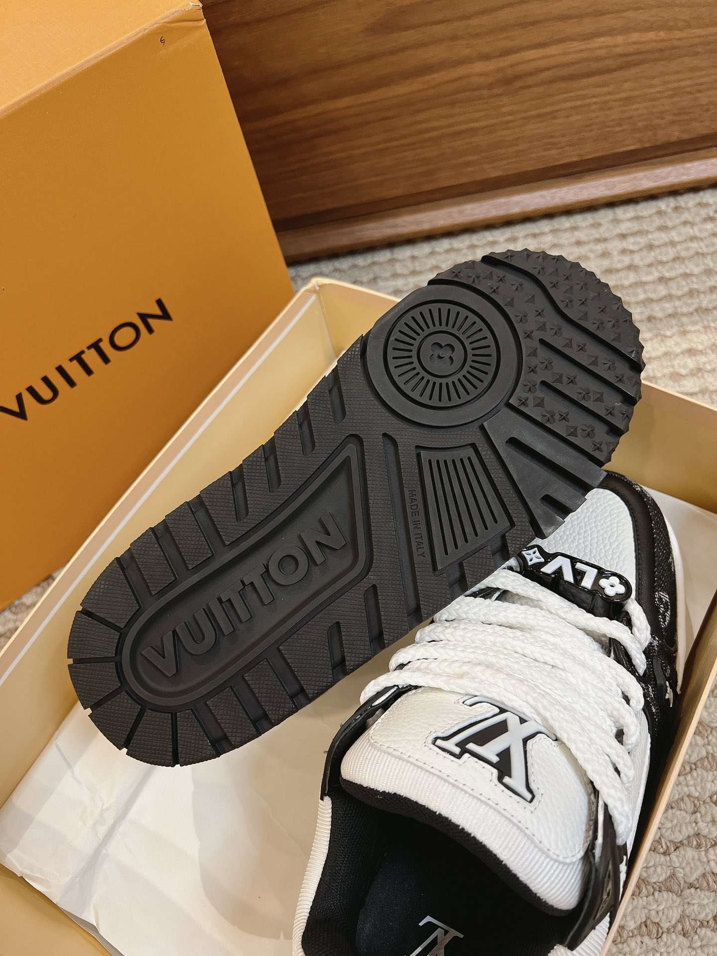 这款鞋子是AAAAA 1:1 质量 (非常棒). 使用了和原版一模一样的材料. 商标部分也保持了和路易威登/Louis Vuitton一样. 图片拍摄是实物鞋子拍摄, 您所收到的实物保证和我们图片一模一样.