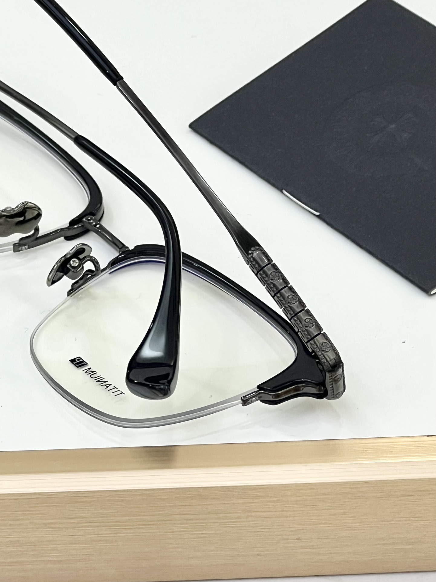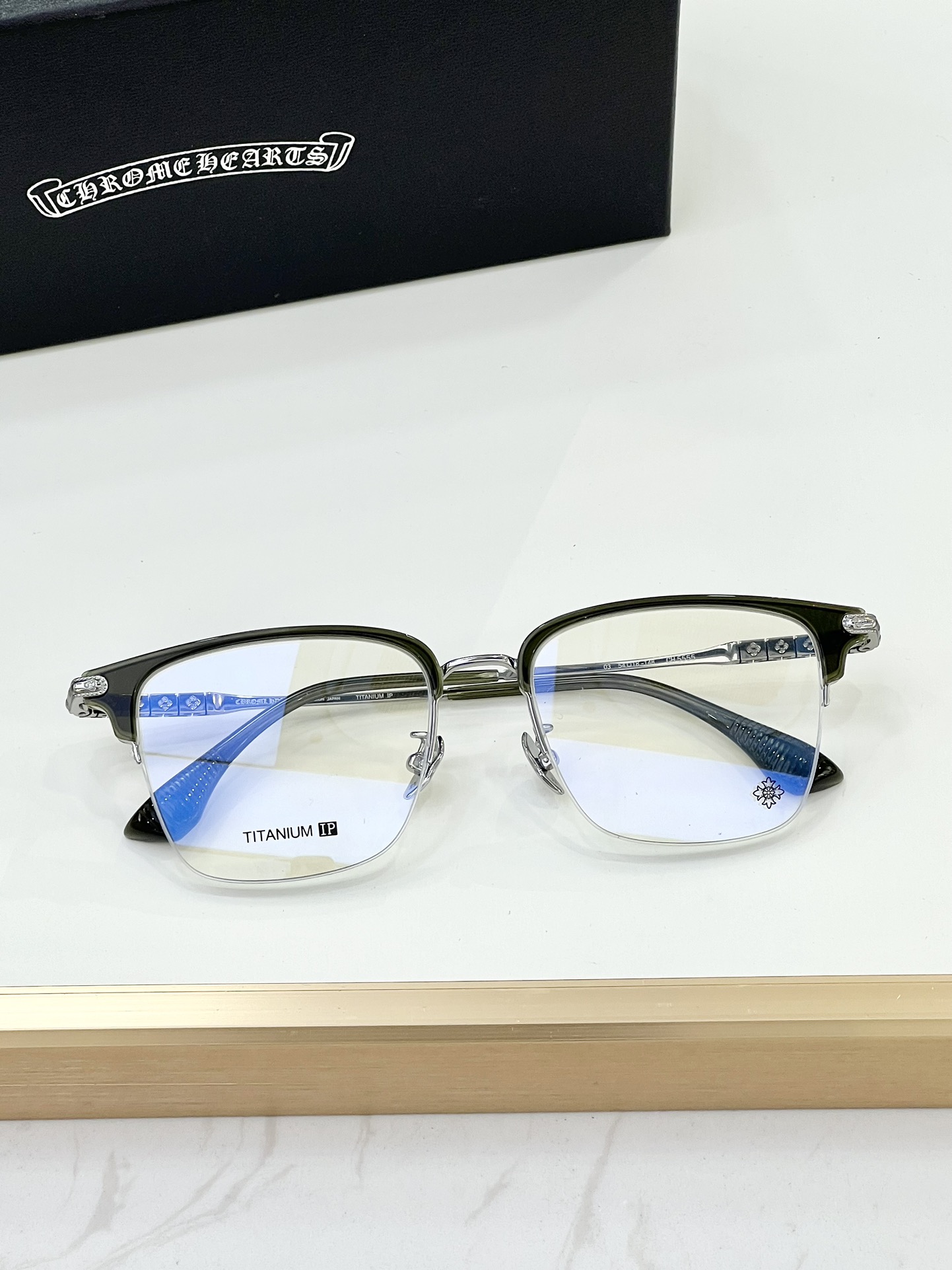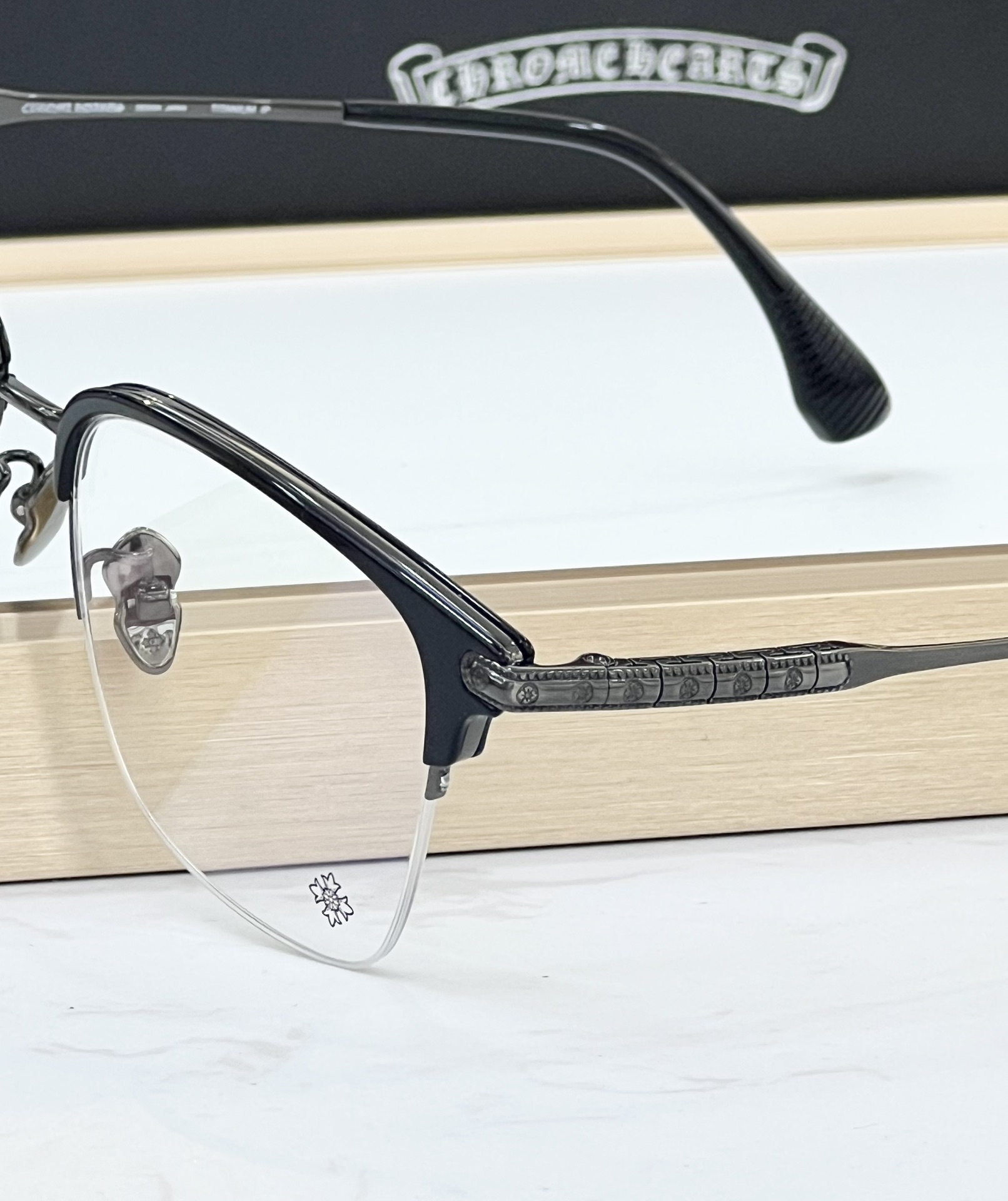 这款太阳眼镜是AAAAA 1:1 质量 (非常棒). 使用了和原版一模一样的材料. 商标部分也保持了和克罗心/Chrome Hearts一样. 图片拍摄是实物太阳眼镜拍摄, 您所收到的实物保证和我们图片一模一样.