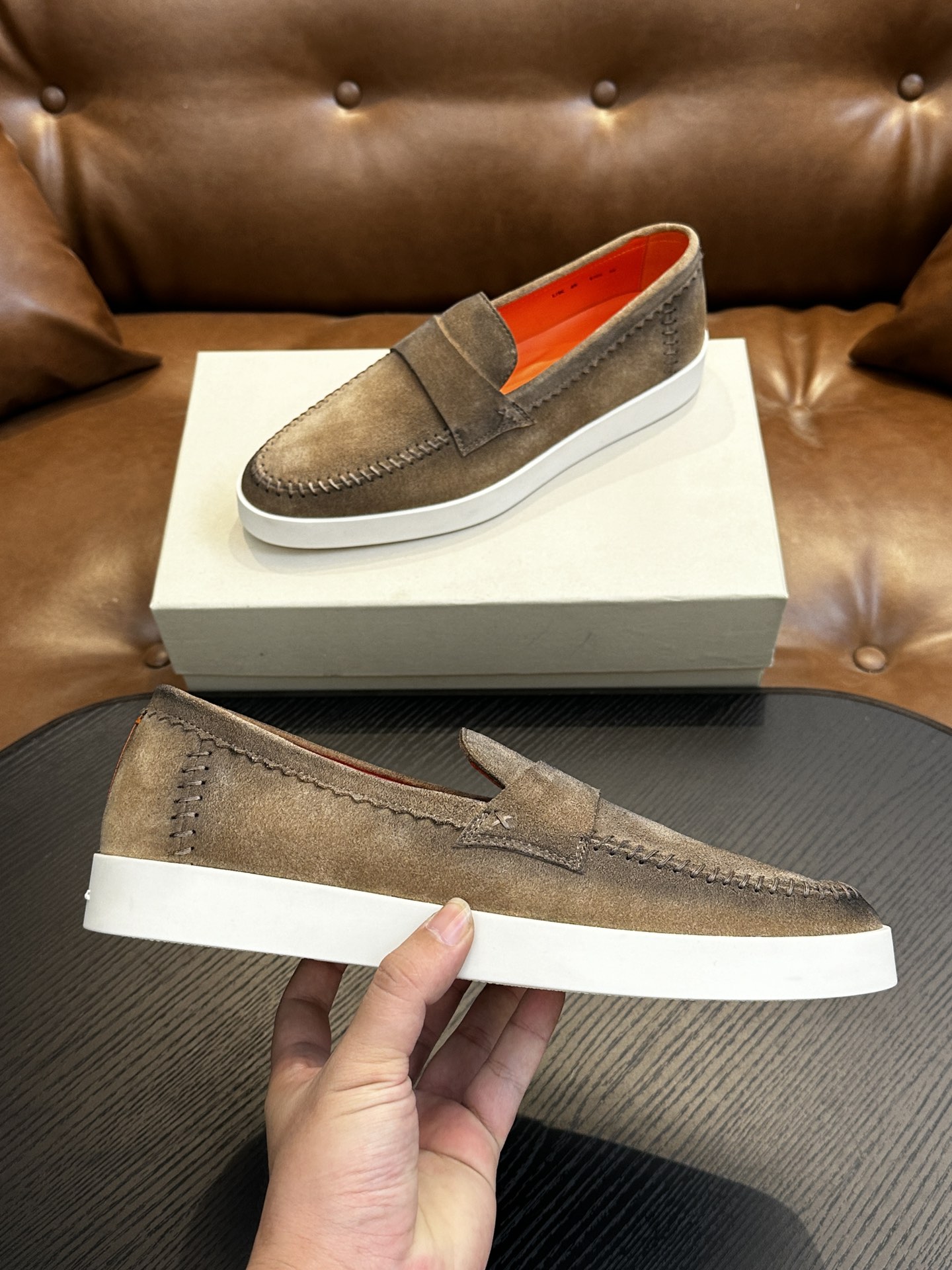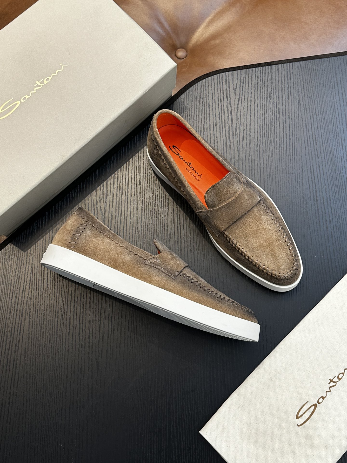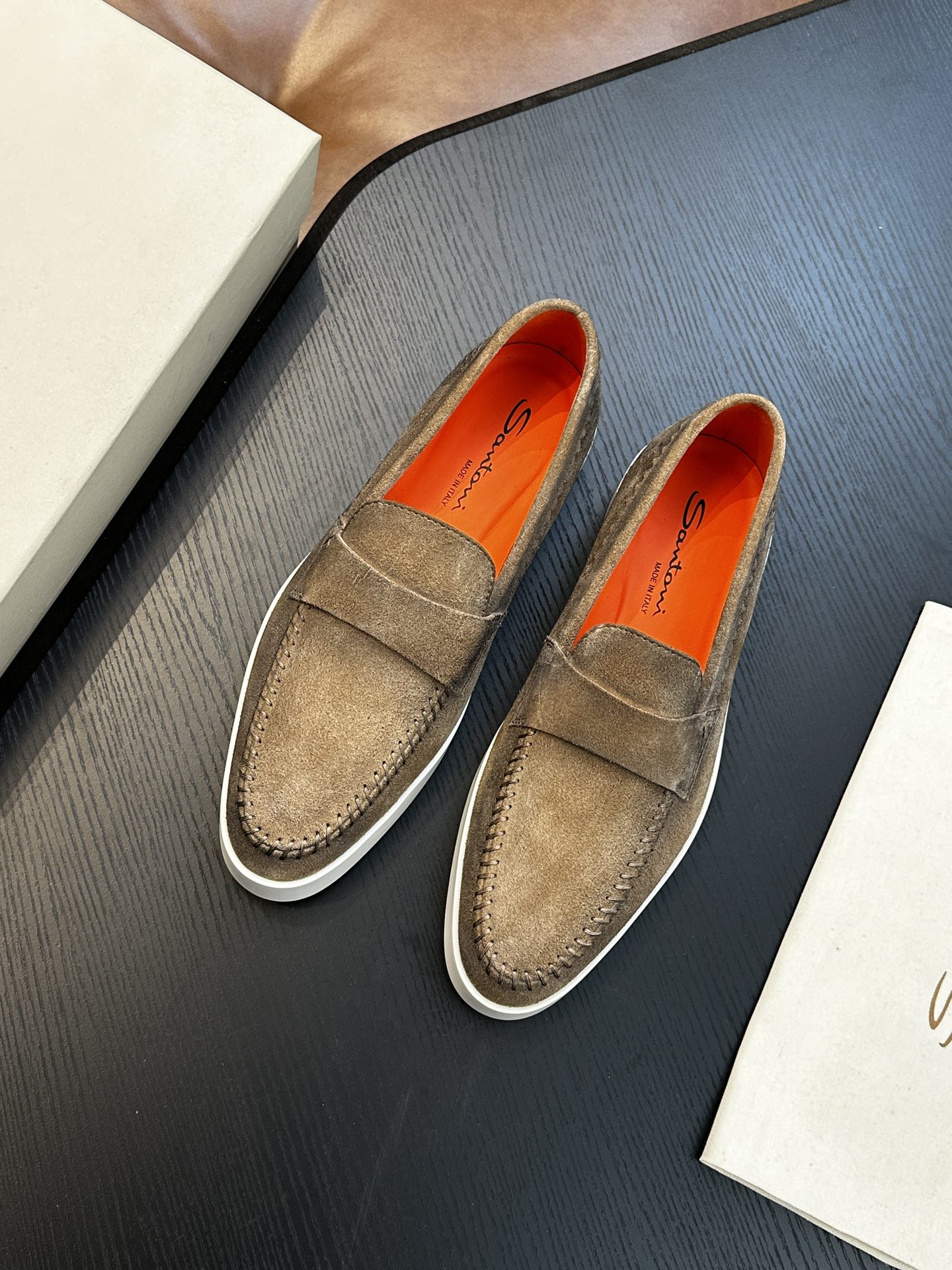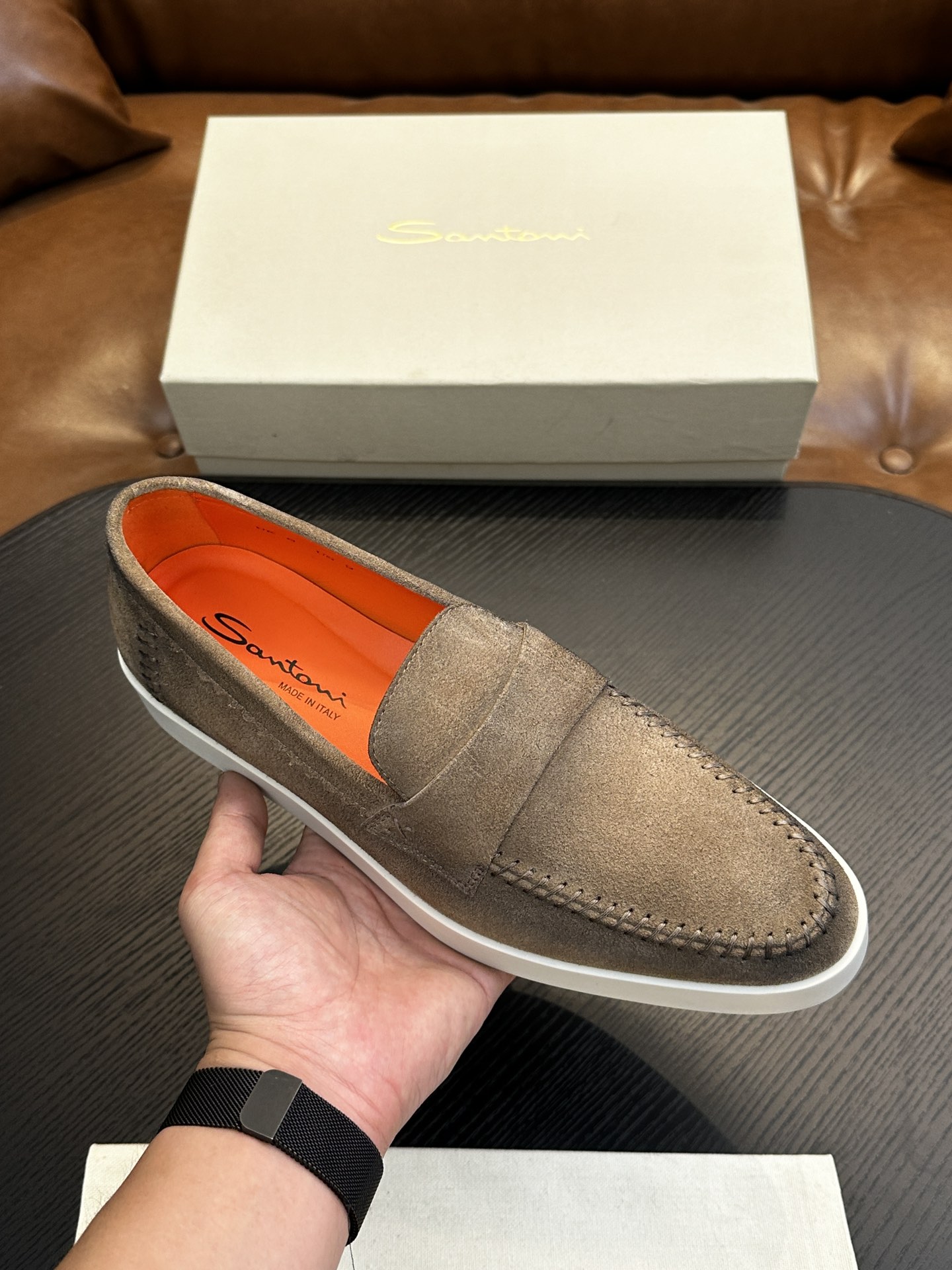 这款鞋子是AAAAA 1:1 质量 (非常棒). 使用了和原版一模一样的材料. 商标部分也保持了和Santoni一样. 图片拍摄是实物鞋子拍摄, 您所收到的实物保证和我们图片一模一样.