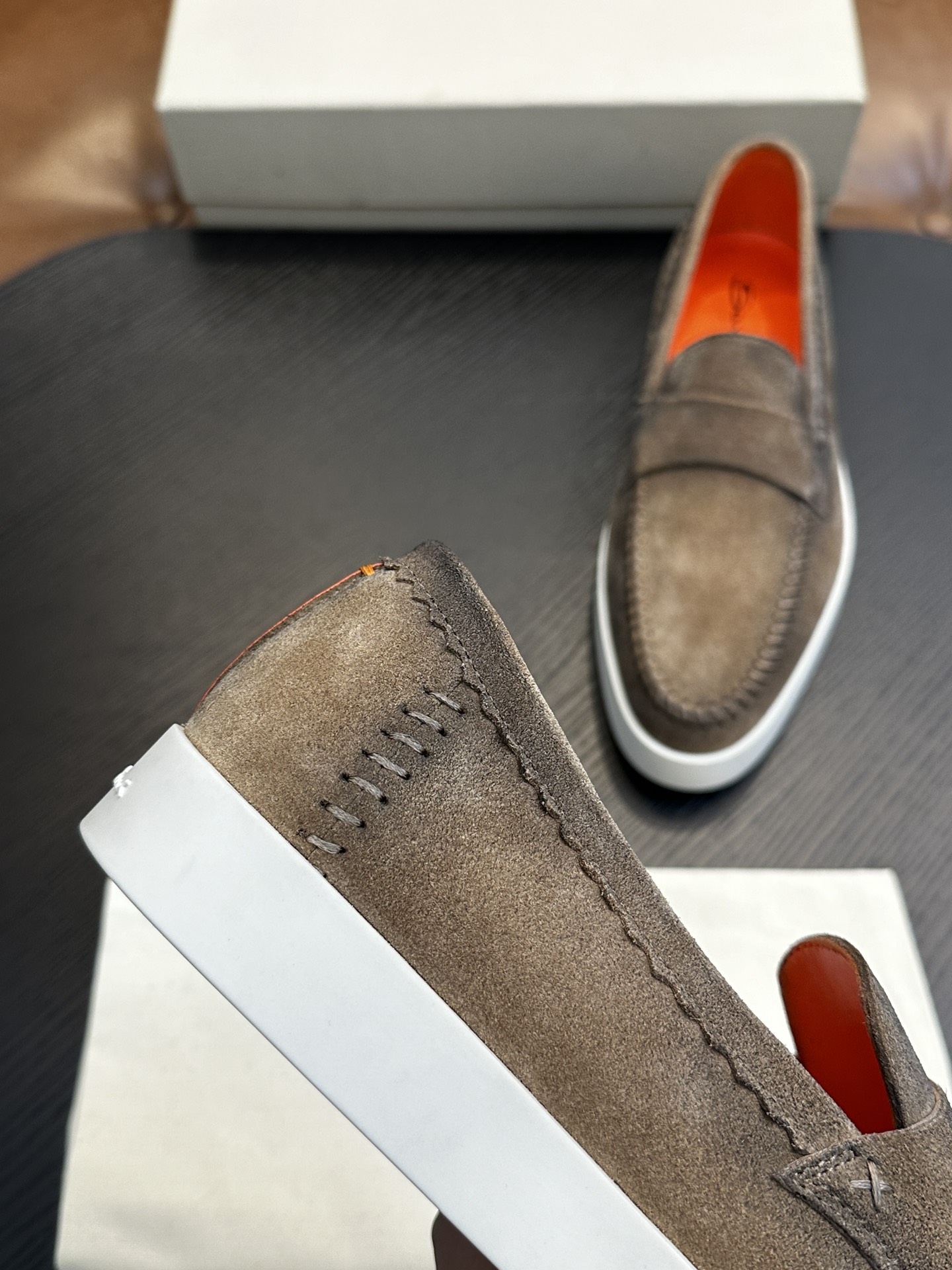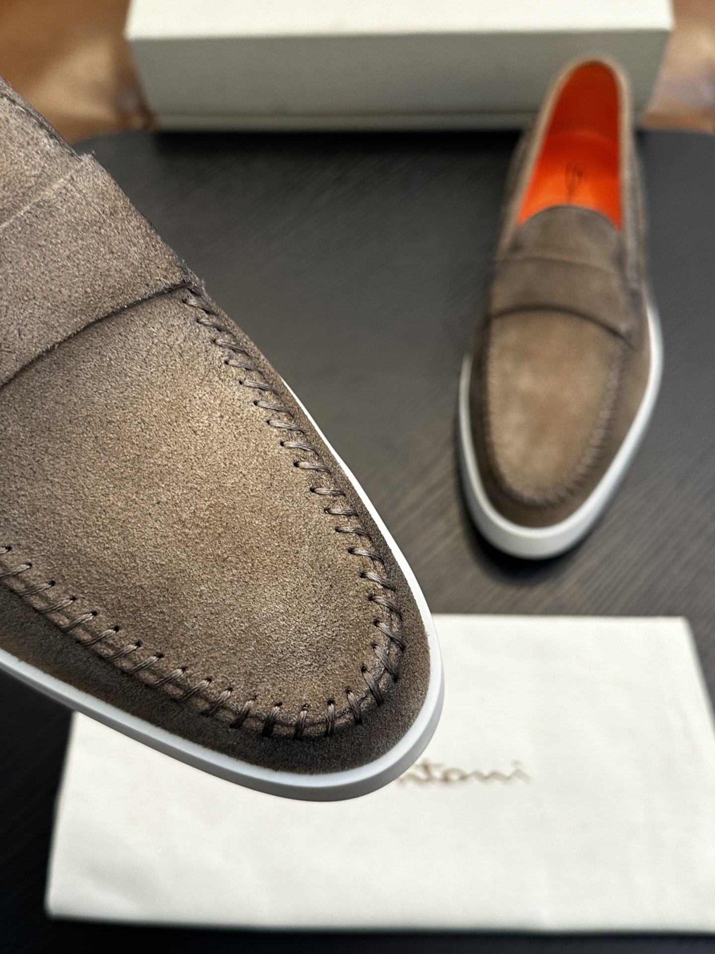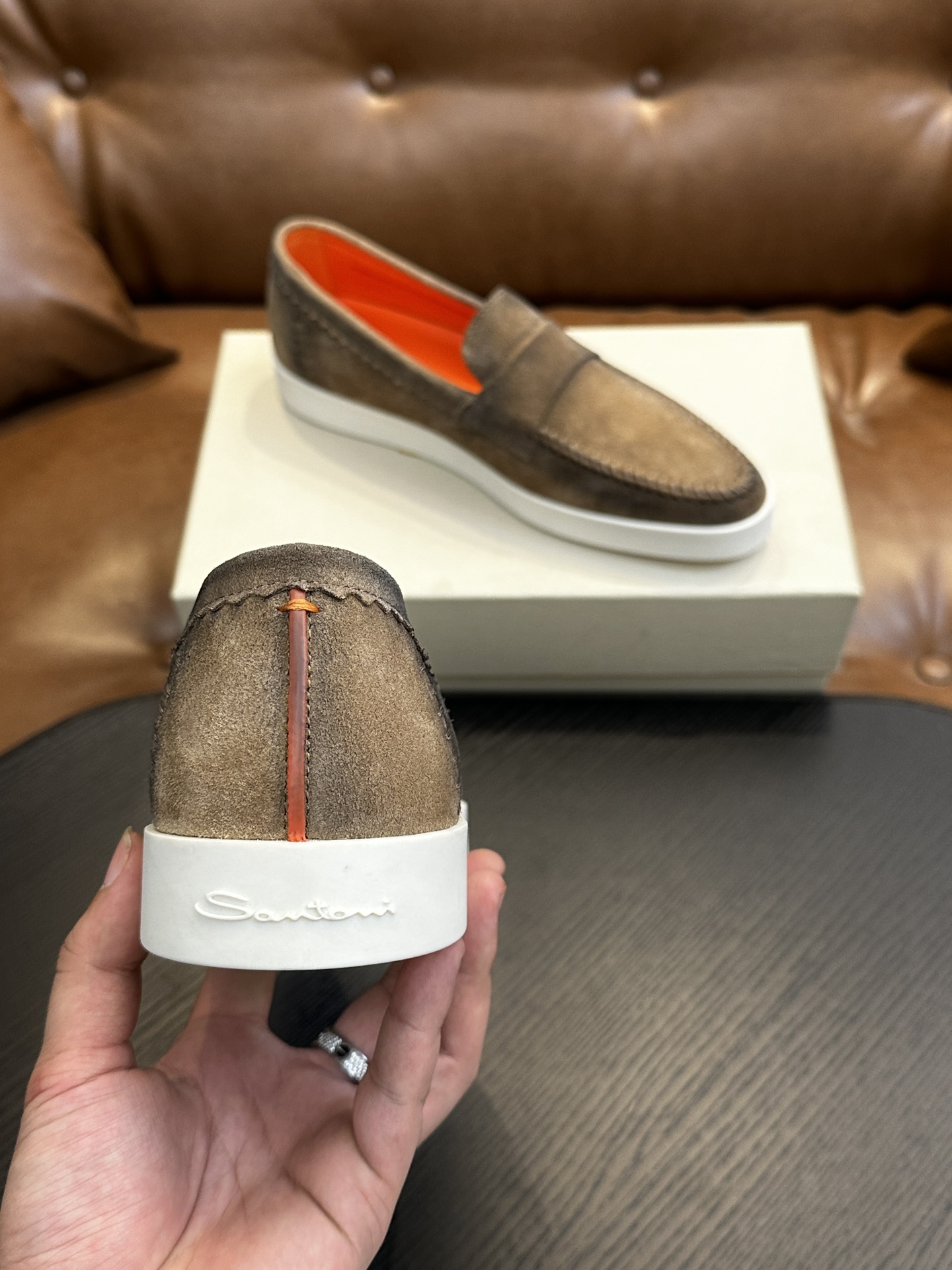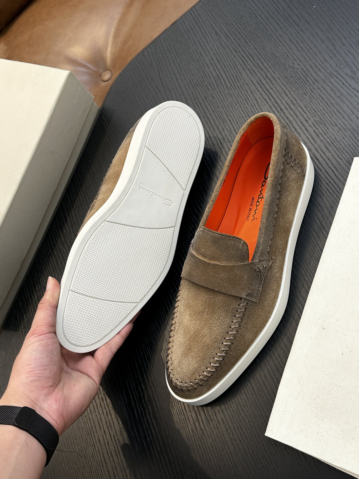 这款鞋子是AAAAA 1:1 质量 (非常棒). 使用了和原版一模一样的材料. 商标部分也保持了和Santoni一样. 图片拍摄是实物鞋子拍摄, 您所收到的实物保证和我们图片一模一样.