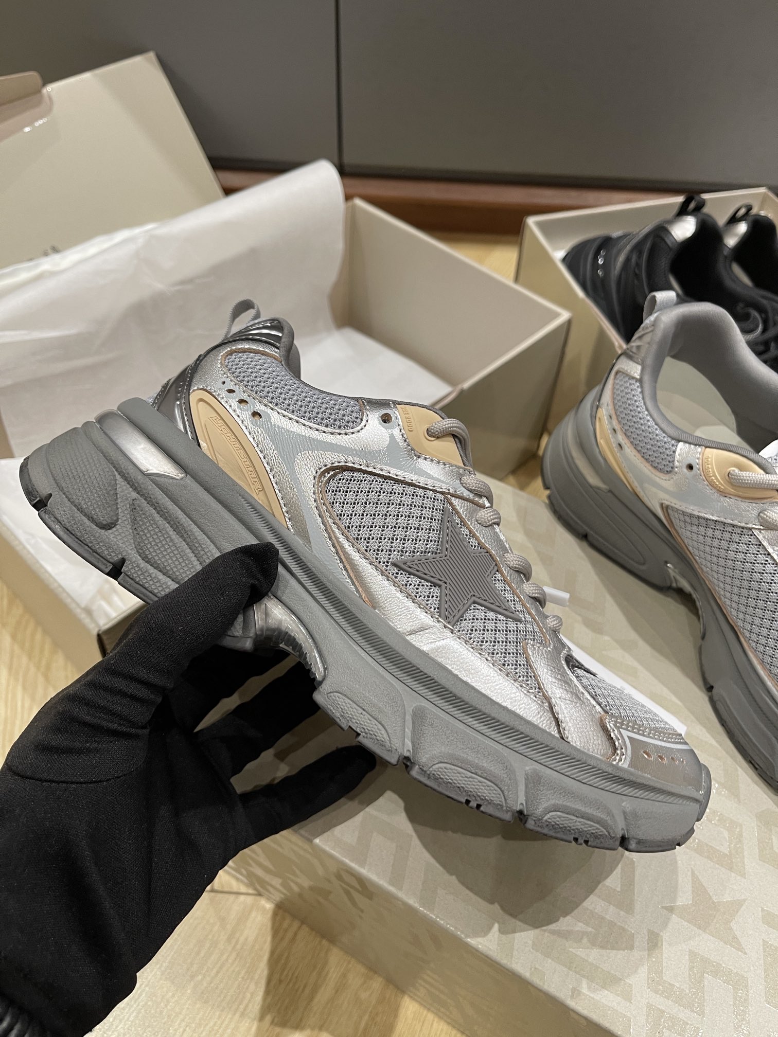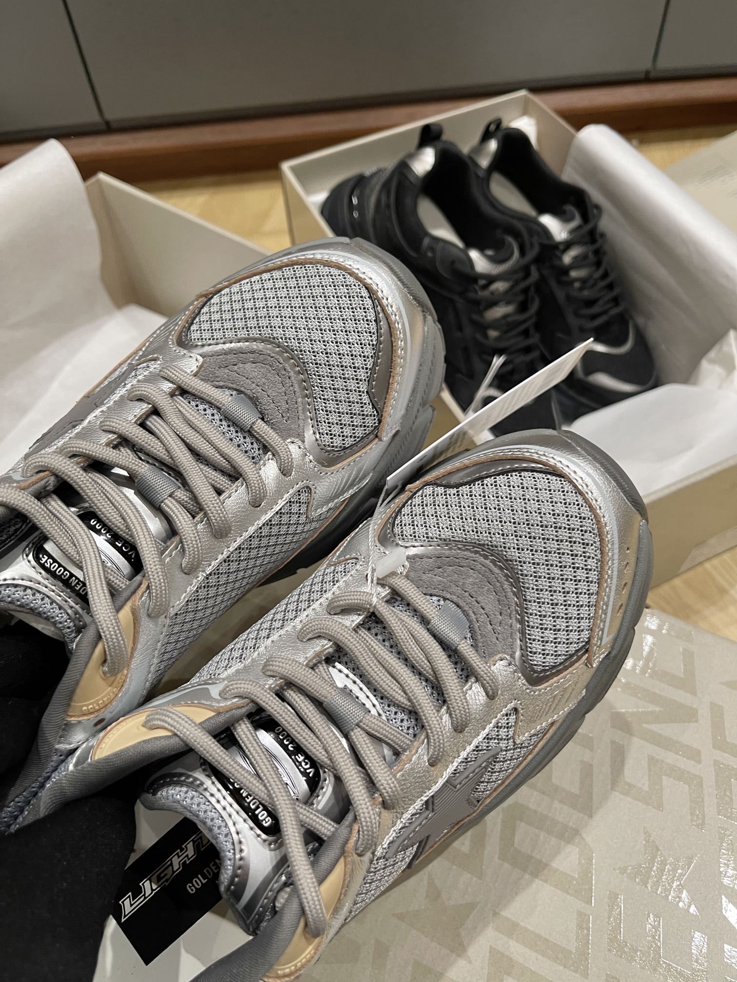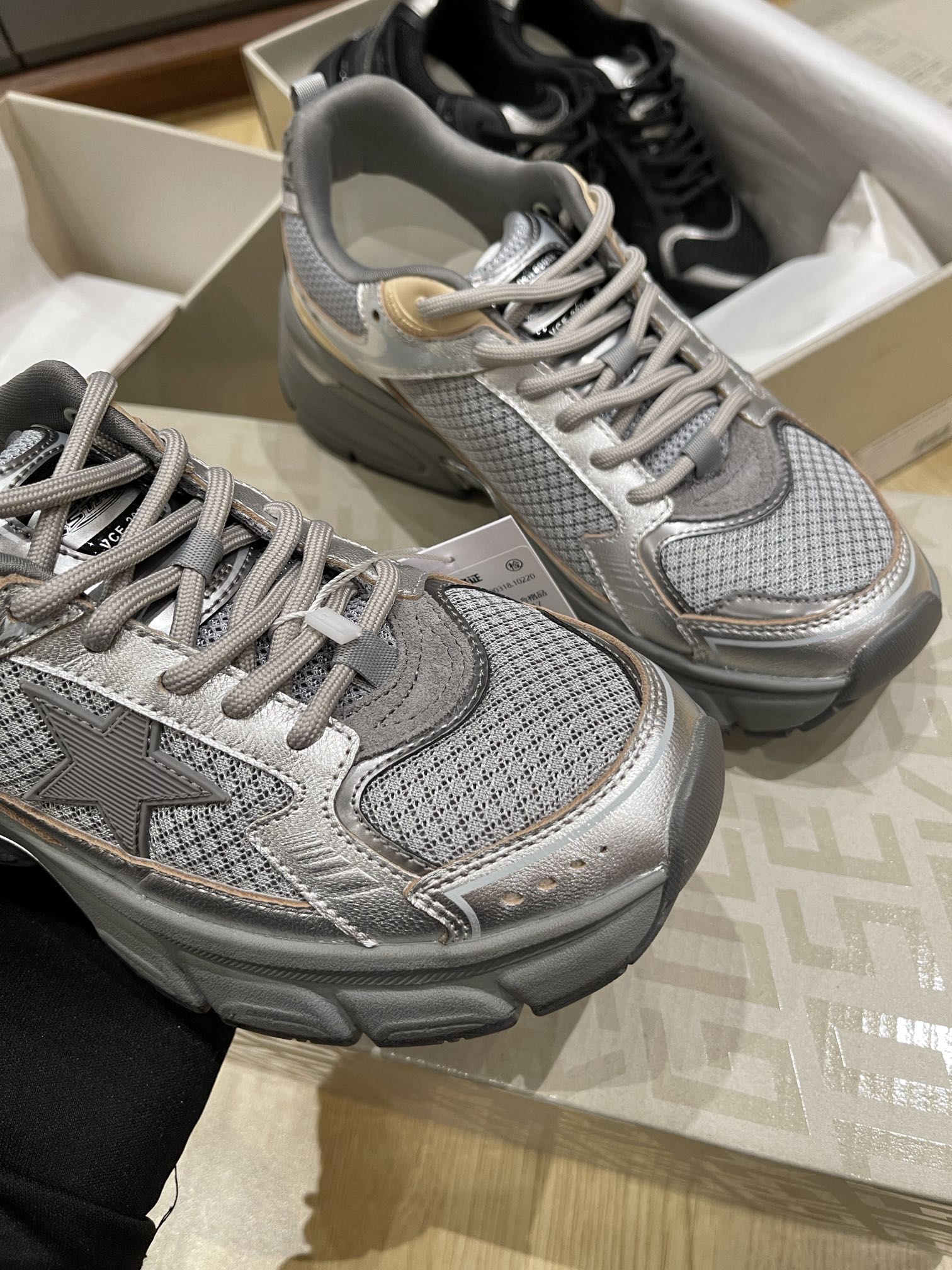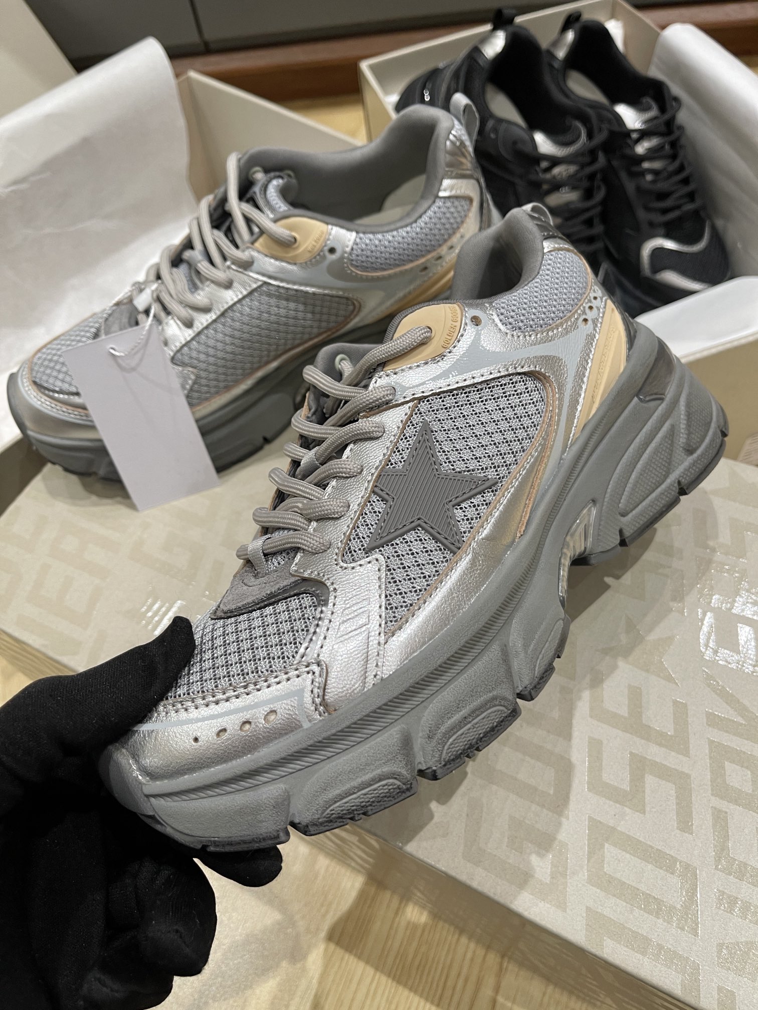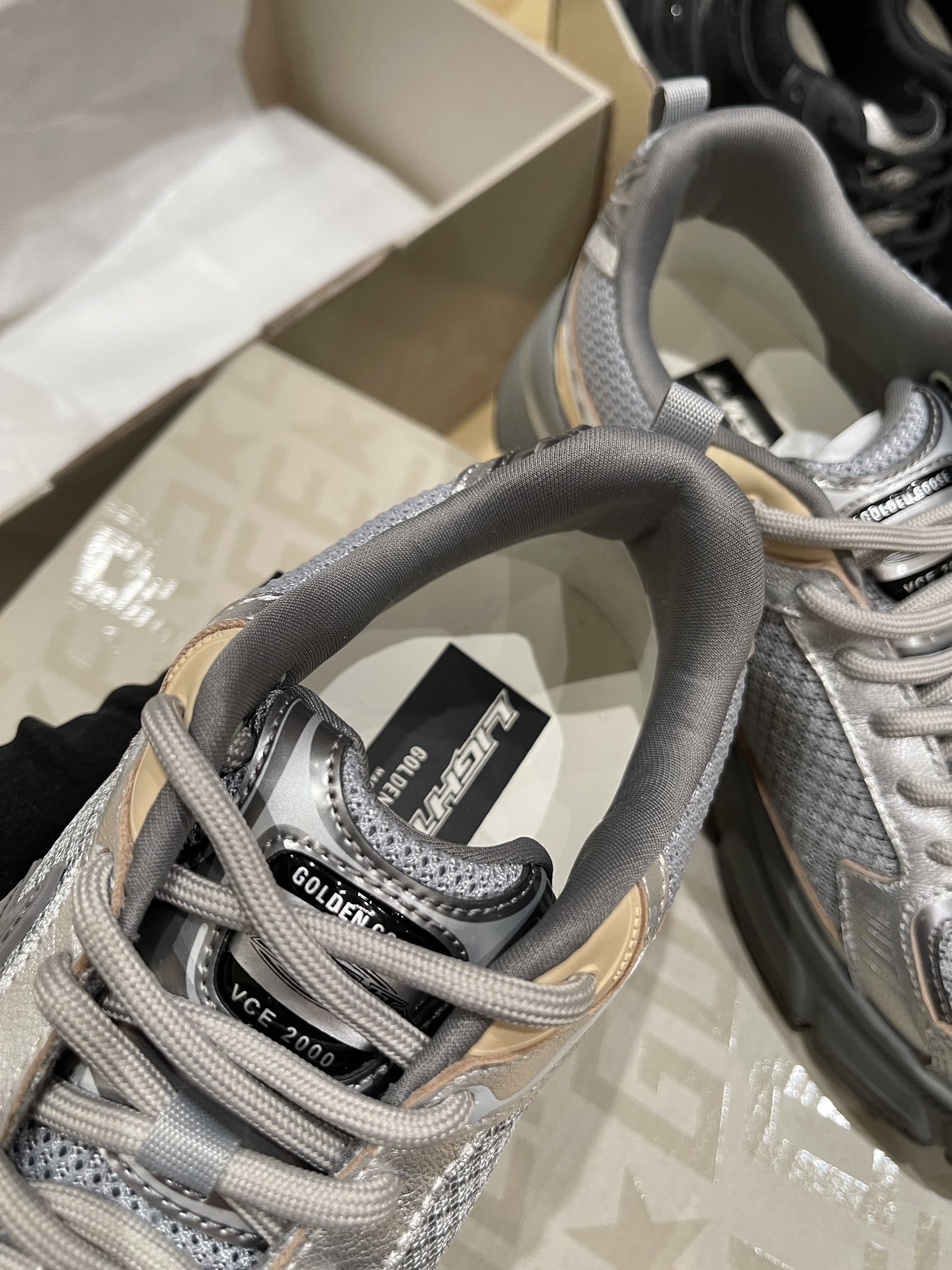 这款鞋子是AAAAA 1:1 质量 (非常棒). 使用了和原版一模一样的材料. 商标部分也保持了和Golden Goose一样. 图片拍摄是实物鞋子拍摄, 您所收到的实物保证和我们图片一模一样.