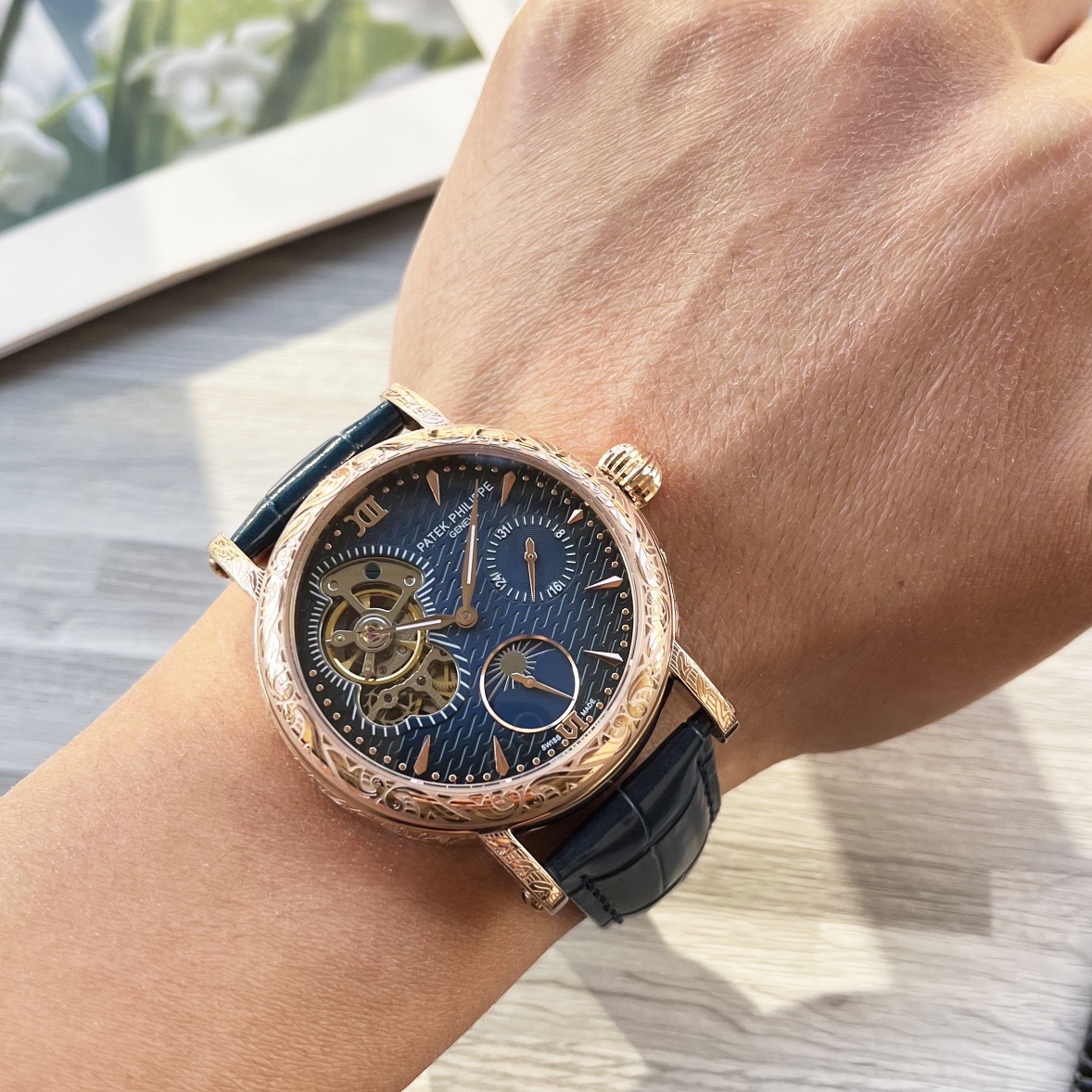 这款手表是AAAAA 1:1 质量 (非常棒). 使用了和原版一模一样的材料. 商标部分也保持了和百达翡丽/Patek Philippe一样. 图片拍摄是实物手表拍摄, 您所收到的实物保证和我们图片一模一样.