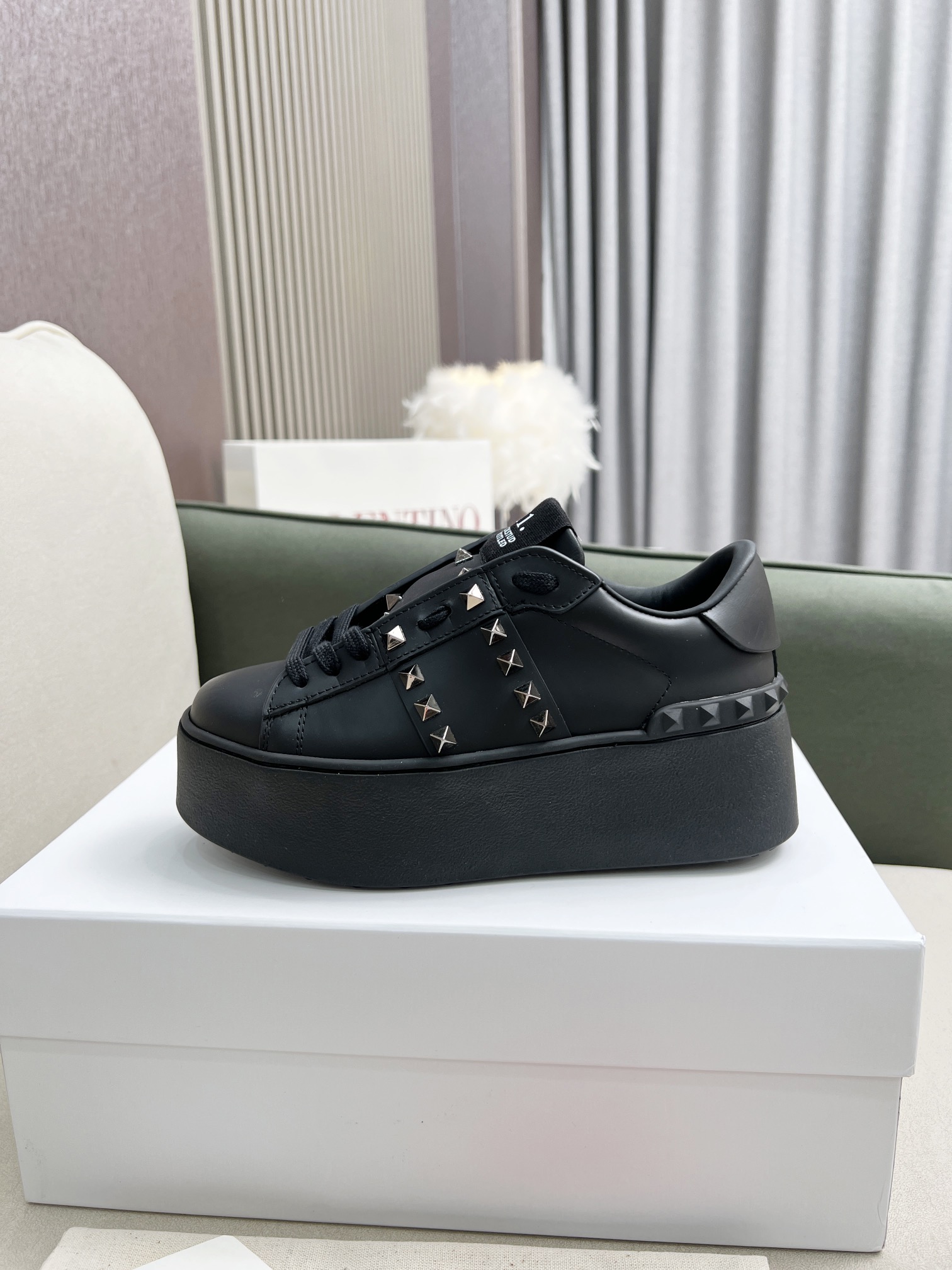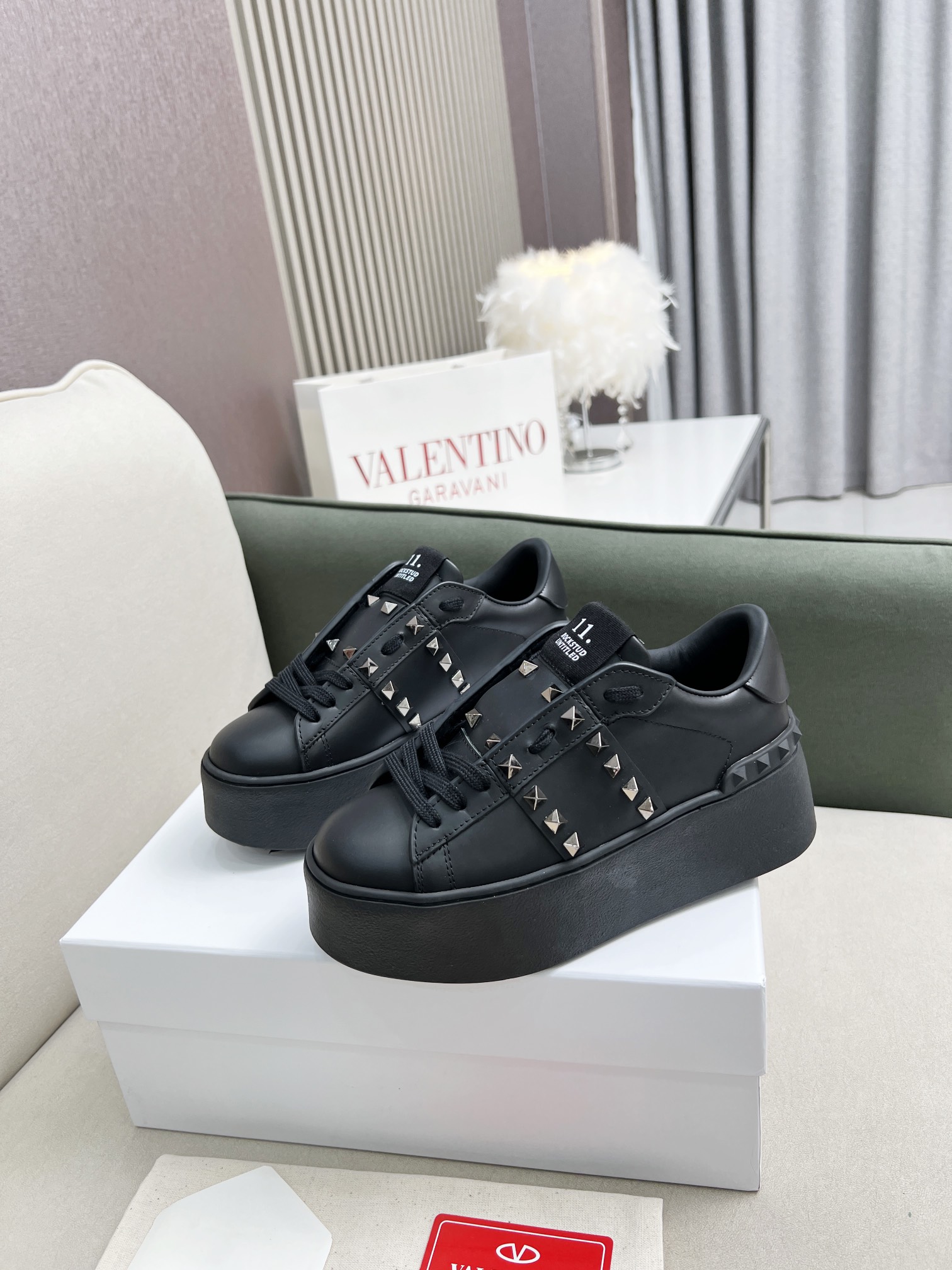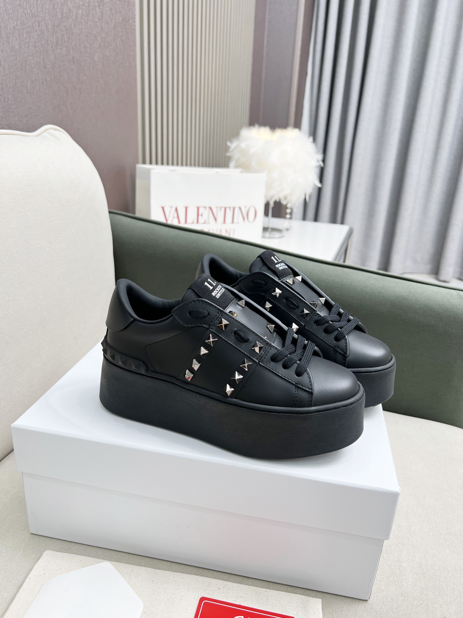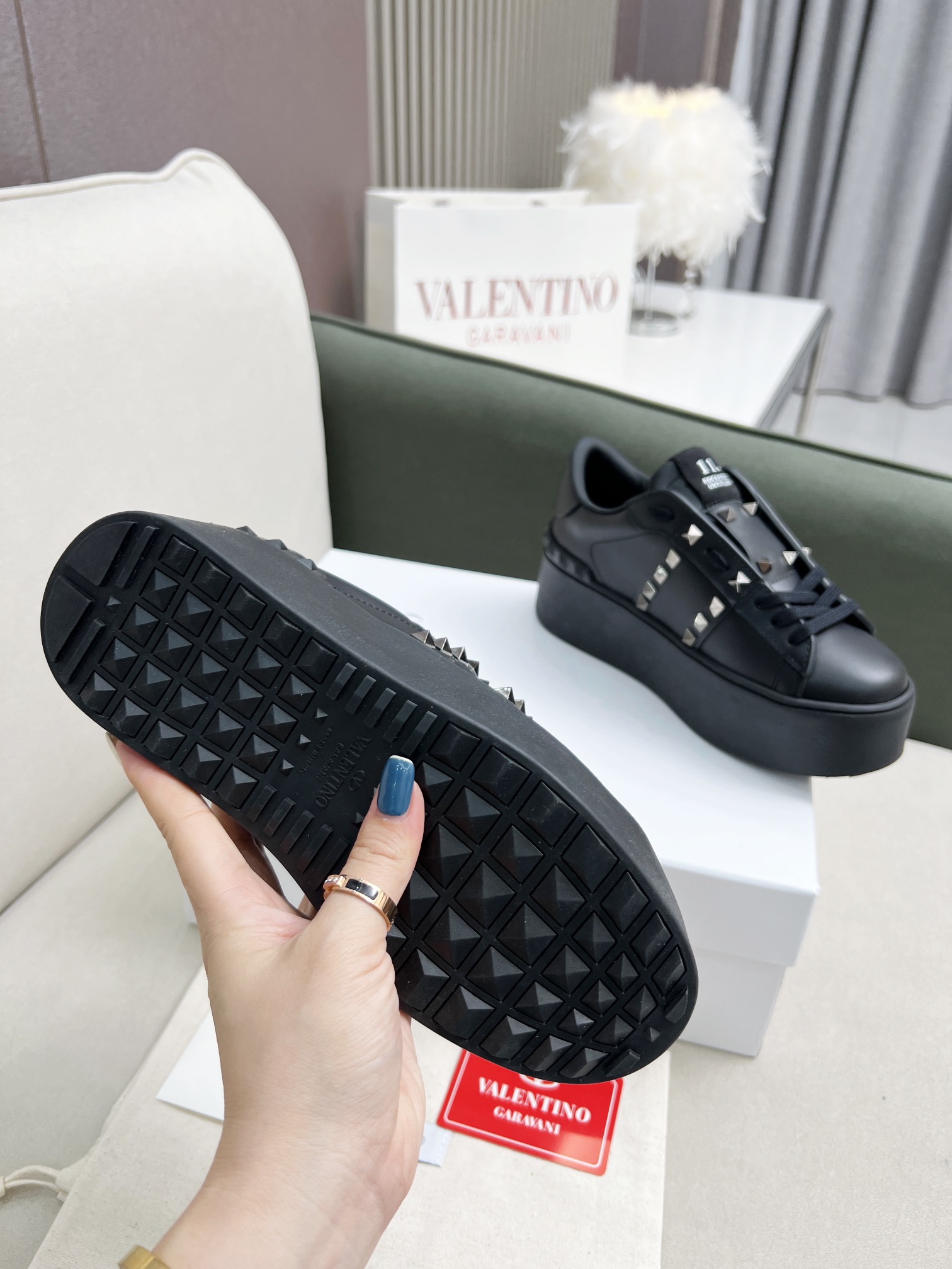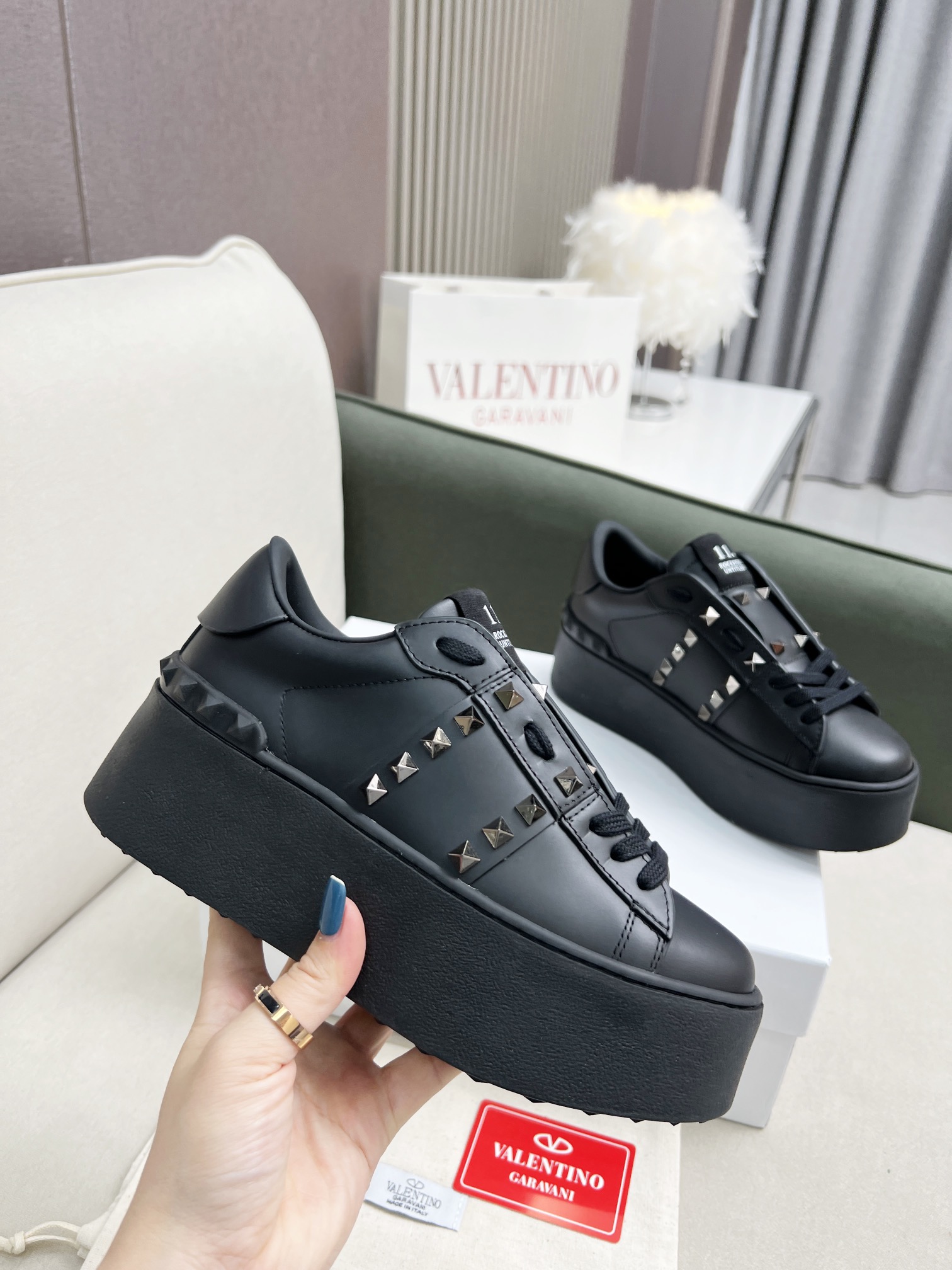 这款鞋子是AAAAA 1:1 质量 (非常棒). 使用了和原版一模一样的材料. 商标部分也保持了和华伦天奴/Valentino一样. 图片拍摄是实物鞋子拍摄, 您所收到的实物保证和我们图片一模一样.
