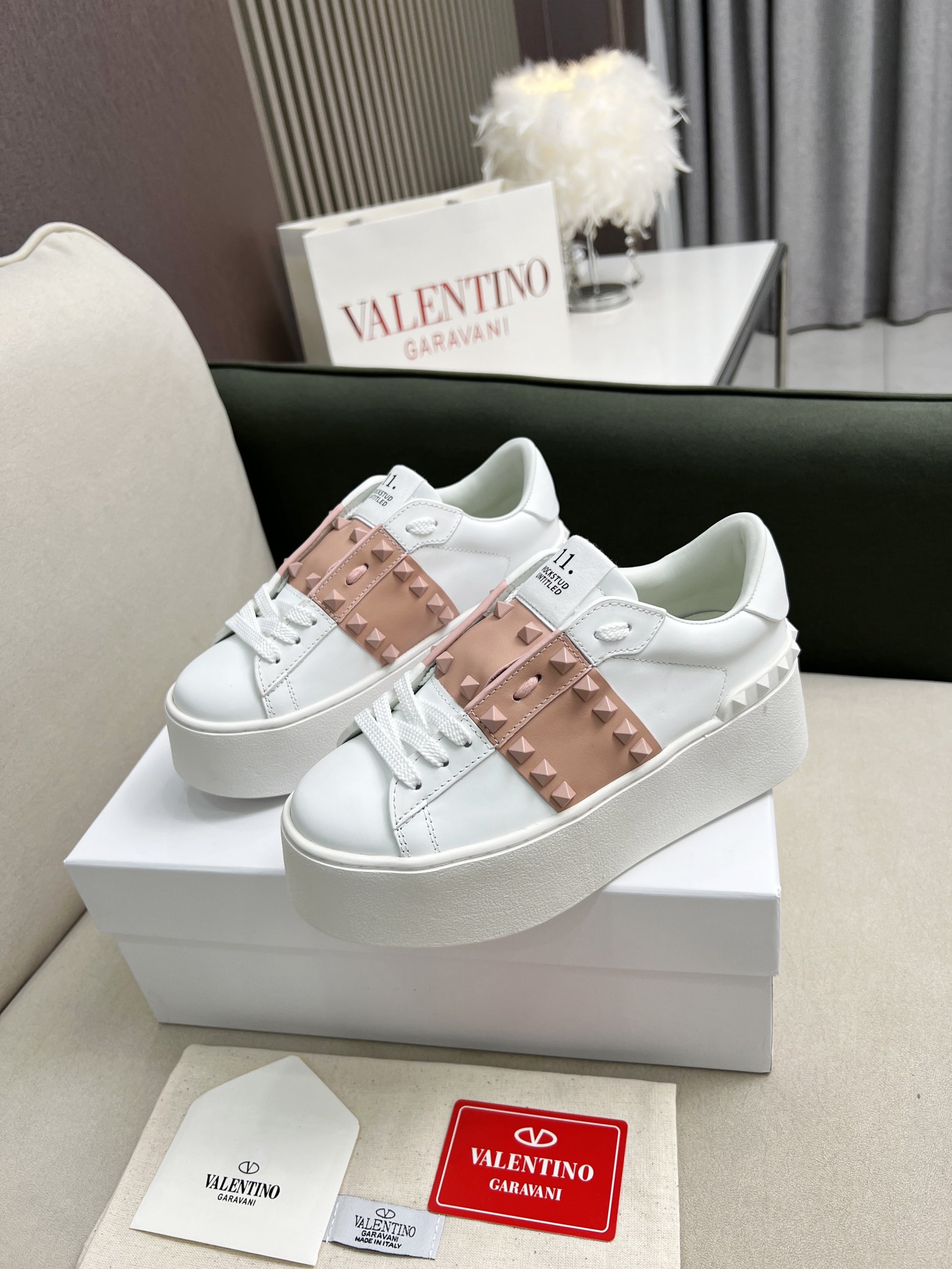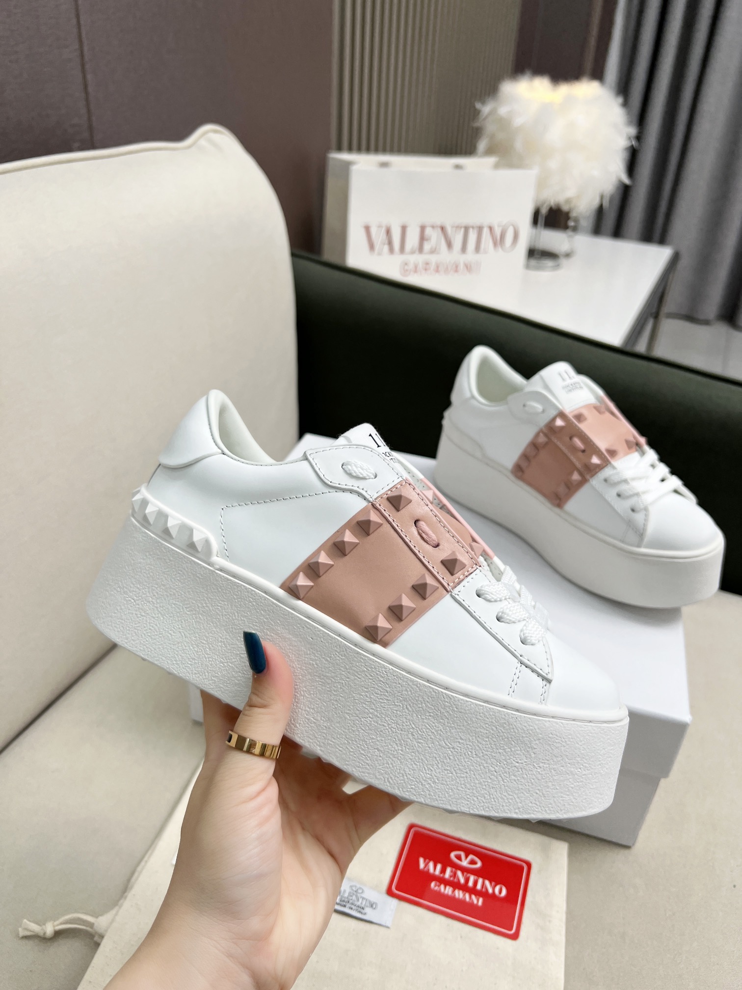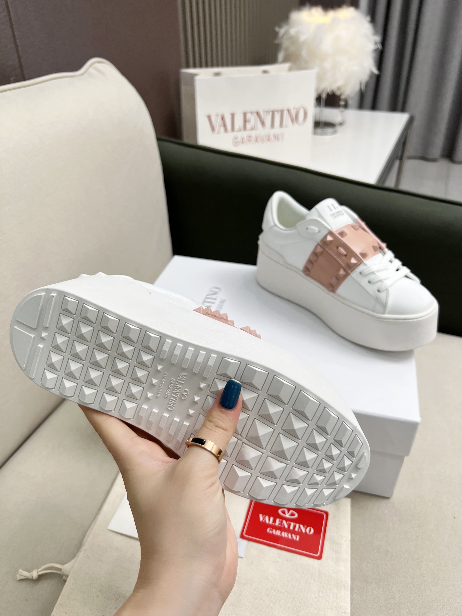 这款鞋子是AAAAA 1:1 质量 (非常棒). 使用了和原版一模一样的材料. 商标部分也保持了和华伦天奴/Valentino一样. 图片拍摄是实物鞋子拍摄, 您所收到的实物保证和我们图片一模一样.