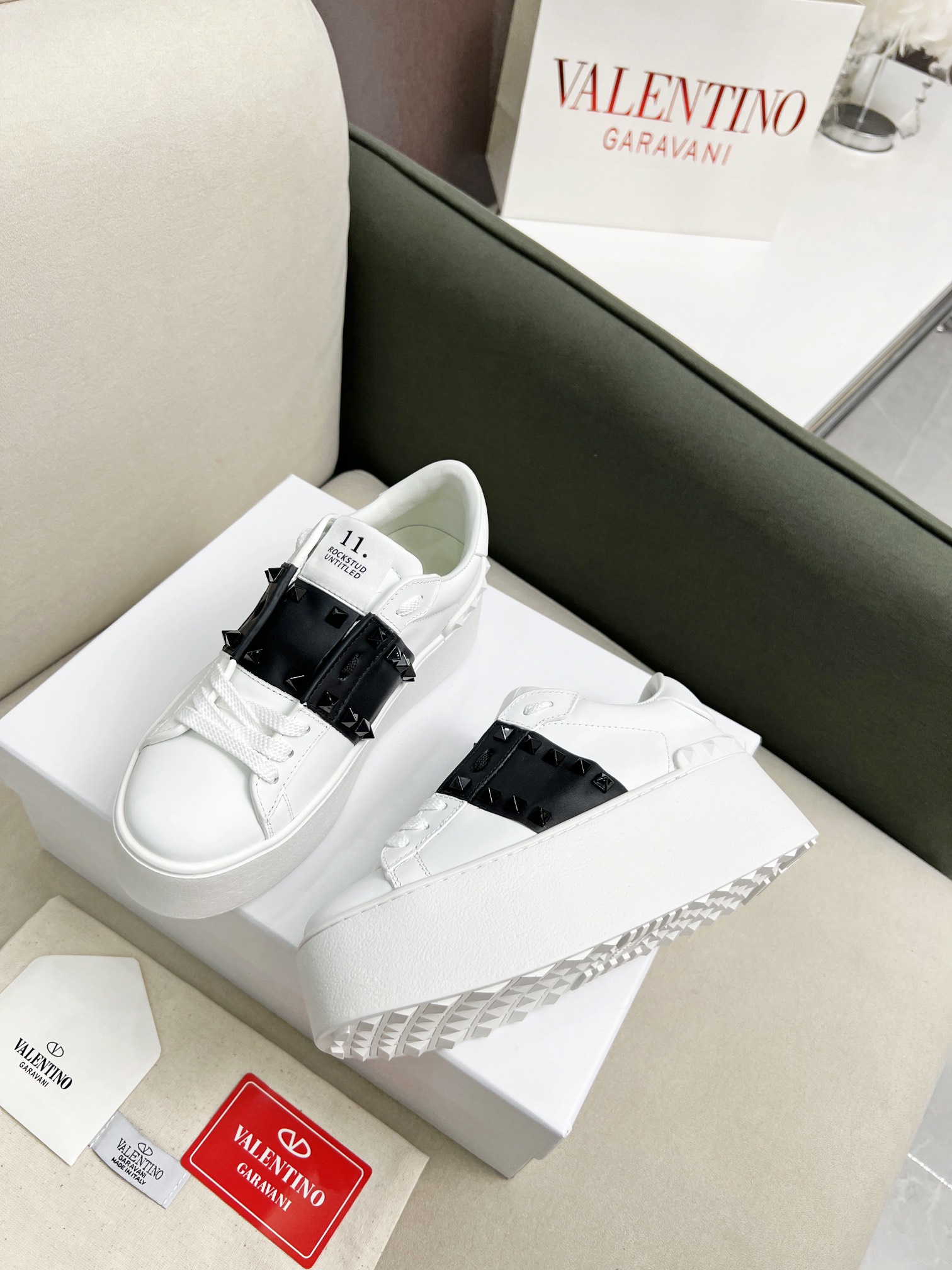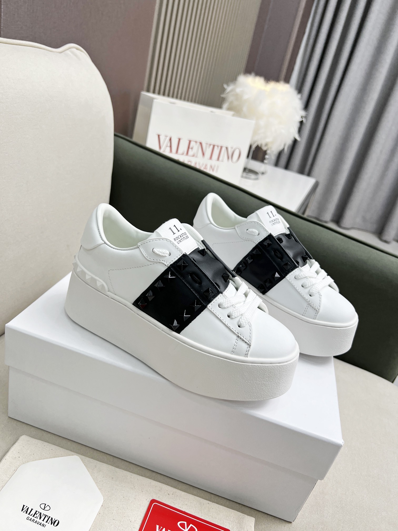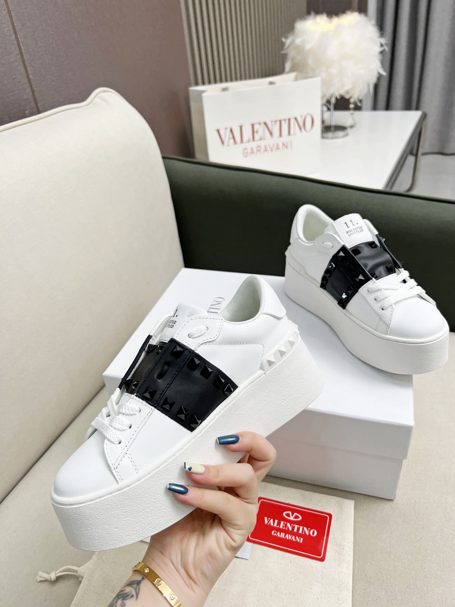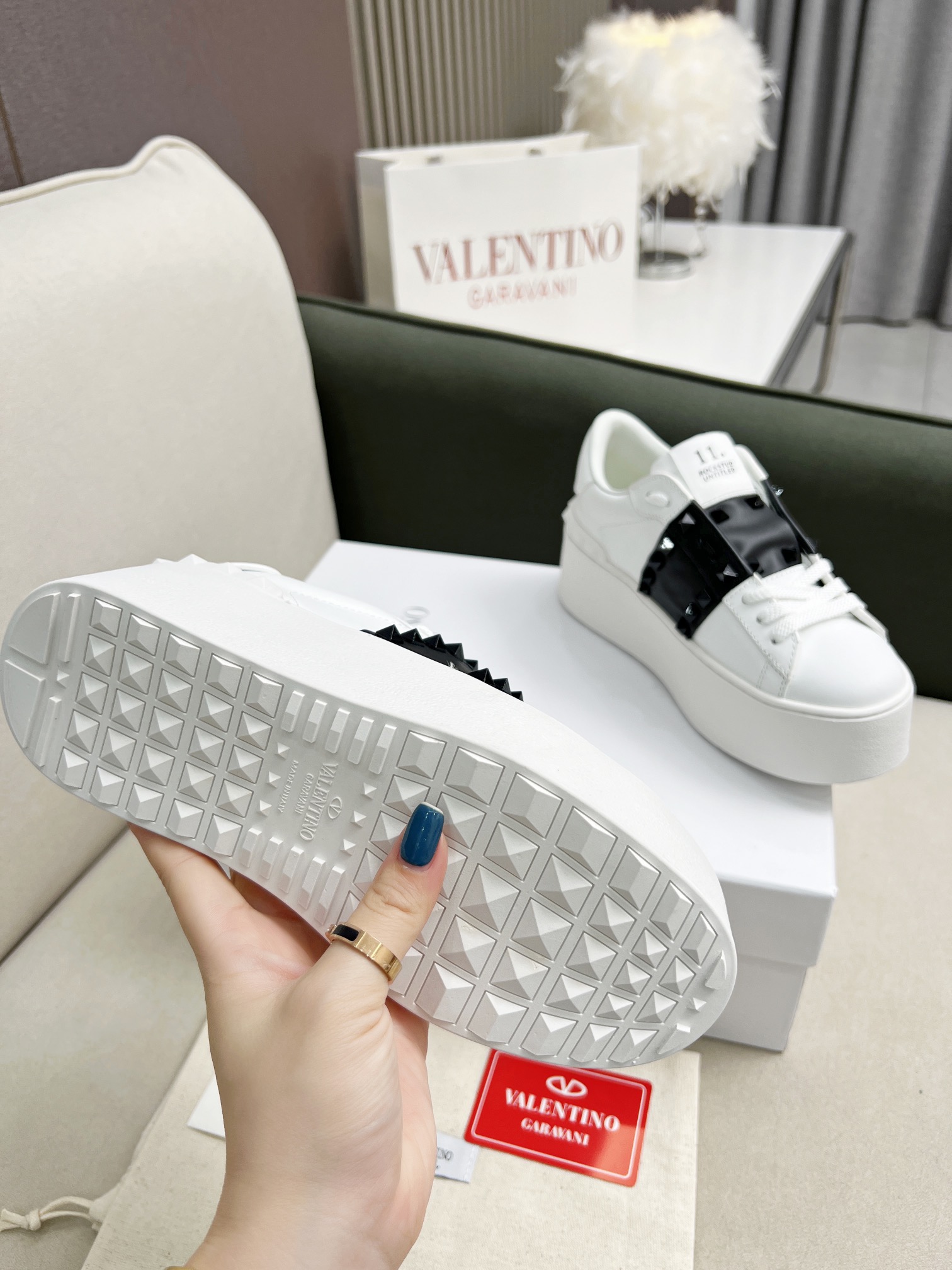 这款鞋子是AAAAA 1:1 质量 (非常棒). 使用了和原版一模一样的材料. 商标部分也保持了和华伦天奴/Valentino一样. 图片拍摄是实物鞋子拍摄, 您所收到的实物保证和我们图片一模一样.