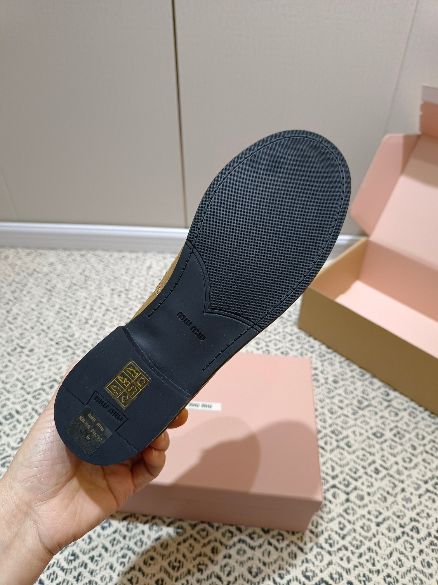 这款鞋子是AAAAA 1:1 质量 (非常棒). 使用了和原版一模一样的材料. 商标部分也保持了和缪缪/Miu Miu一样. 图片拍摄是实物鞋子拍摄, 您所收到的实物保证和我们图片一模一样.
