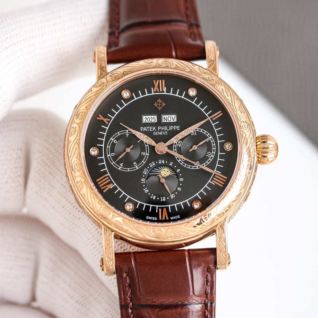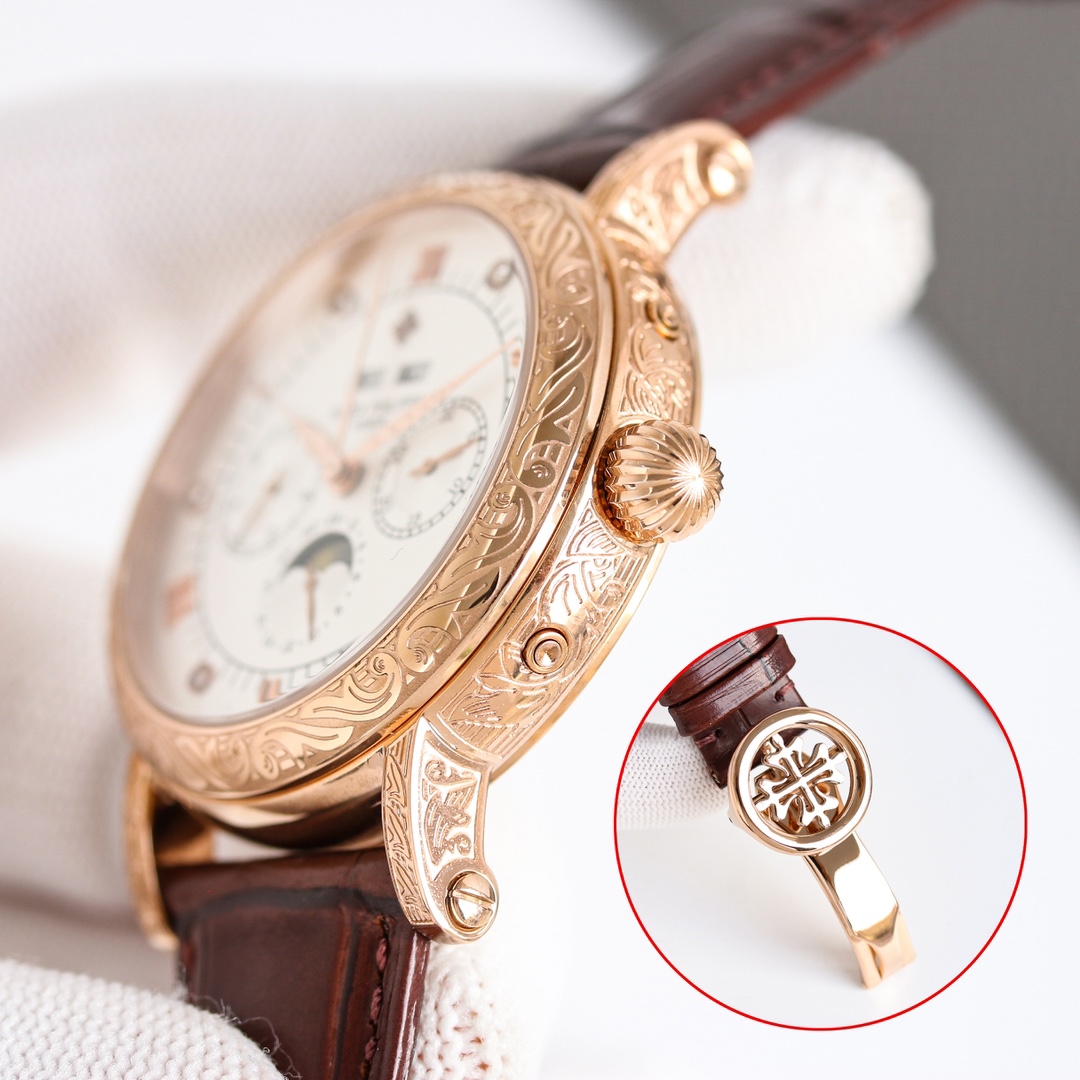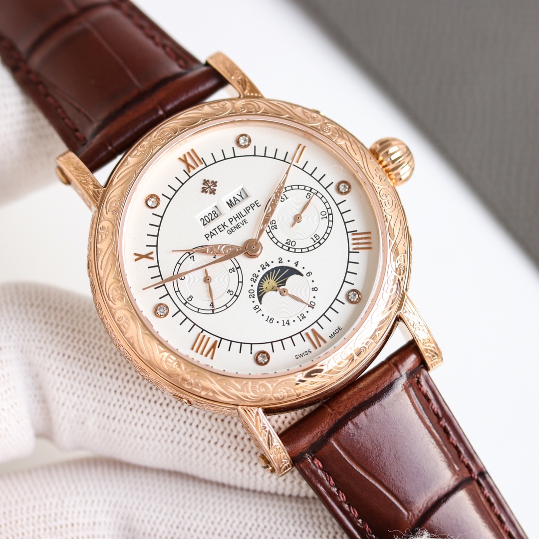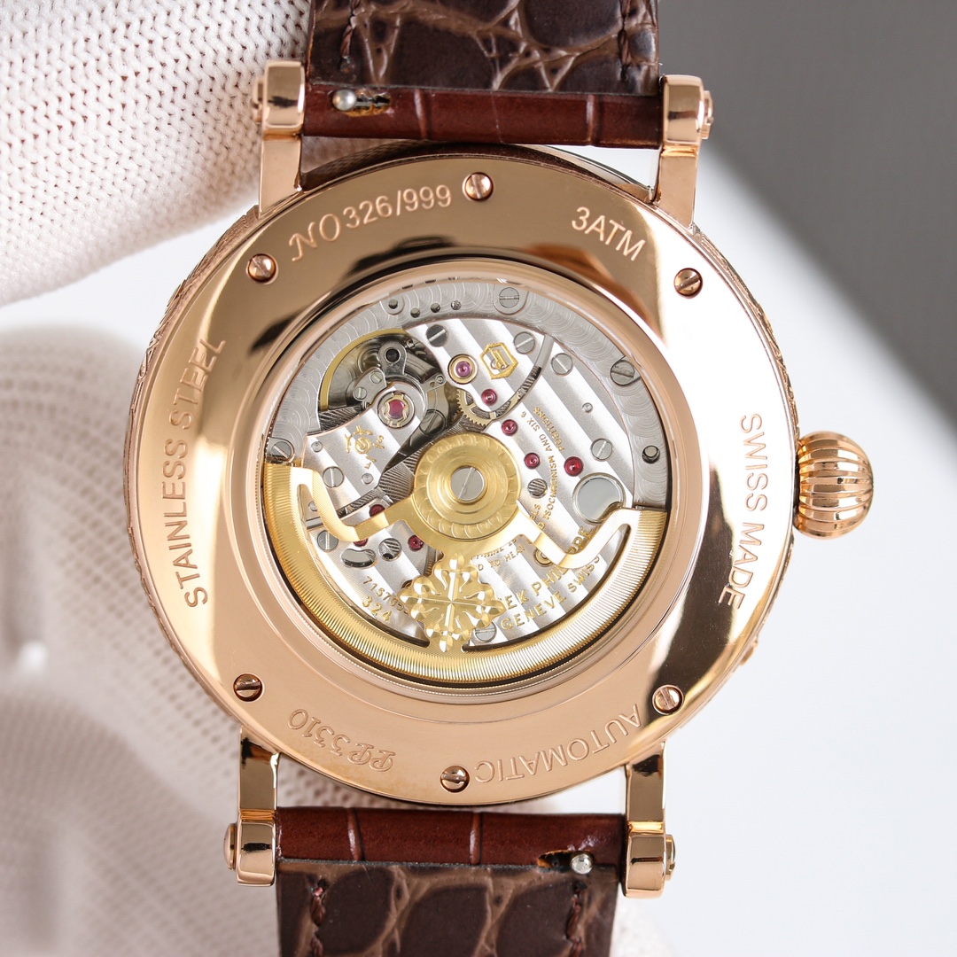 这款手表是AAAAA 1:1 质量 (非常棒). 使用了和原版一模一样的材料. 商标部分也保持了和百达翡丽/Patek Philippe一样. 图片拍摄是实物手表拍摄, 您所收到的实物保证和我们图片一模一样.