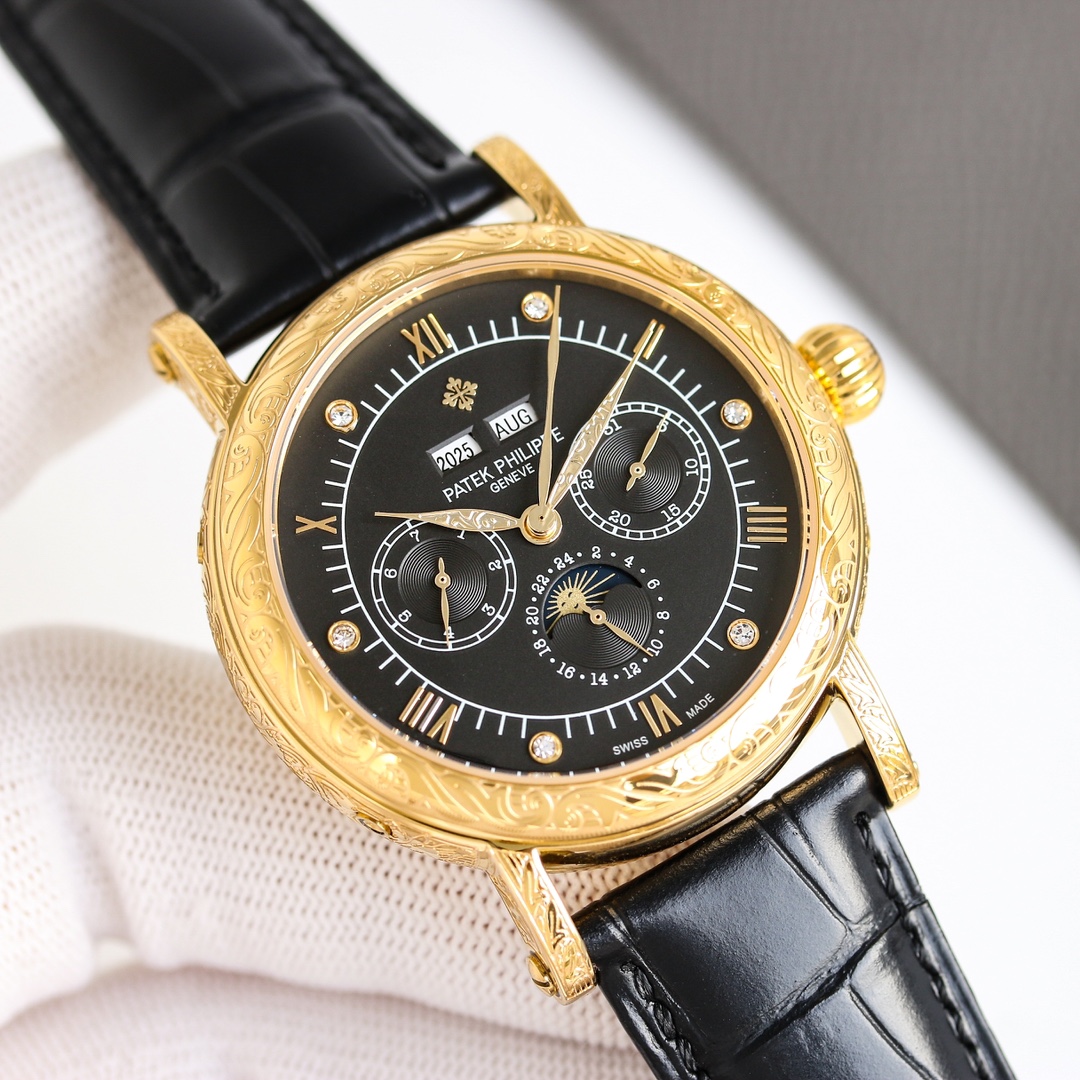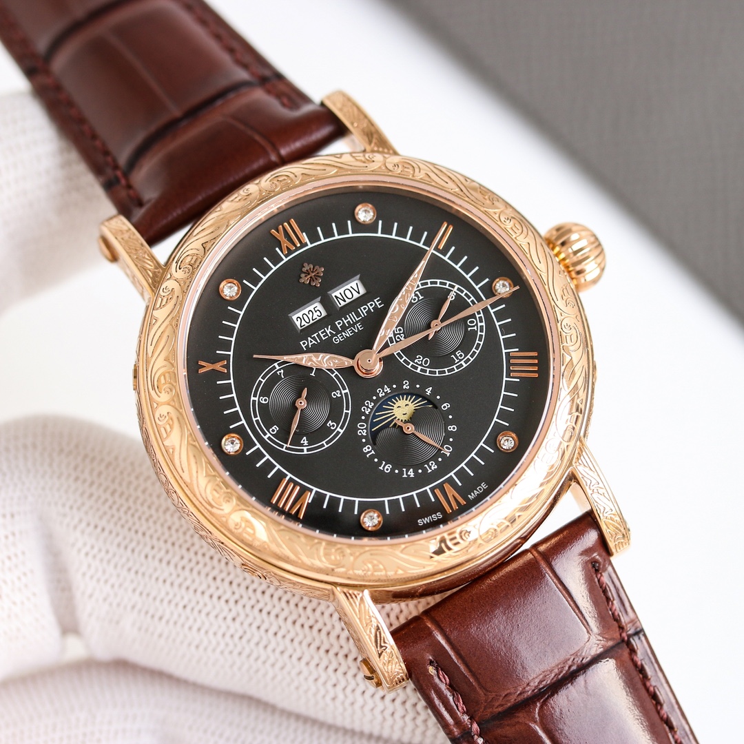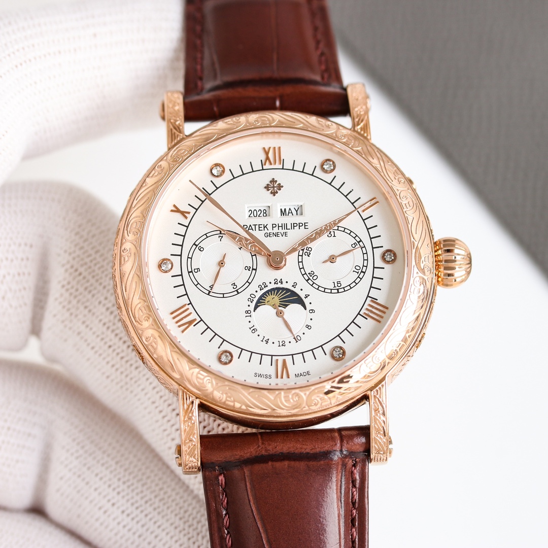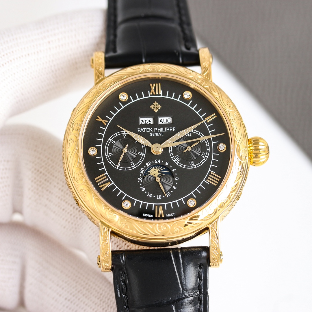 这款手表是AAAAA 1:1 质量 (非常棒). 使用了和原版一模一样的材料. 商标部分也保持了和百达翡丽/Patek Philippe一样. 图片拍摄是实物手表拍摄, 您所收到的实物保证和我们图片一模一样.
