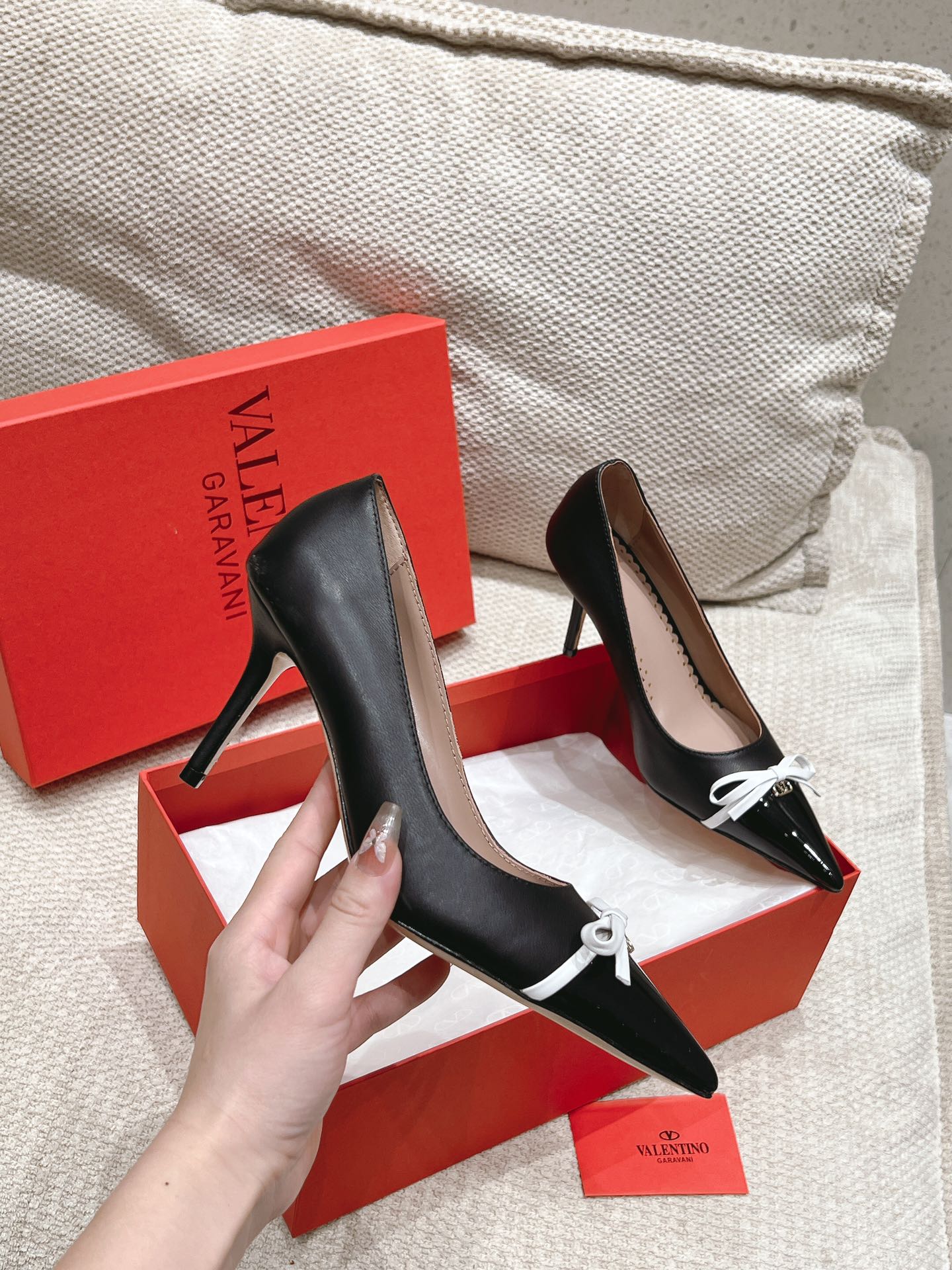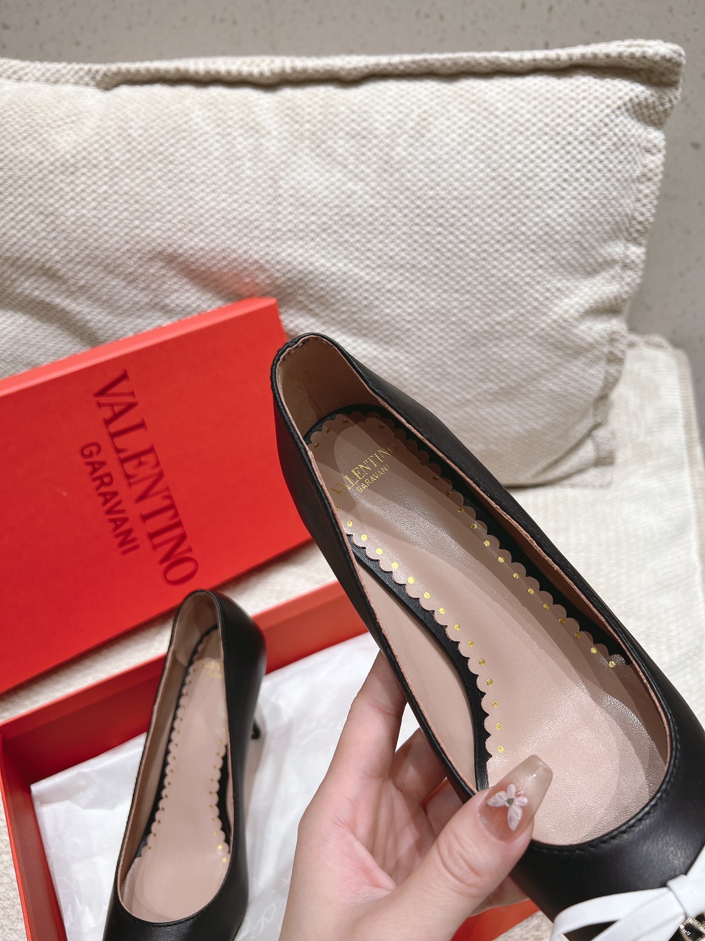 这款鞋子是AAAAA 1:1 质量 (非常棒). 使用了和原版一模一样的材料. 商标部分也保持了和华伦天奴/Valentino一样. 图片拍摄是实物鞋子拍摄, 您所收到的实物保证和我们图片一模一样.