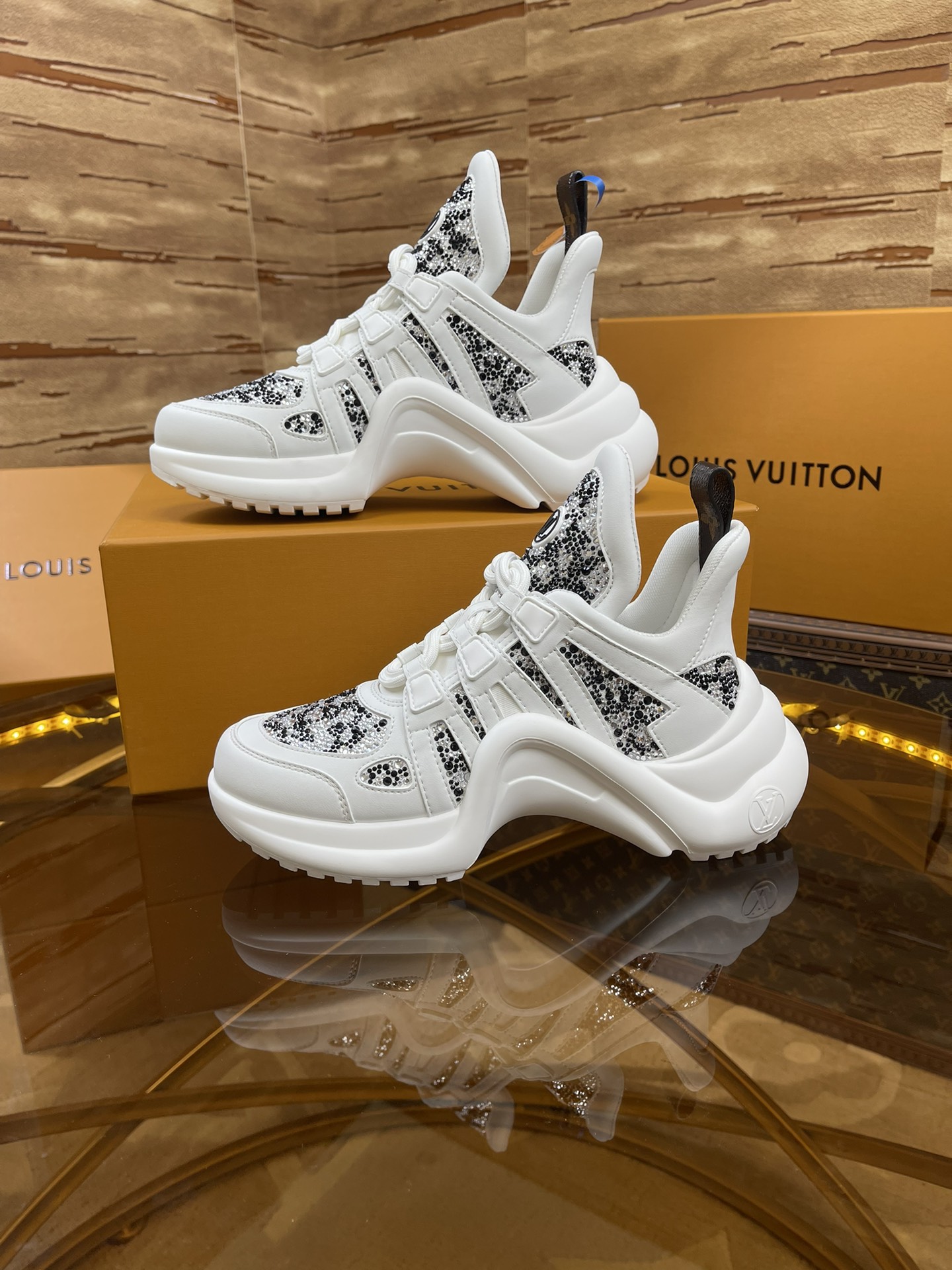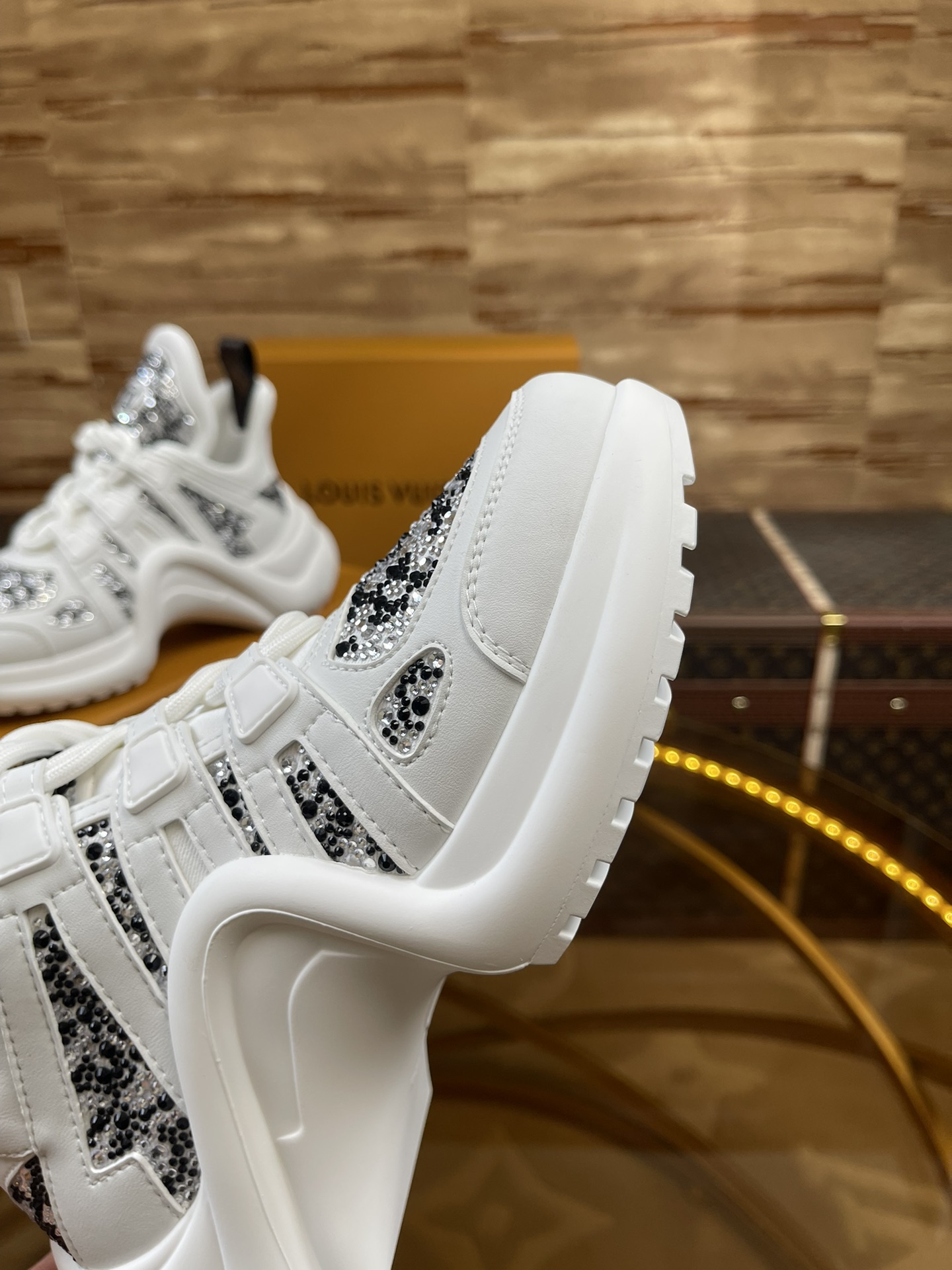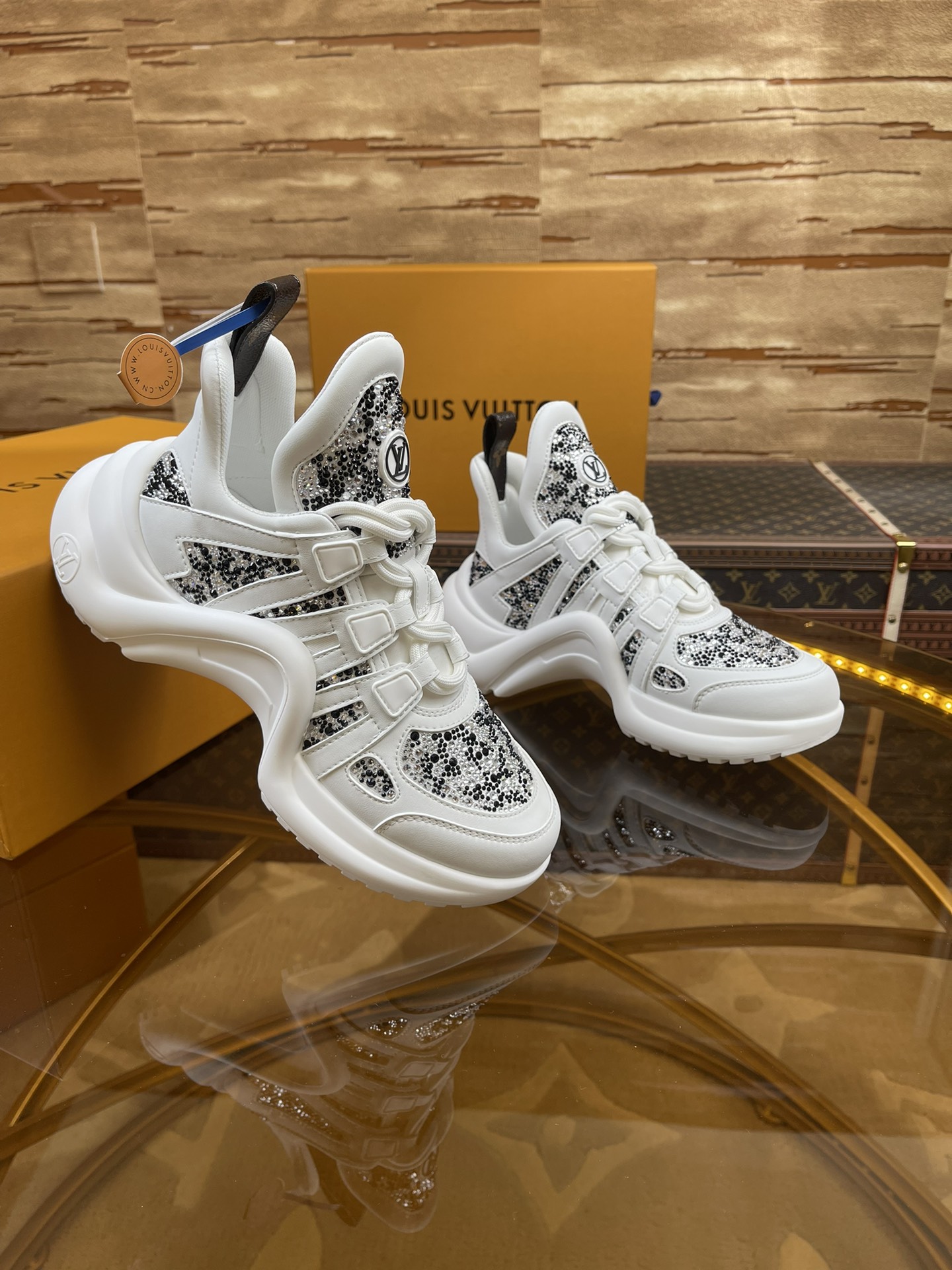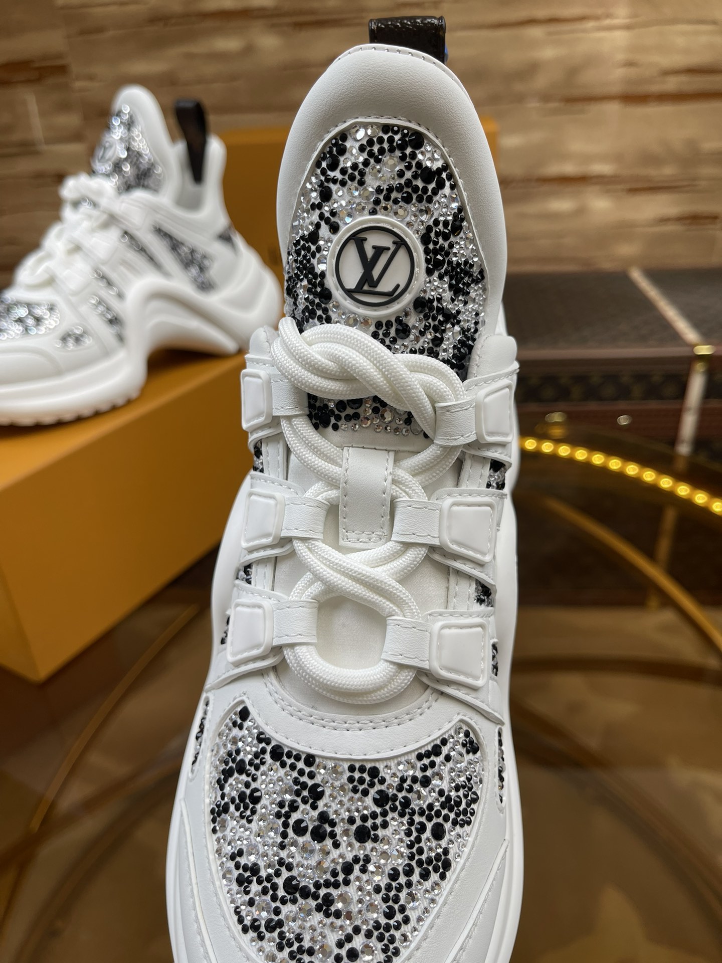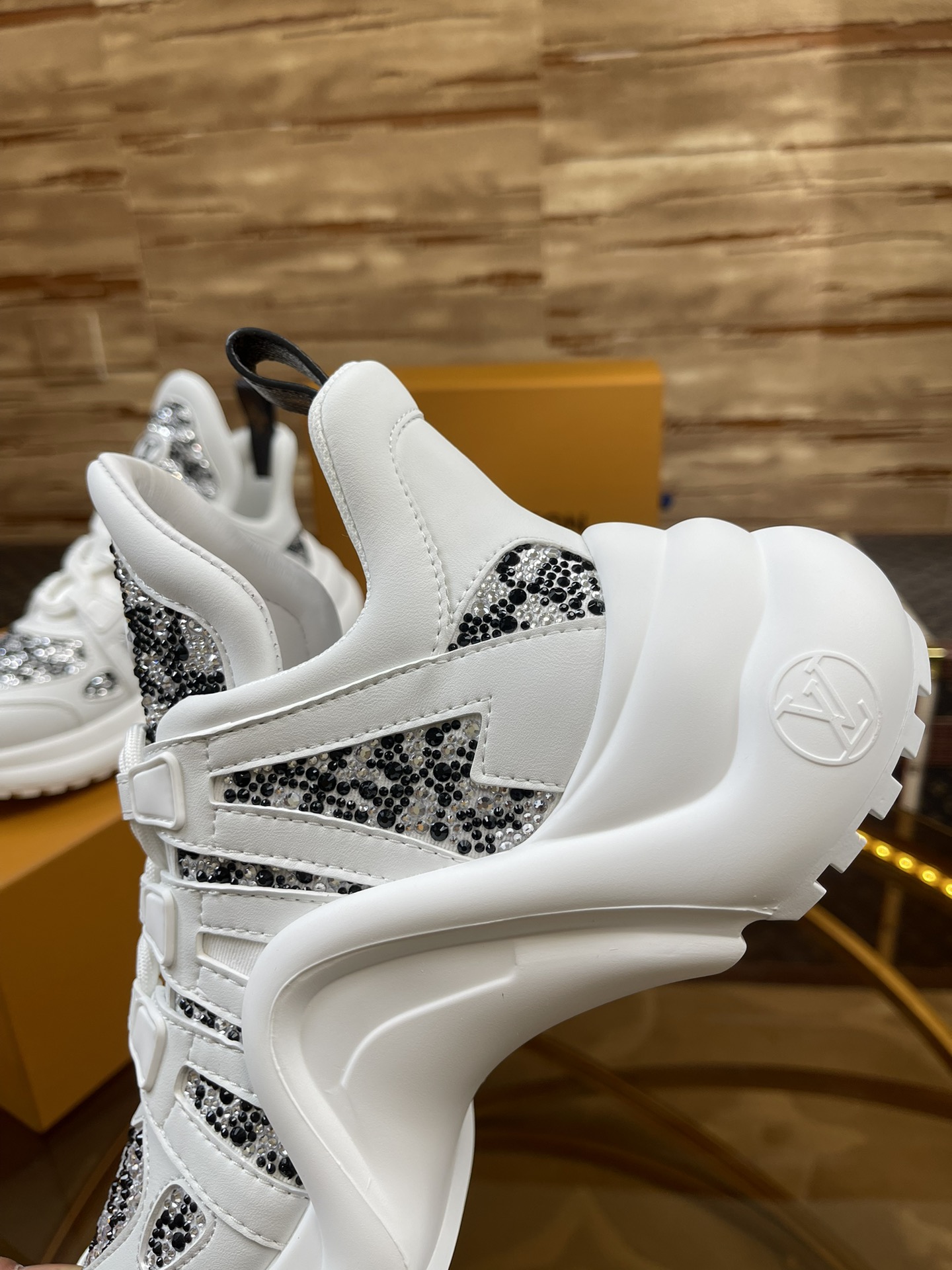 这款鞋子是AAAAA 1:1 质量 (非常棒). 使用了和原版一模一样的材料. 商标部分也保持了和路易威登/Louis Vuitton一样. 图片拍摄是实物鞋子拍摄, 您所收到的实物保证和我们图片一模一样.