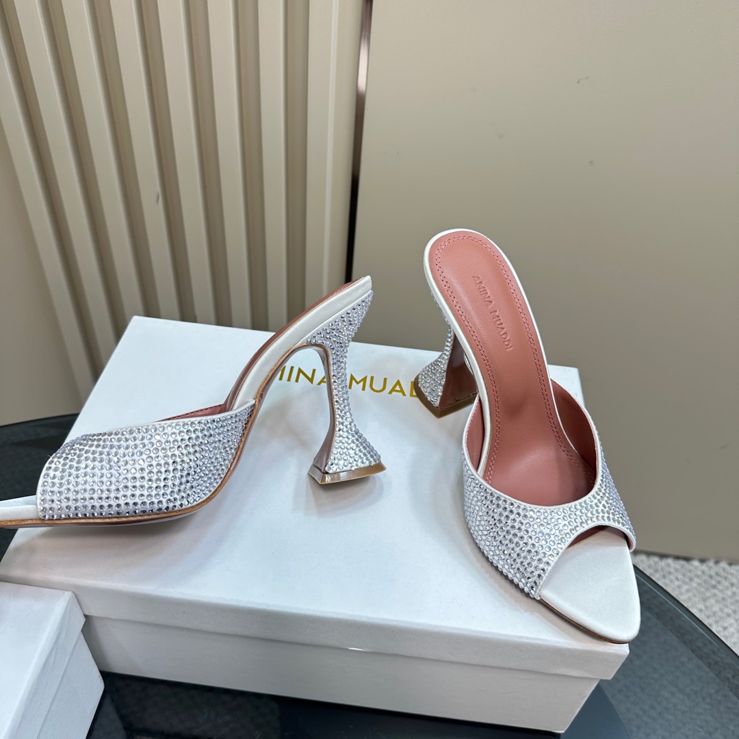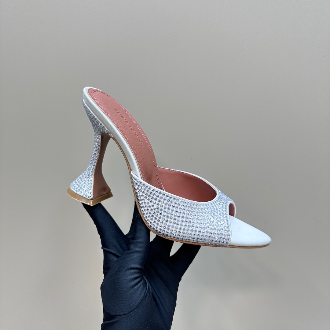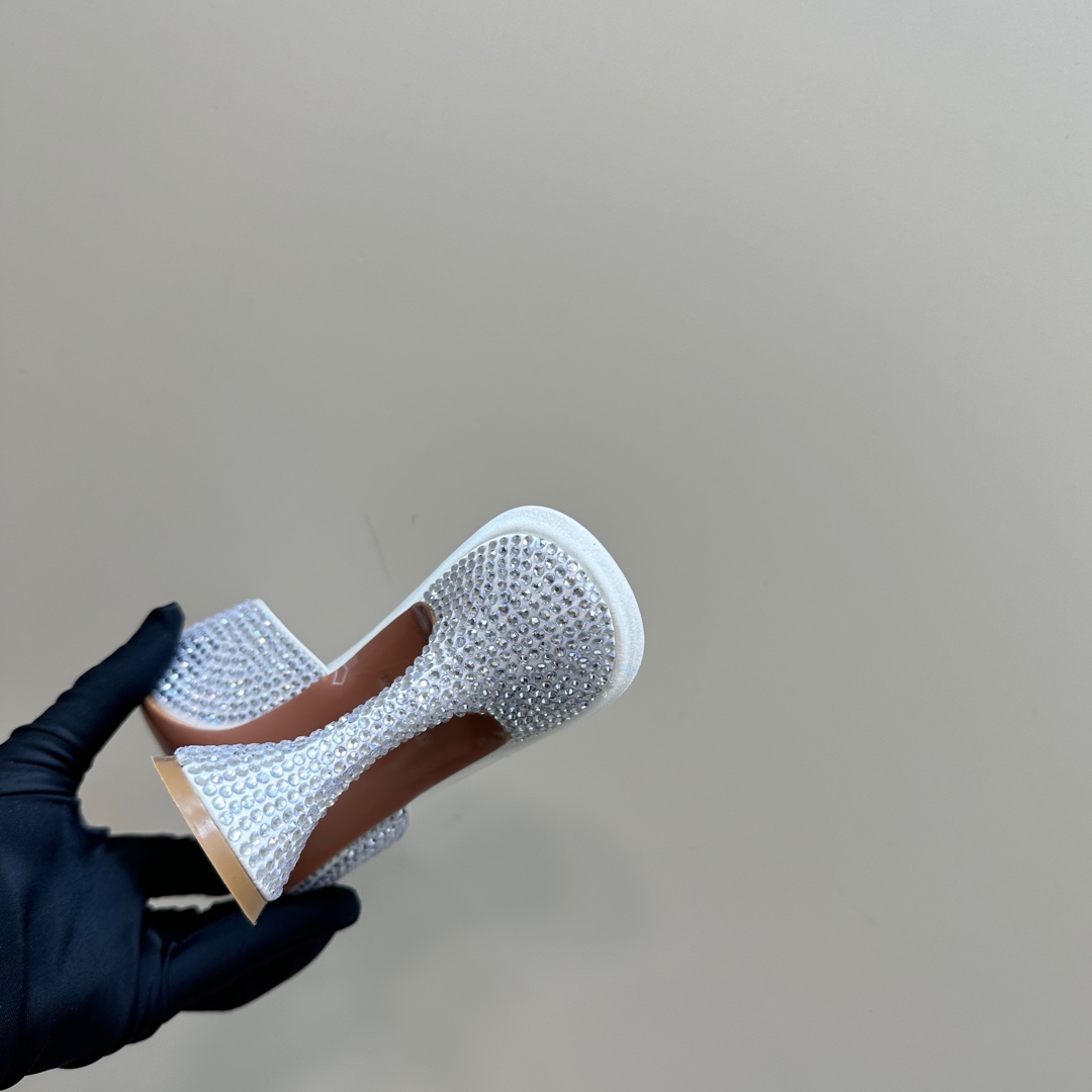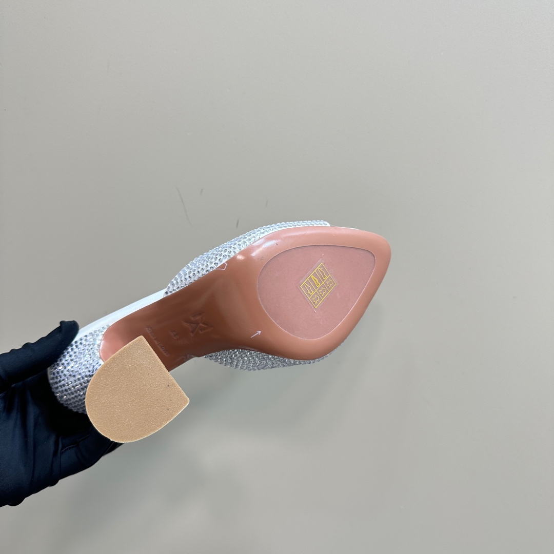 这款鞋子是AAAAA 1:1 质量 (非常棒). 使用了和原版一模一样的材料. 商标部分也保持了和Amina Muaddi一样. 图片拍摄是实物鞋子拍摄, 您所收到的实物保证和我们图片一模一样.