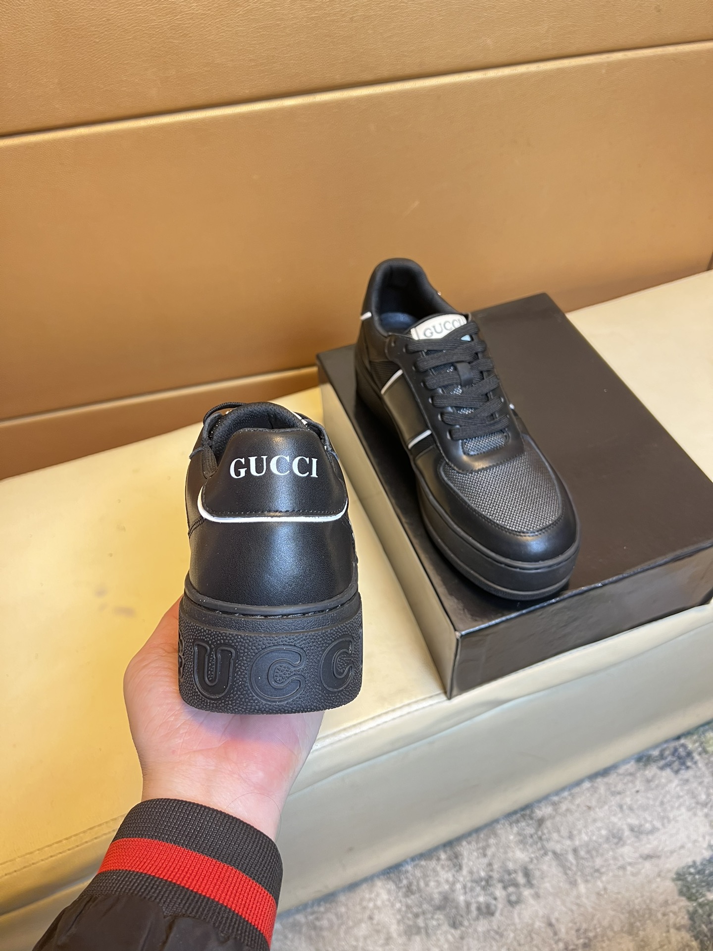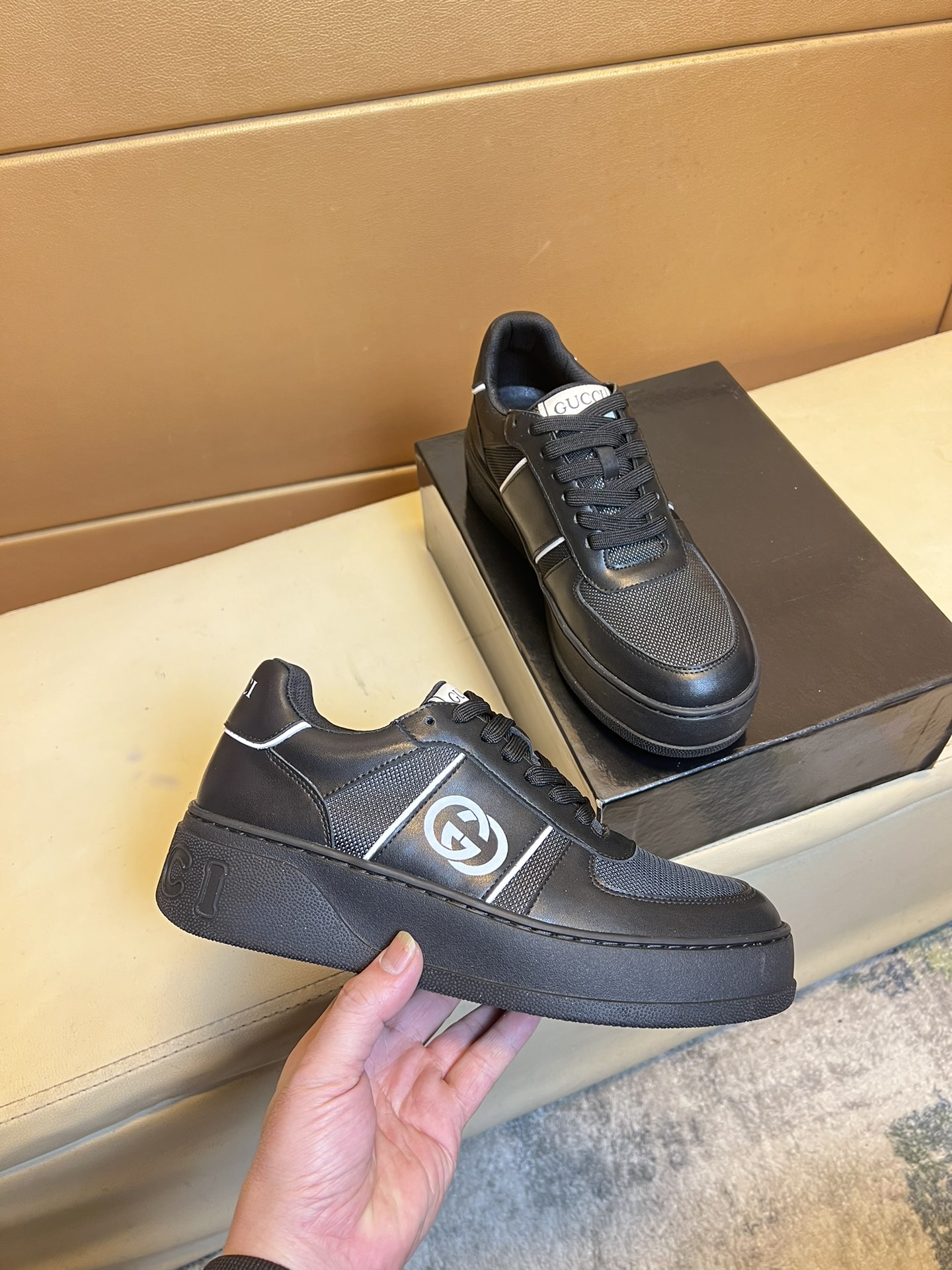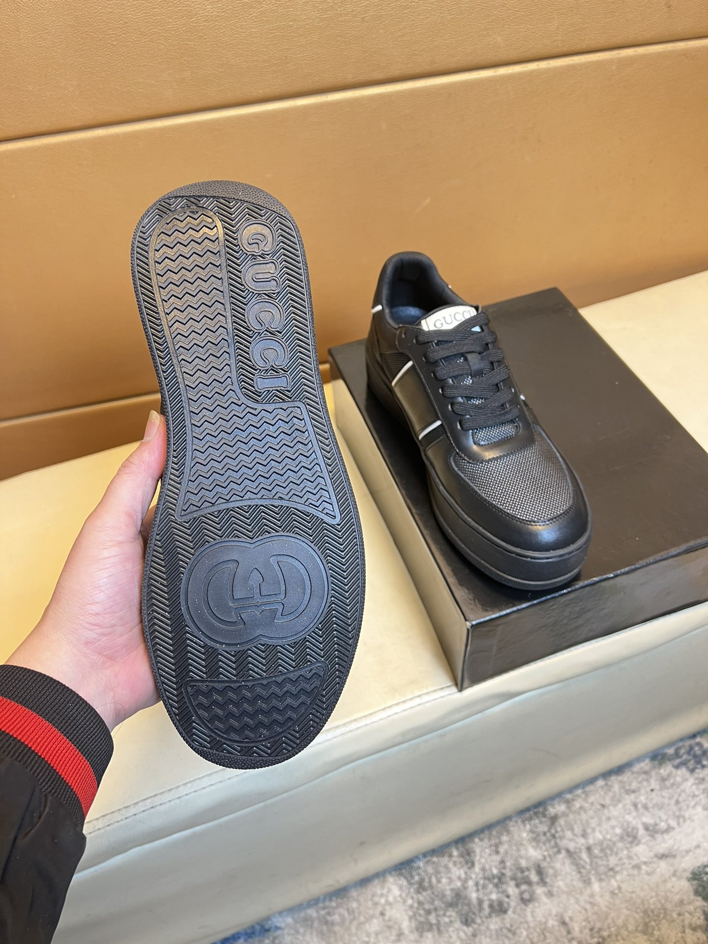 这款鞋子是AAAAA 1:1 质量 (非常棒). 使用了和原版一模一样的材料. 商标部分也保持了和古奇/Gucci一样. 图片拍摄是实物鞋子拍摄, 您所收到的实物保证和我们图片一模一样.