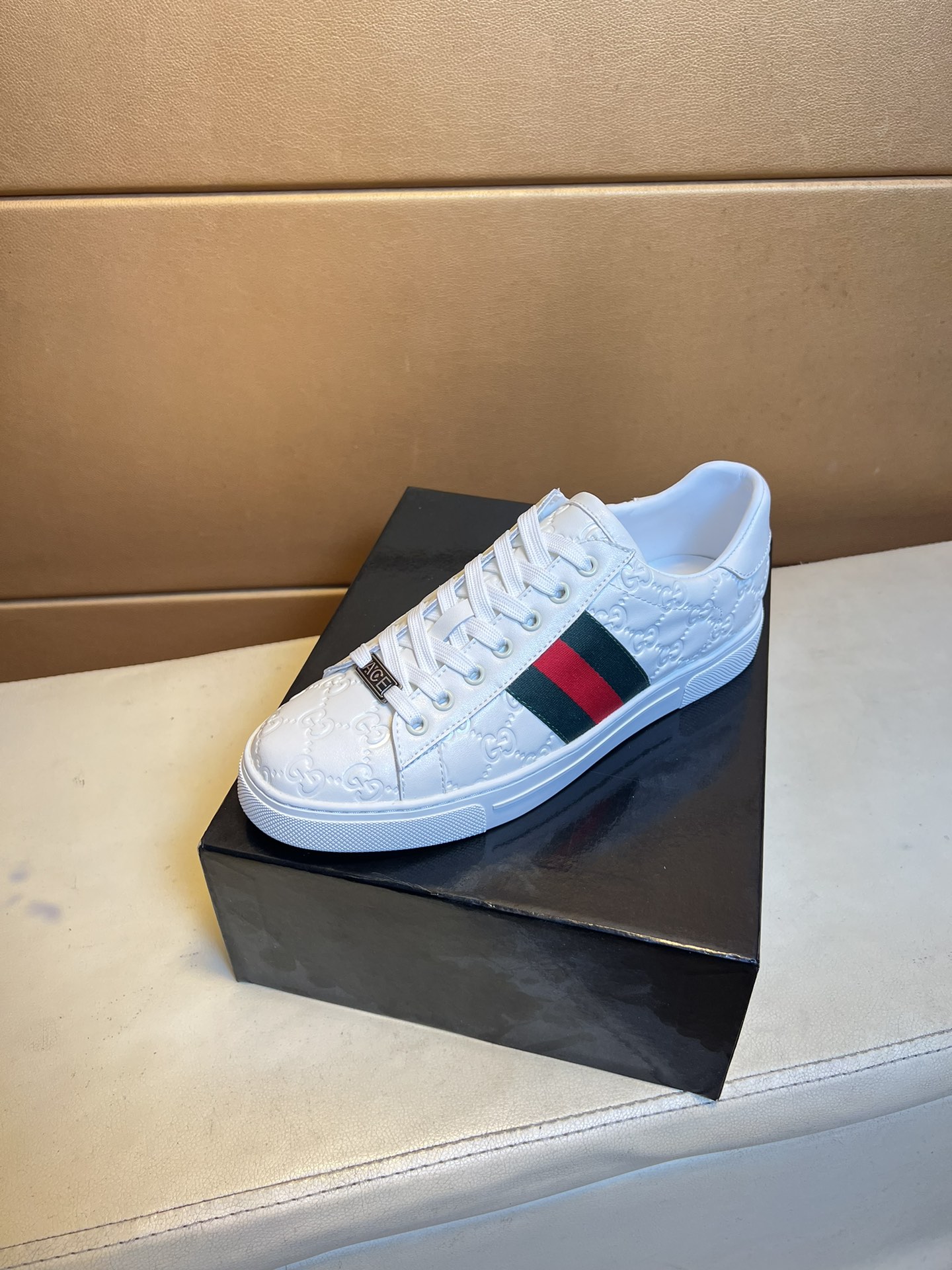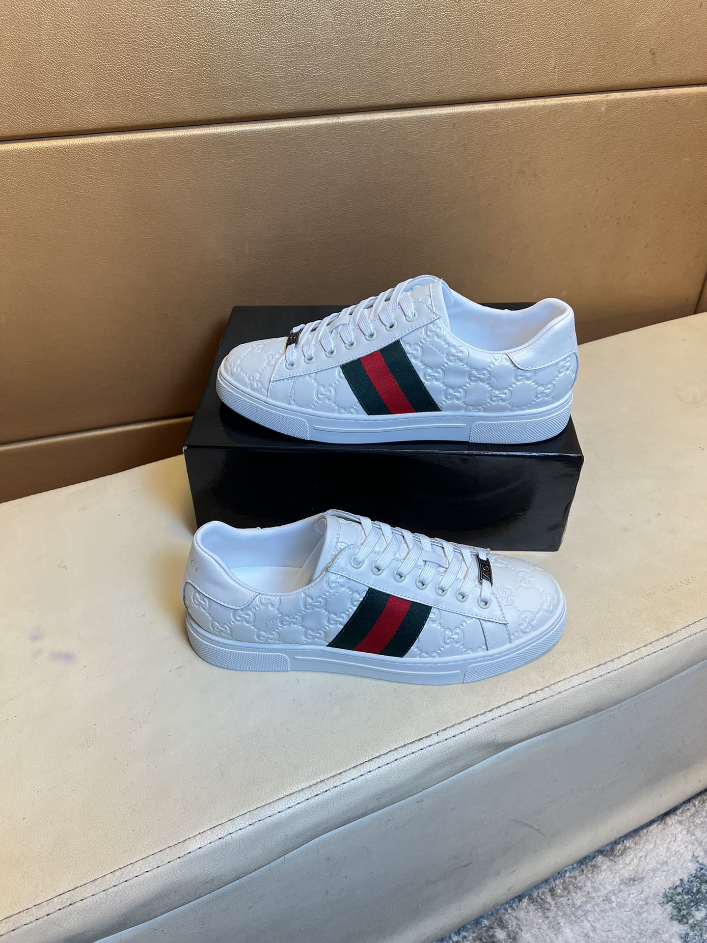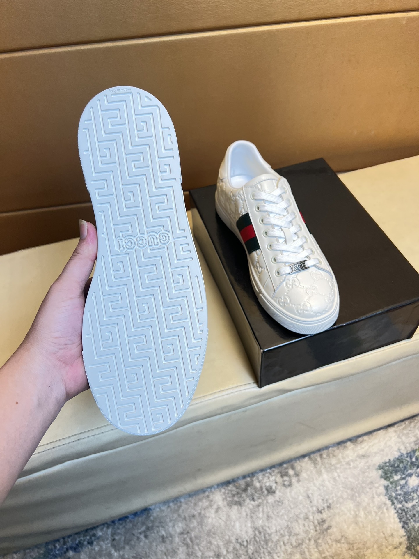 这款鞋子是AAAAA 1:1 质量 (非常棒). 使用了和原版一模一样的材料. 商标部分也保持了和古奇/Gucci一样. 图片拍摄是实物鞋子拍摄, 您所收到的实物保证和我们图片一模一样.