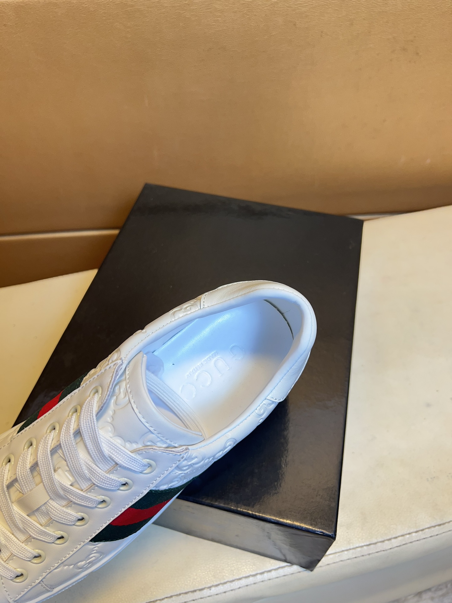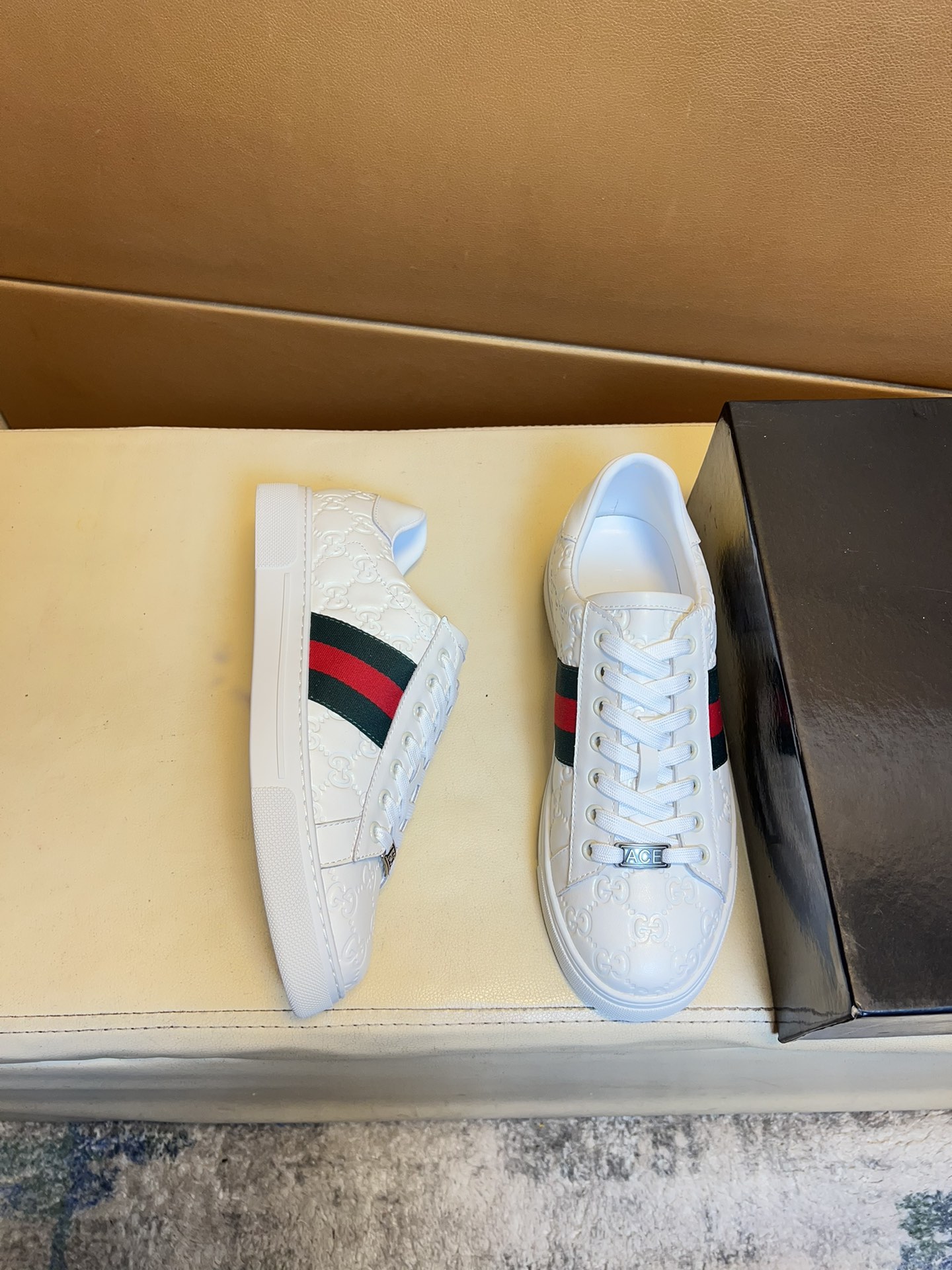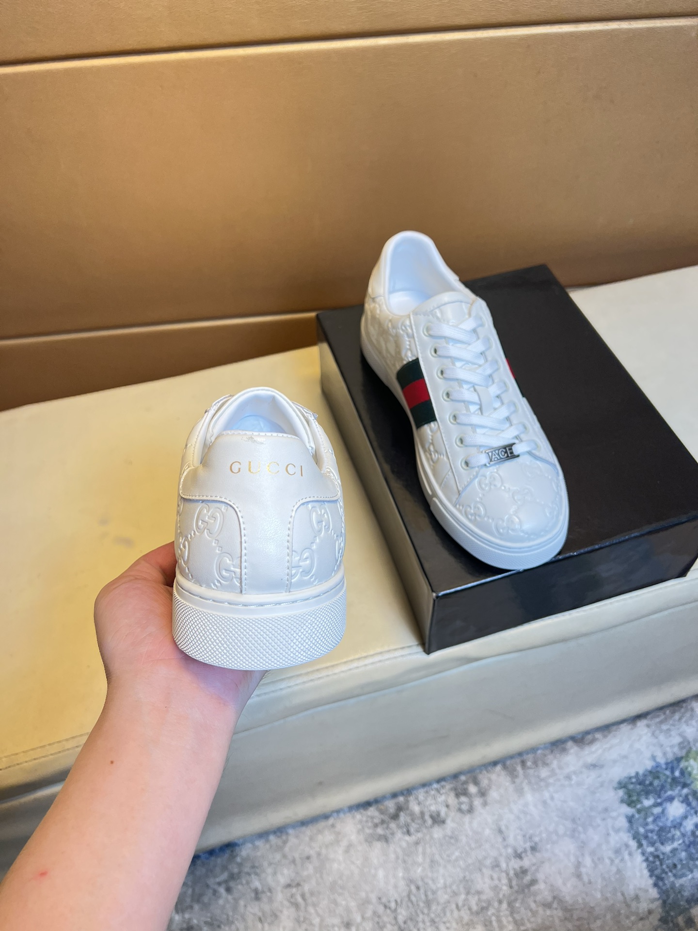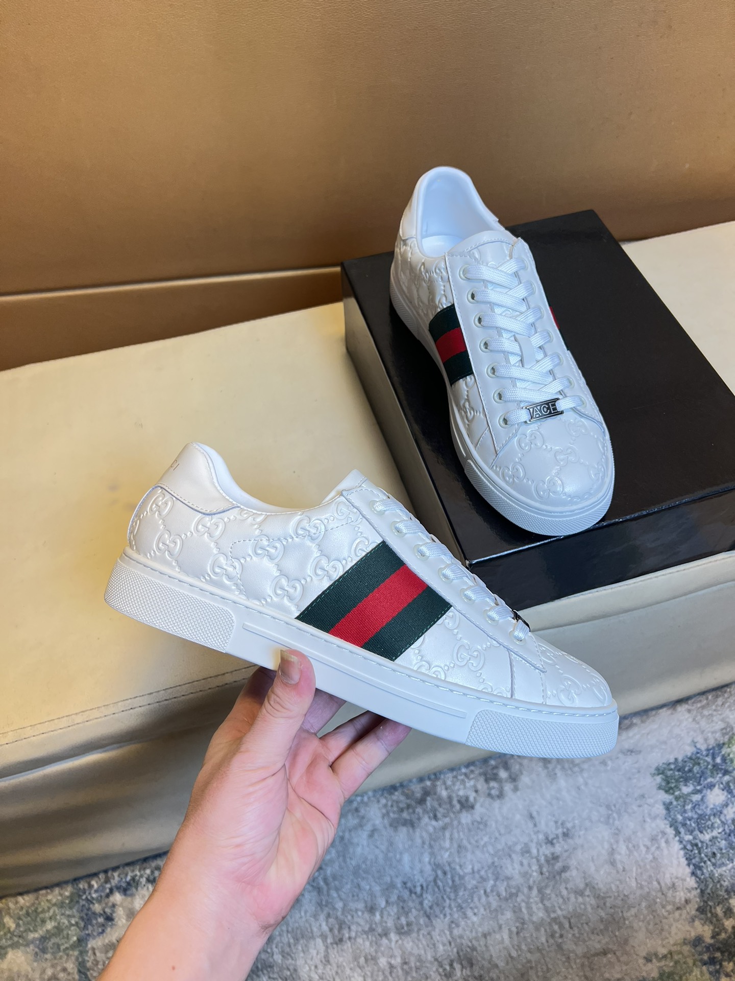 这款鞋子是AAAAA 1:1 质量 (非常棒). 使用了和原版一模一样的材料. 商标部分也保持了和古奇/Gucci一样. 图片拍摄是实物鞋子拍摄, 您所收到的实物保证和我们图片一模一样.