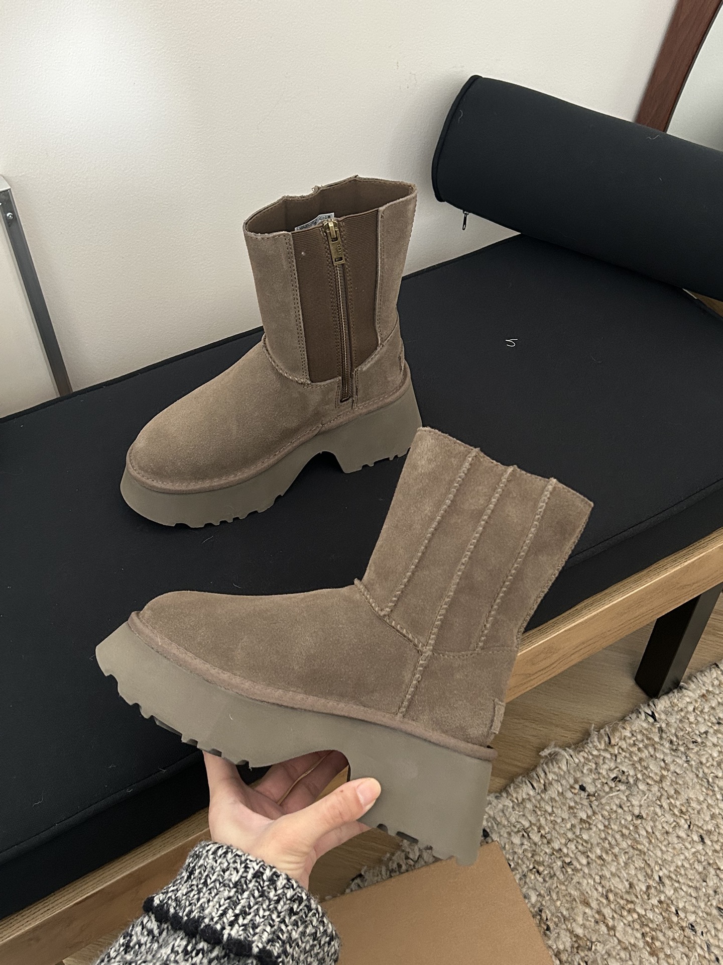 这款鞋子是AAAAA 1:1 质量 (非常棒). 使用了和原版一模一样的材料. 商标部分也保持了和UGG雪地靴一样. 图片拍摄是实物鞋子拍摄, 您所收到的实物保证和我们图片一模一样.