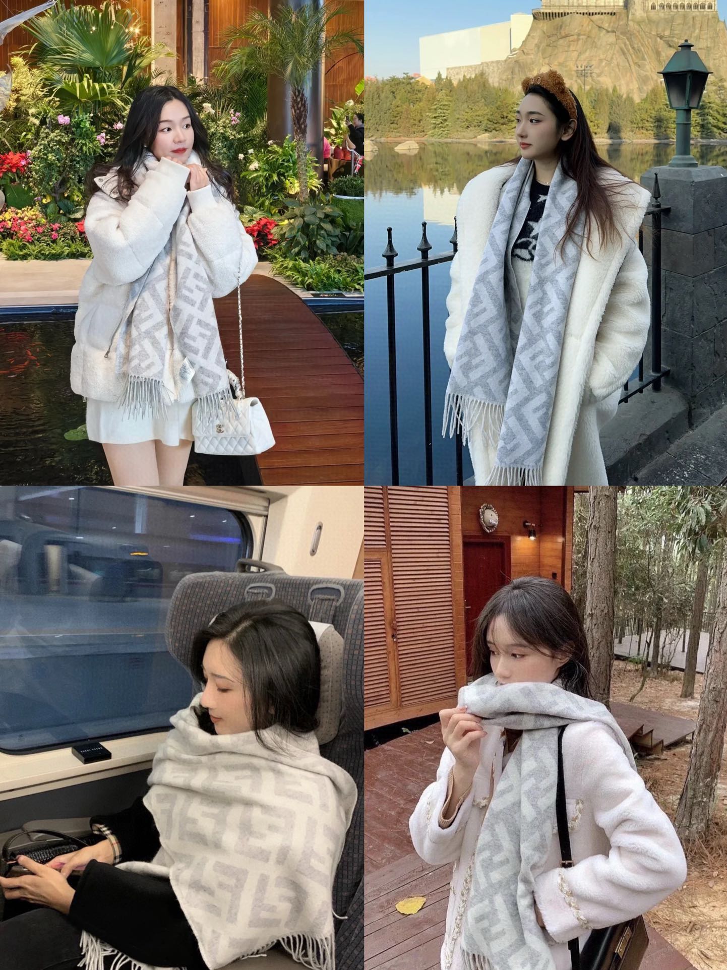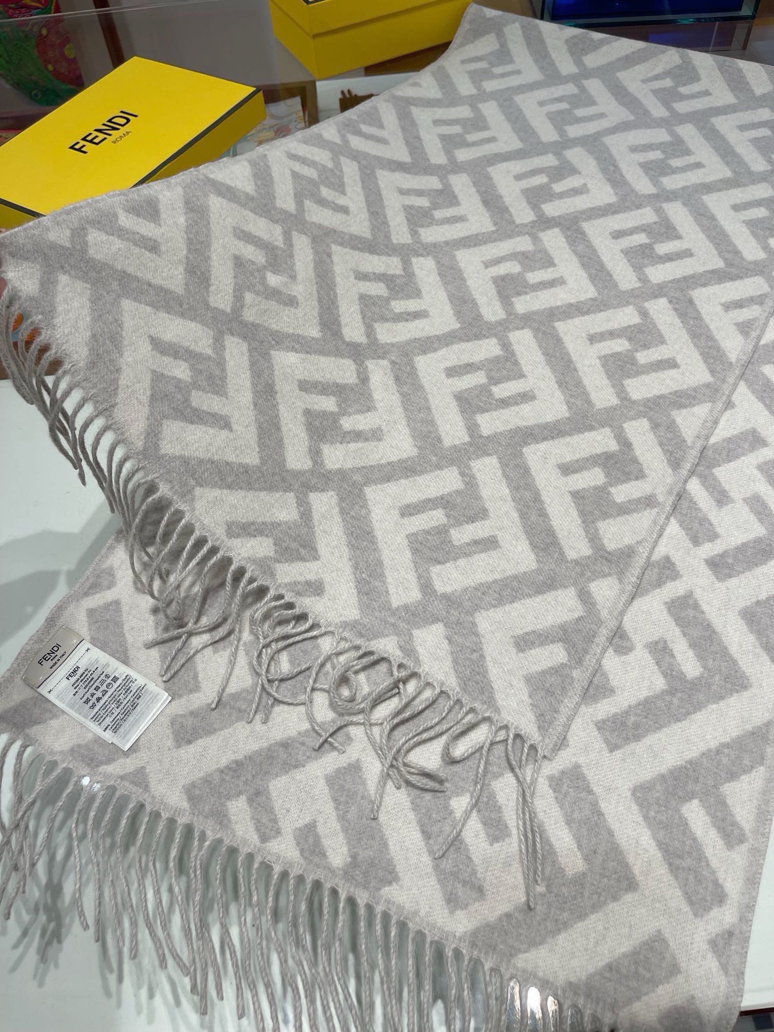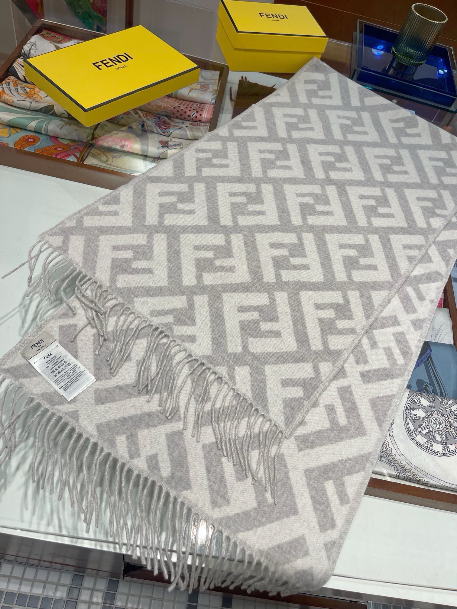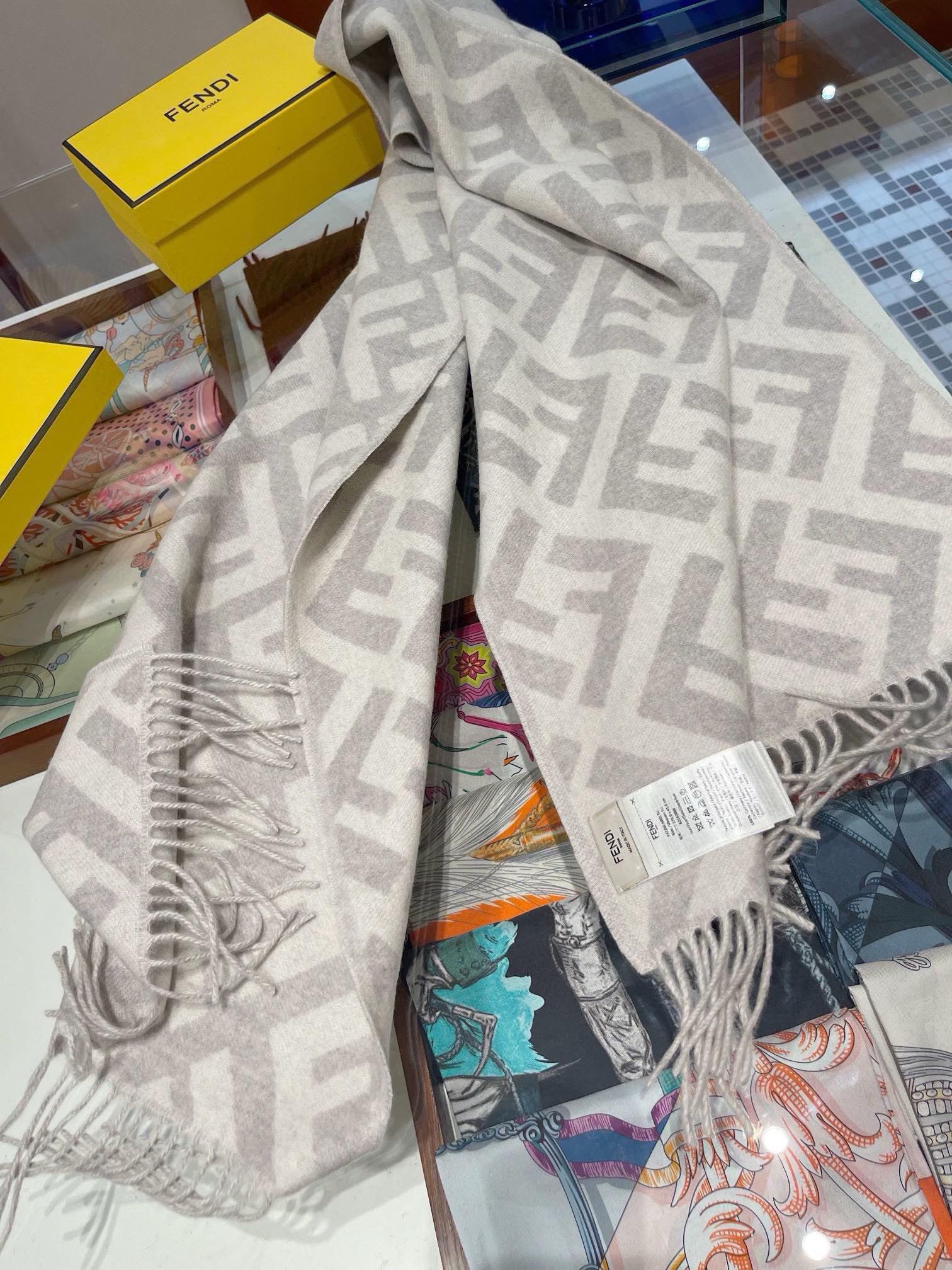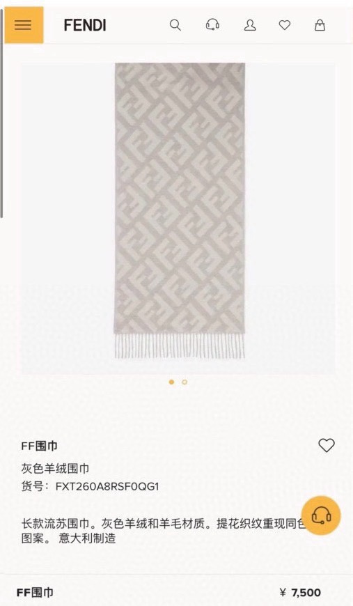 这款围巾是AAAAA 1:1 质量 (非常棒). 使用了和原版一模一样的材料. 商标部分也保持了和芬迪/Fendi一样. 图片拍摄是实物围巾拍摄, 您所收到的实物保证和我们图片一模一样.