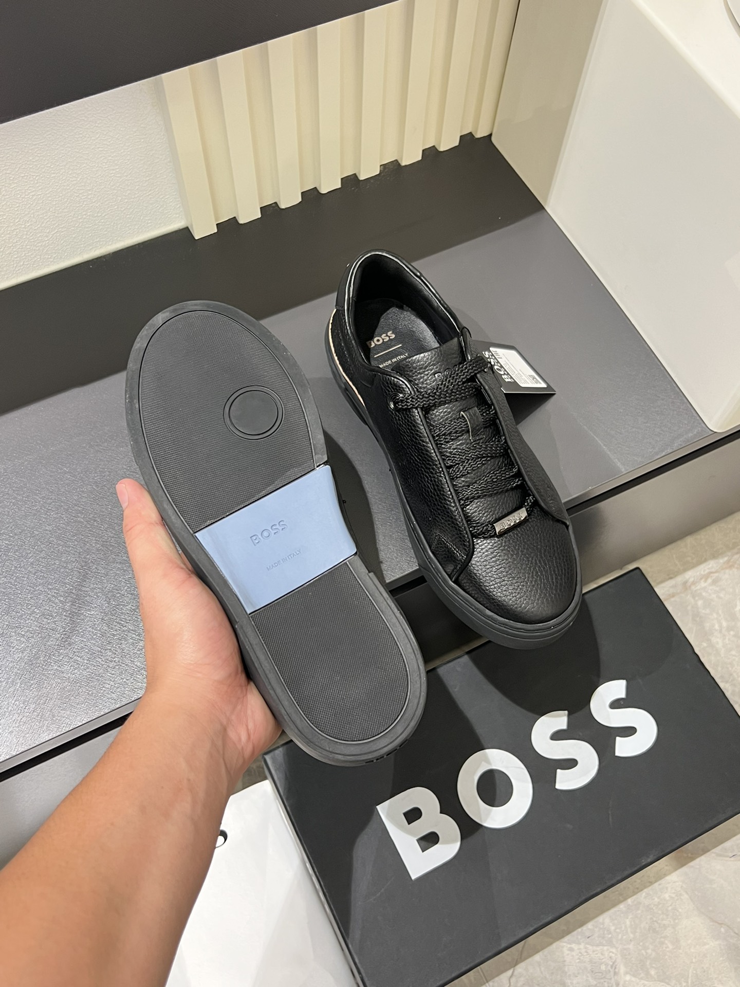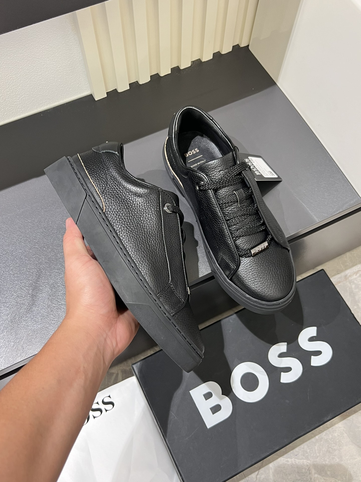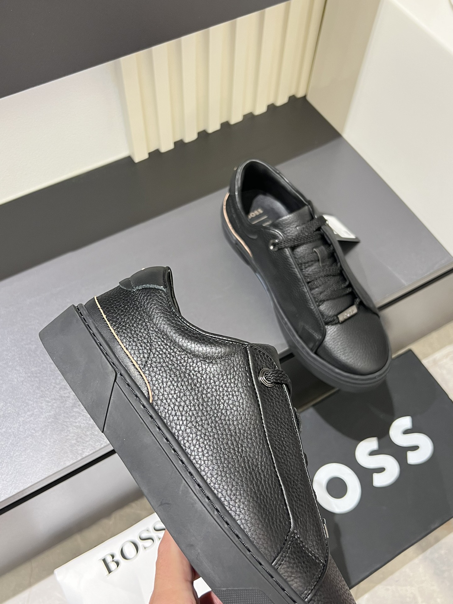 这款鞋子是AAAAA 1:1 质量 (非常棒). 使用了和原版一模一样的材料. 商标部分也保持了和BOSS一样. 图片拍摄是实物鞋子拍摄, 您所收到的实物保证和我们图片一模一样.