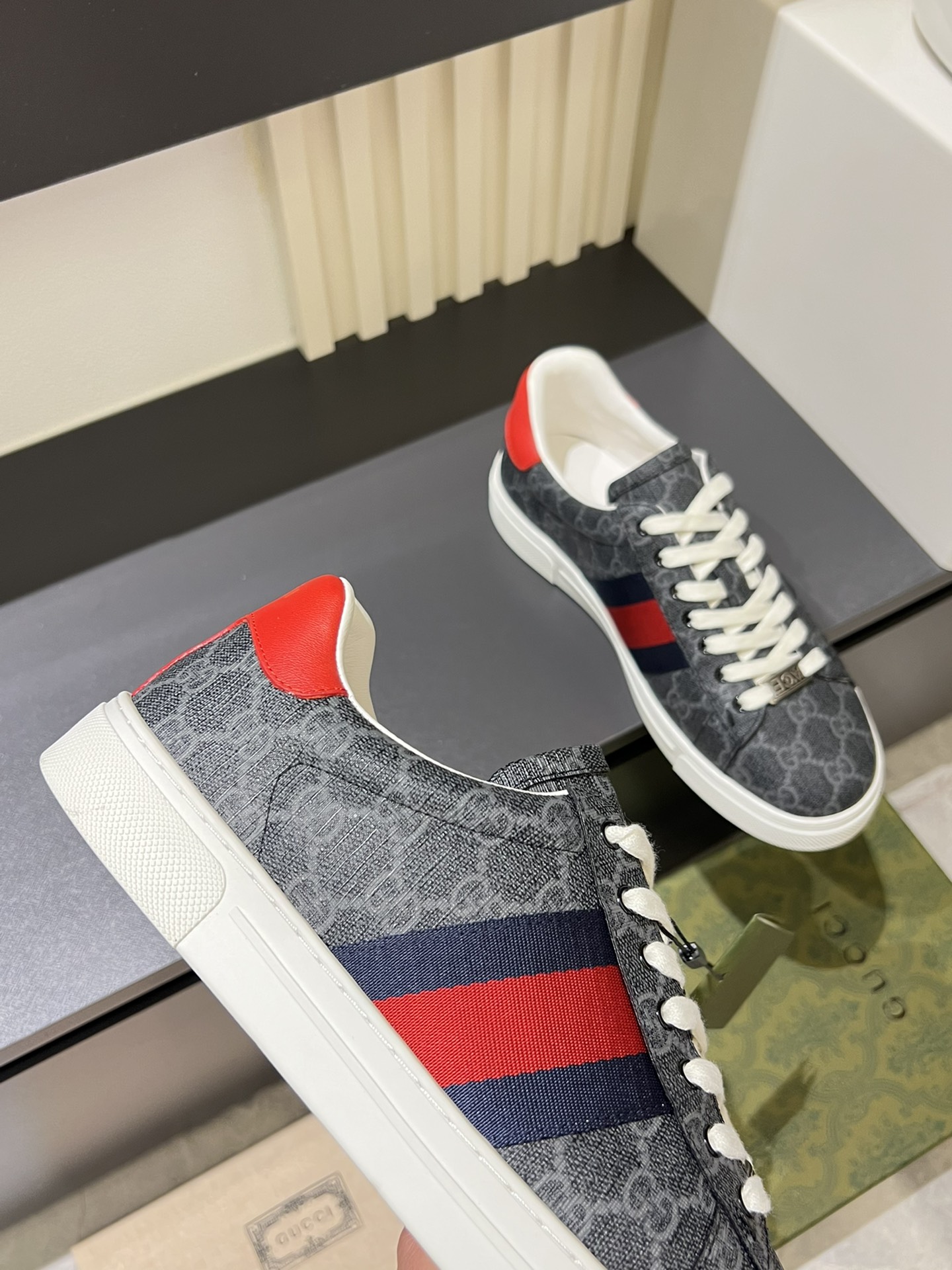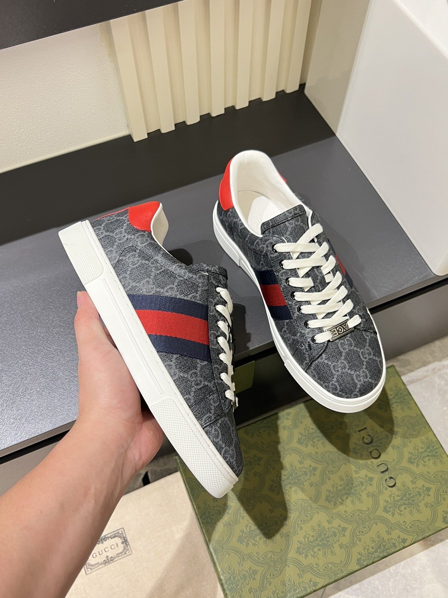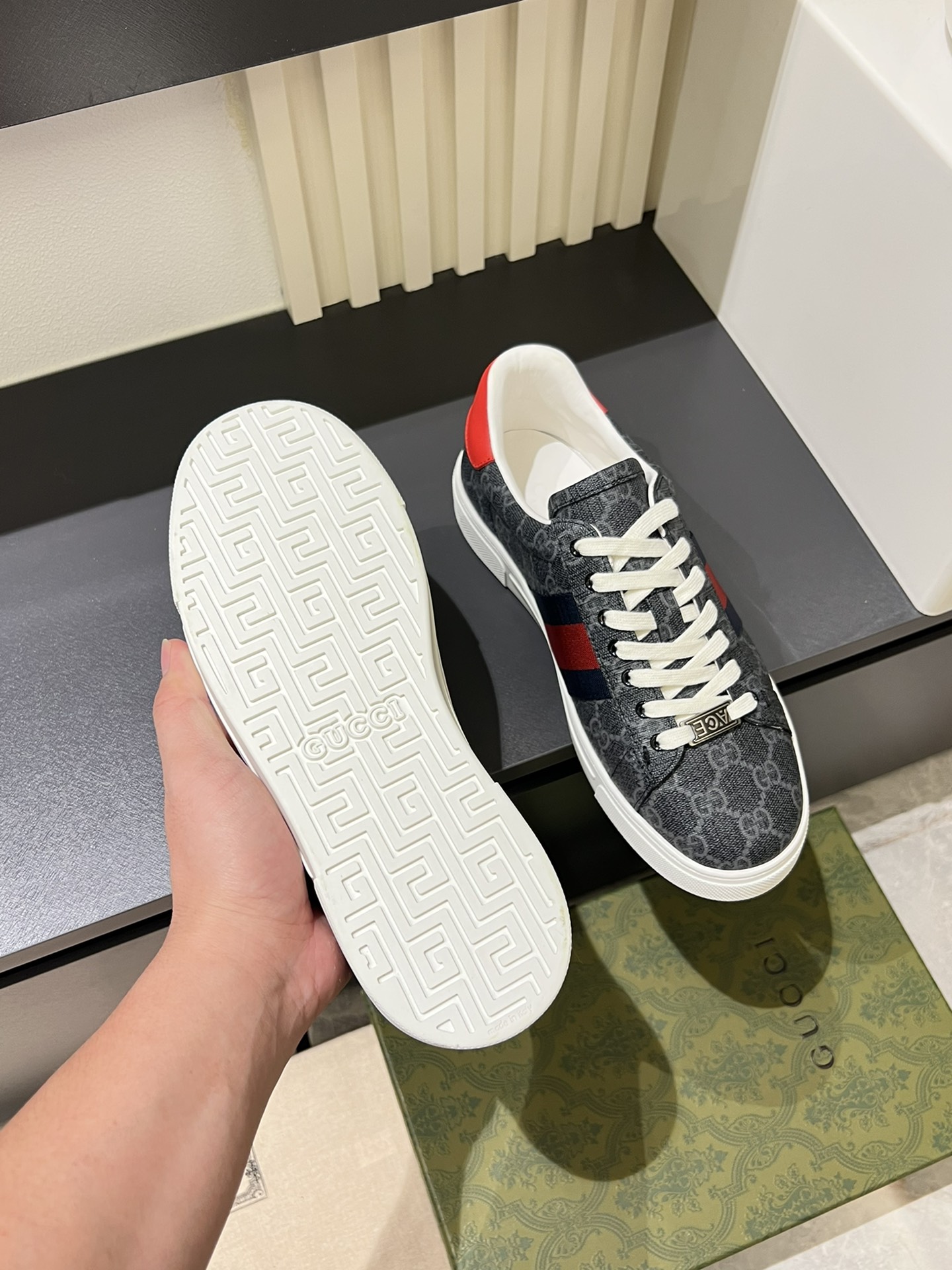 这款鞋子是AAAAA 1:1 质量 (非常棒). 使用了和原版一模一样的材料. 商标部分也保持了和古奇/Gucci一样. 图片拍摄是实物鞋子拍摄, 您所收到的实物保证和我们图片一模一样.