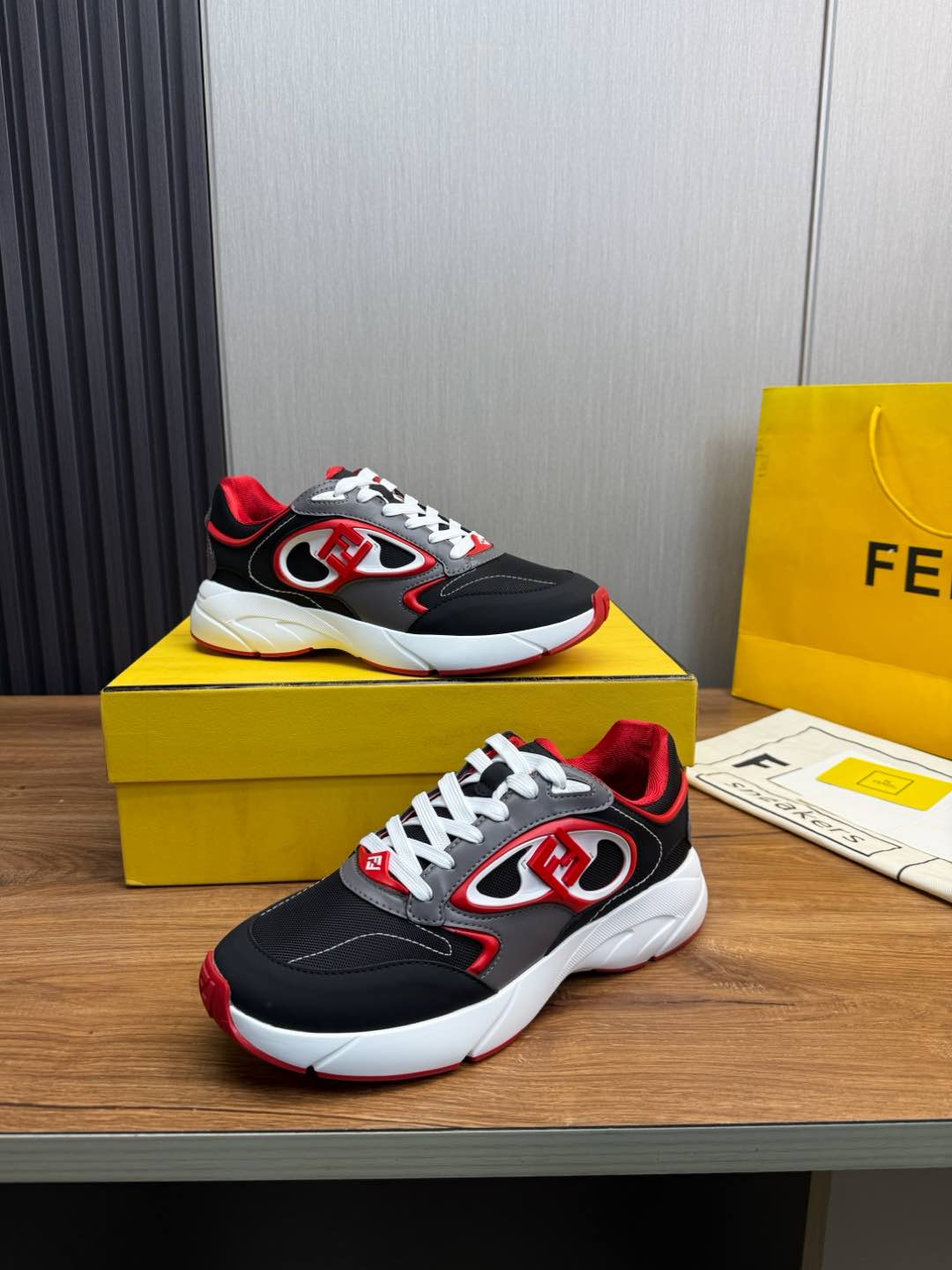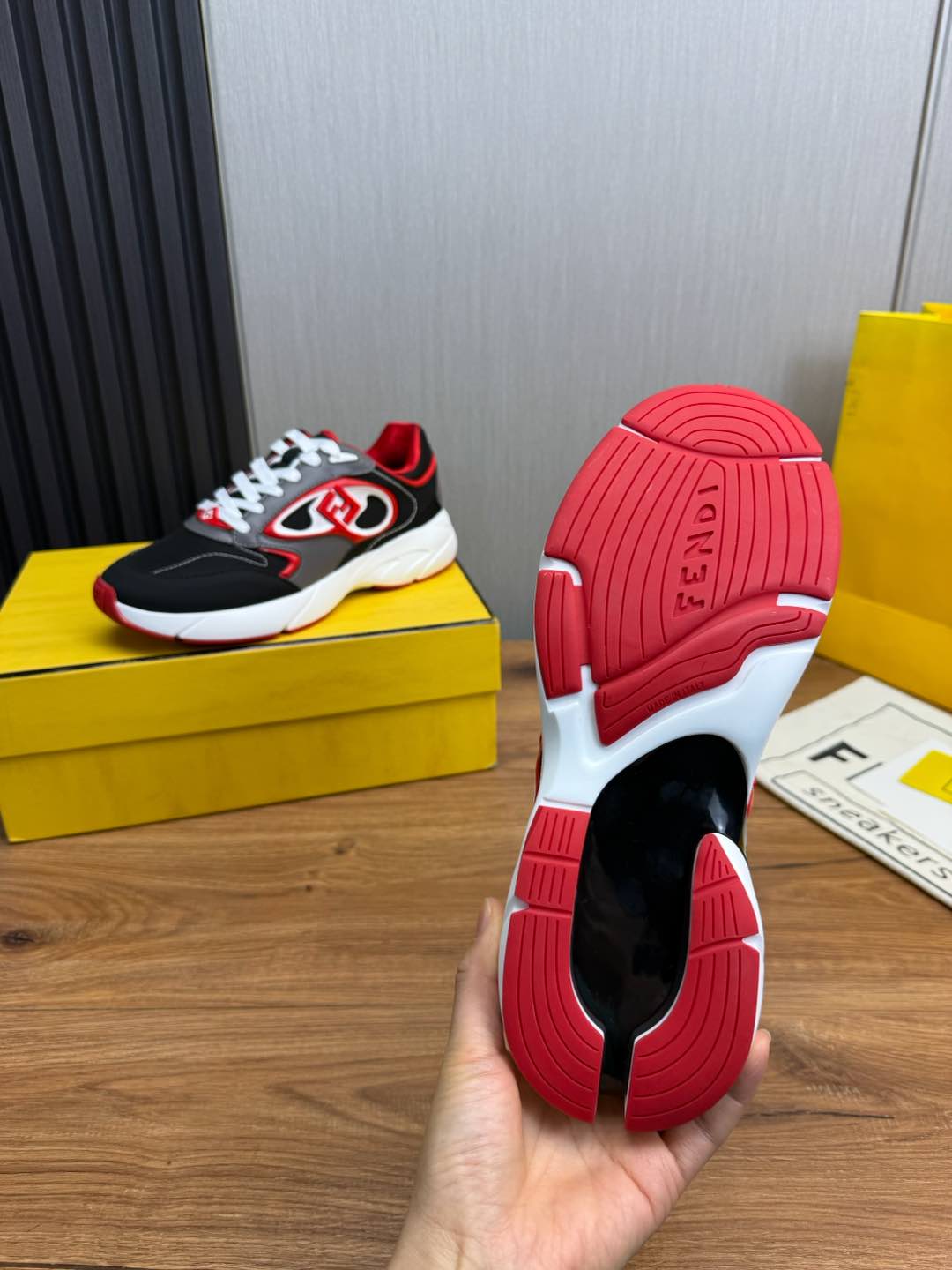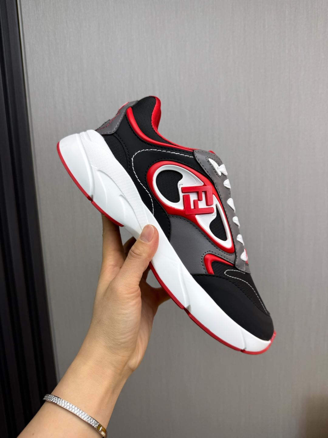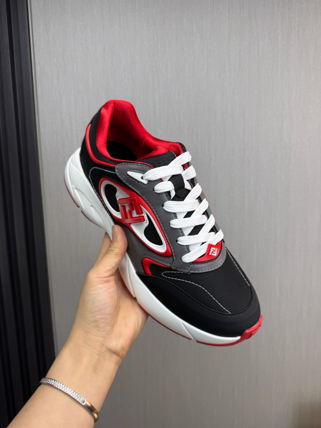 这款鞋子是AAAAA 1:1 质量 (非常棒). 使用了和原版一模一样的材料. 商标部分也保持了和芬迪/Fendi一样. 图片拍摄是实物鞋子拍摄, 您所收到的实物保证和我们图片一模一样.