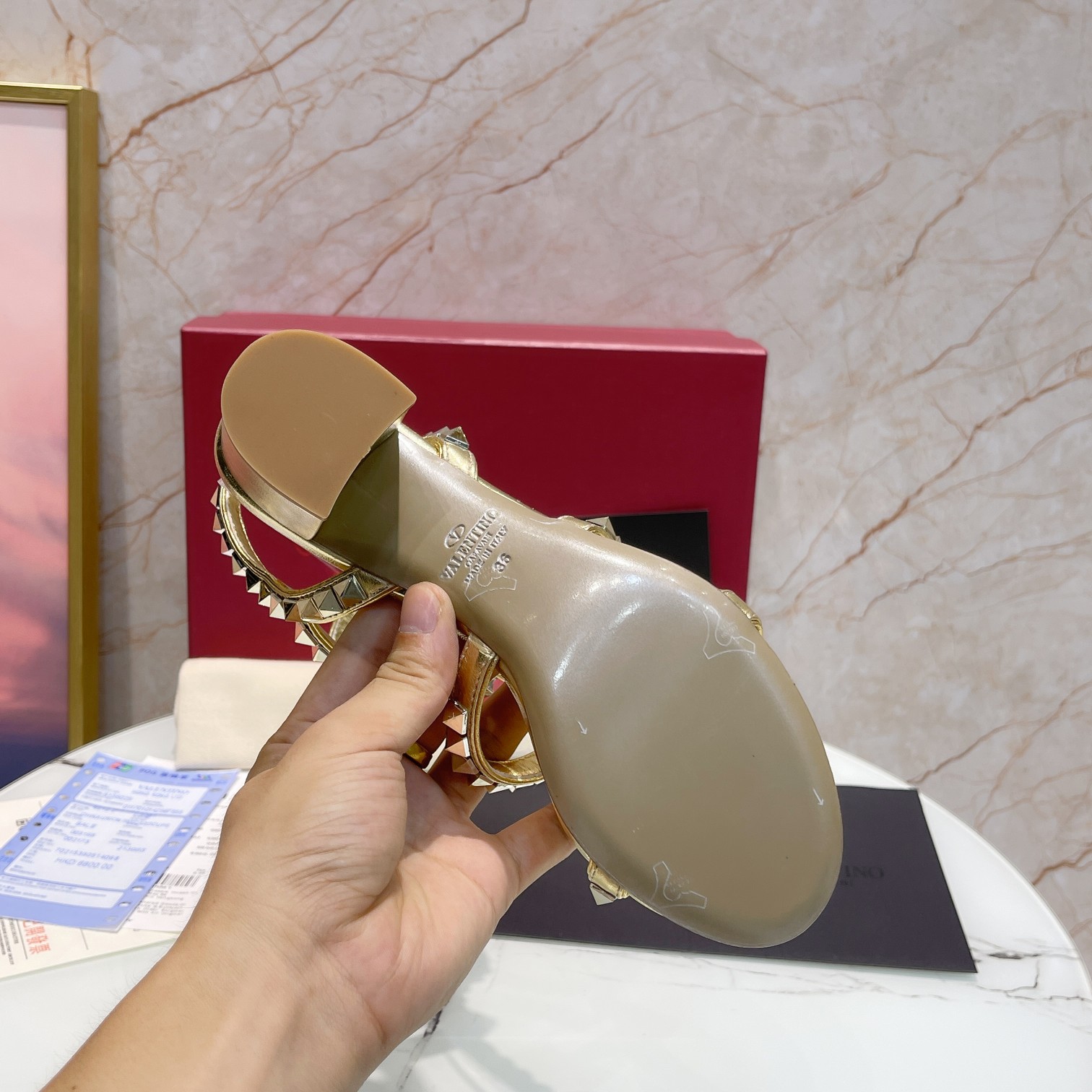 这款鞋子是AAAAA 1:1 质量 (非常棒). 使用了和原版一模一样的材料. 商标部分也保持了和华伦天奴/Valentino一样. 图片拍摄是实物鞋子拍摄, 您所收到的实物保证和我们图片一模一样.