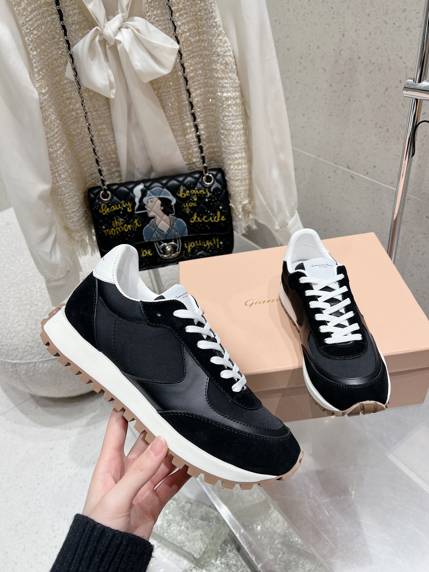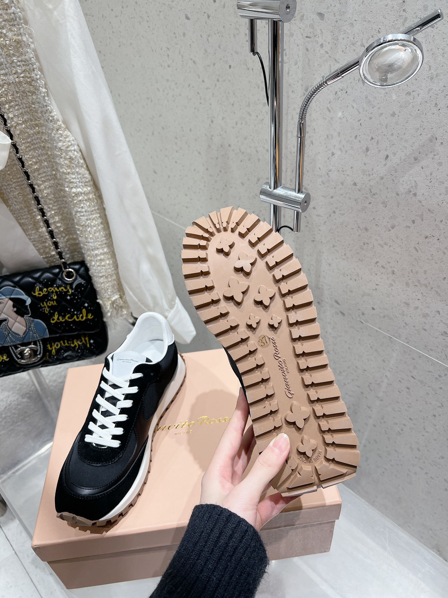 这款鞋子是AAAAA 1:1 质量 (非常棒). 使用了和原版一模一样的材料. 商标部分也保持了和Gianvito Rossi一样. 图片拍摄是实物鞋子拍摄, 您所收到的实物保证和我们图片一模一样.