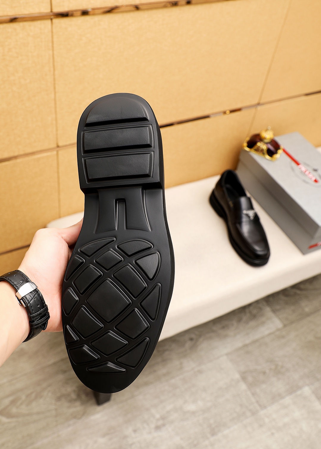 这款鞋子是AAAAA 1:1 质量 (非常棒). 使用了和原版一模一样的材料. 商标部分也保持了和普拉达/Prada一样. 图片拍摄是实物鞋子拍摄, 您所收到的实物保证和我们图片一模一样.