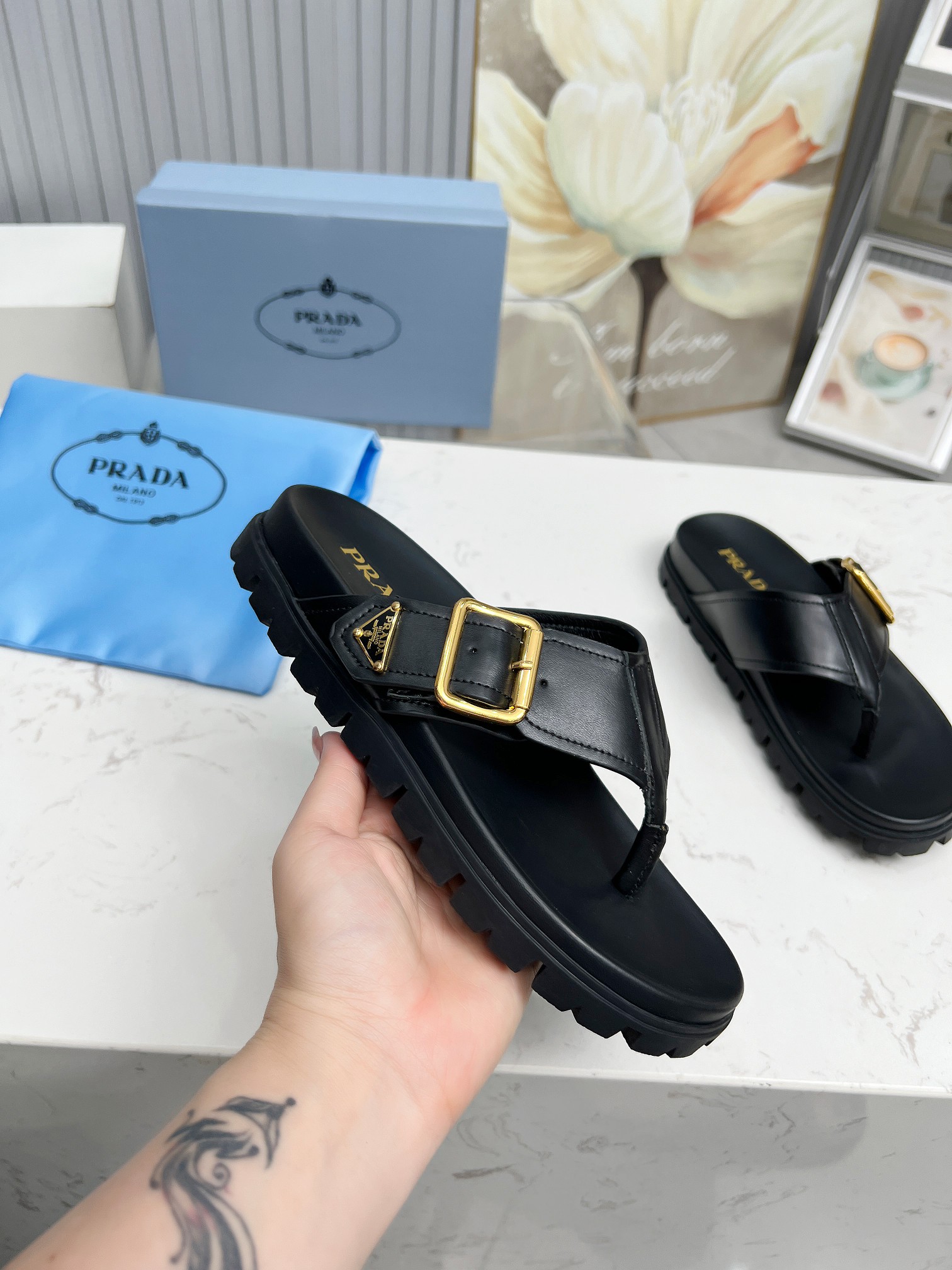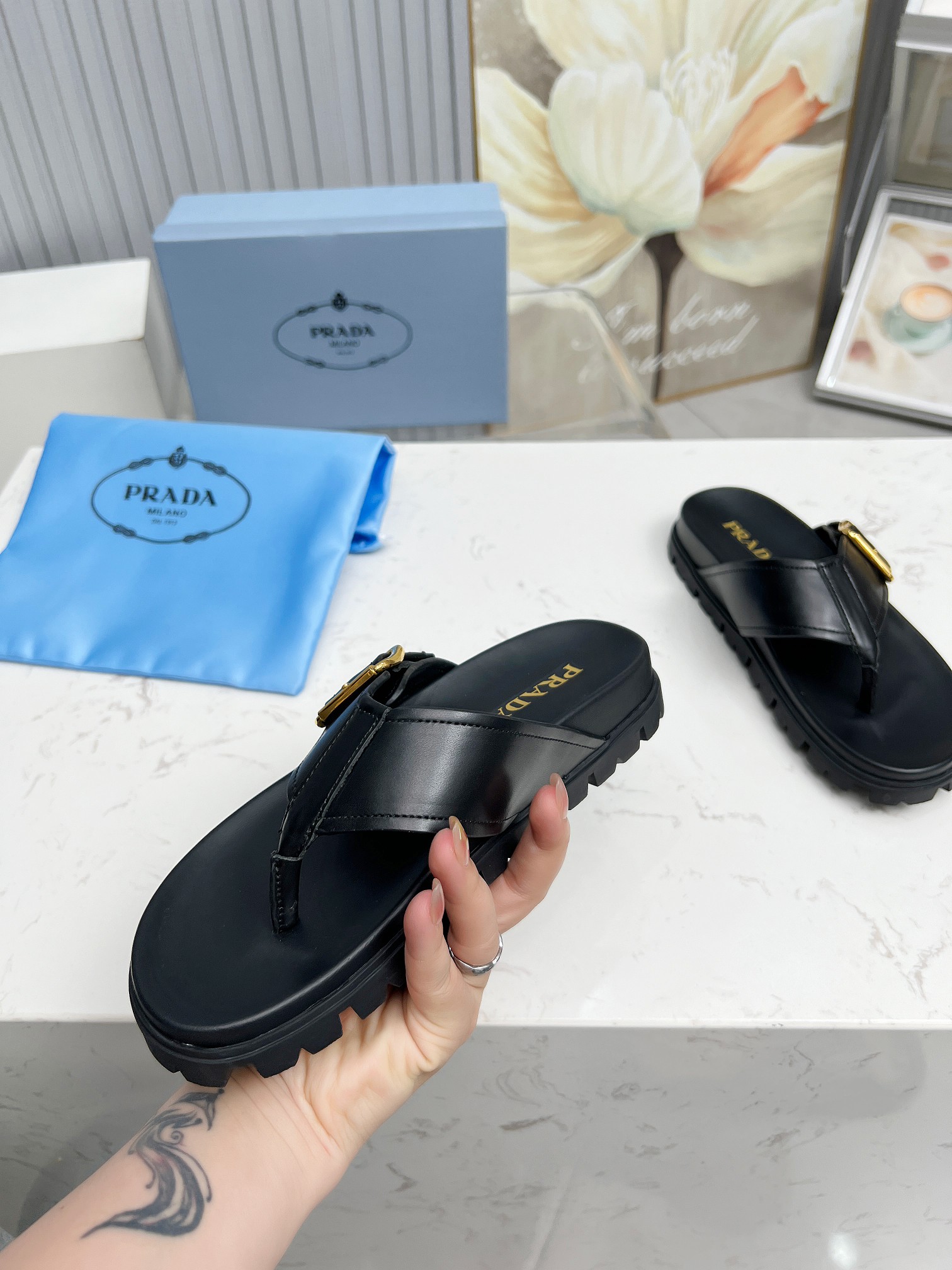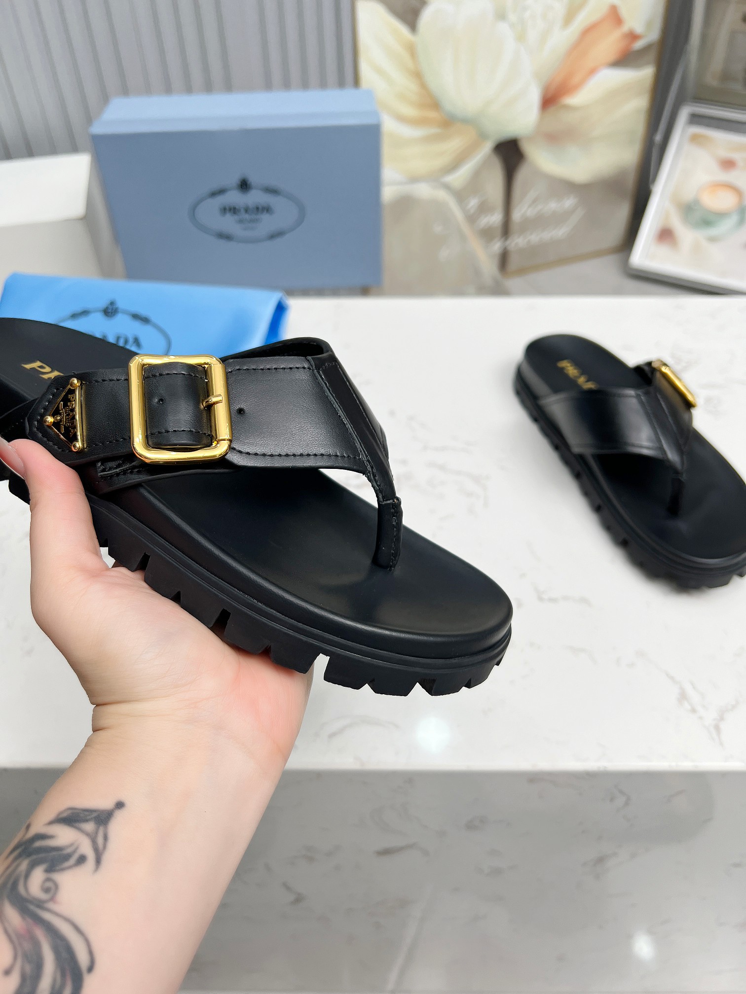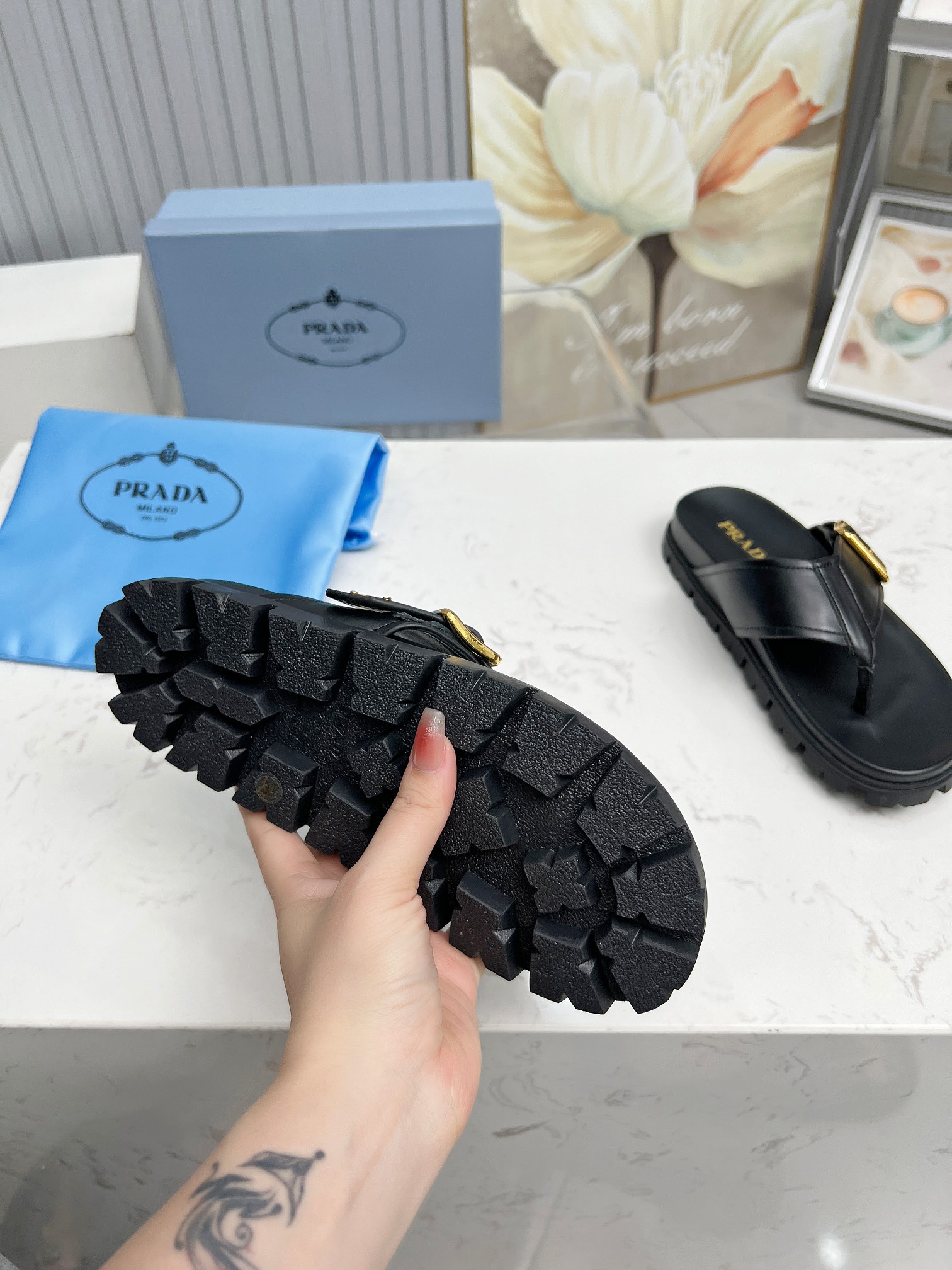 这款鞋子是AAAAA 1:1 质量 (非常棒). 使用了和原版一模一样的材料. 商标部分也保持了和普拉达/Prada一样. 图片拍摄是实物鞋子拍摄, 您所收到的实物保证和我们图片一模一样.