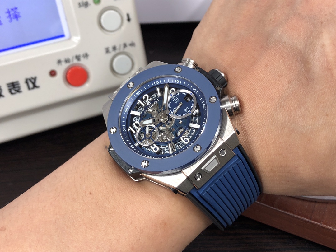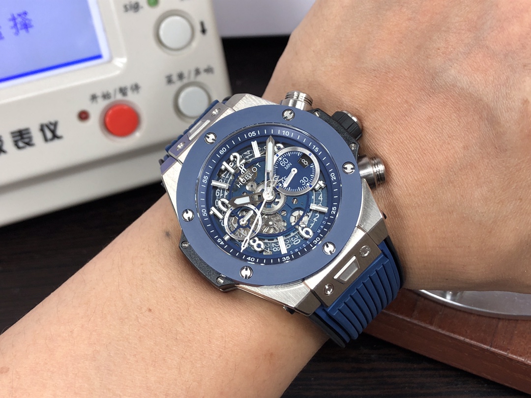 这款手表是AAAAA 1:1 质量 (非常棒). 使用了和原版一模一样的材料. 商标部分也保持了和Hublot一样. 图片拍摄是实物手表拍摄, 您所收到的实物保证和我们图片一模一样.