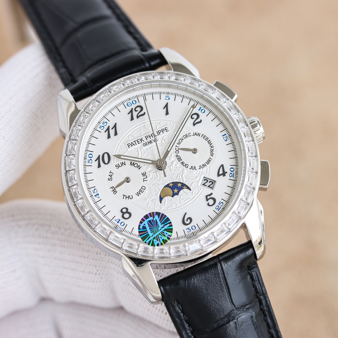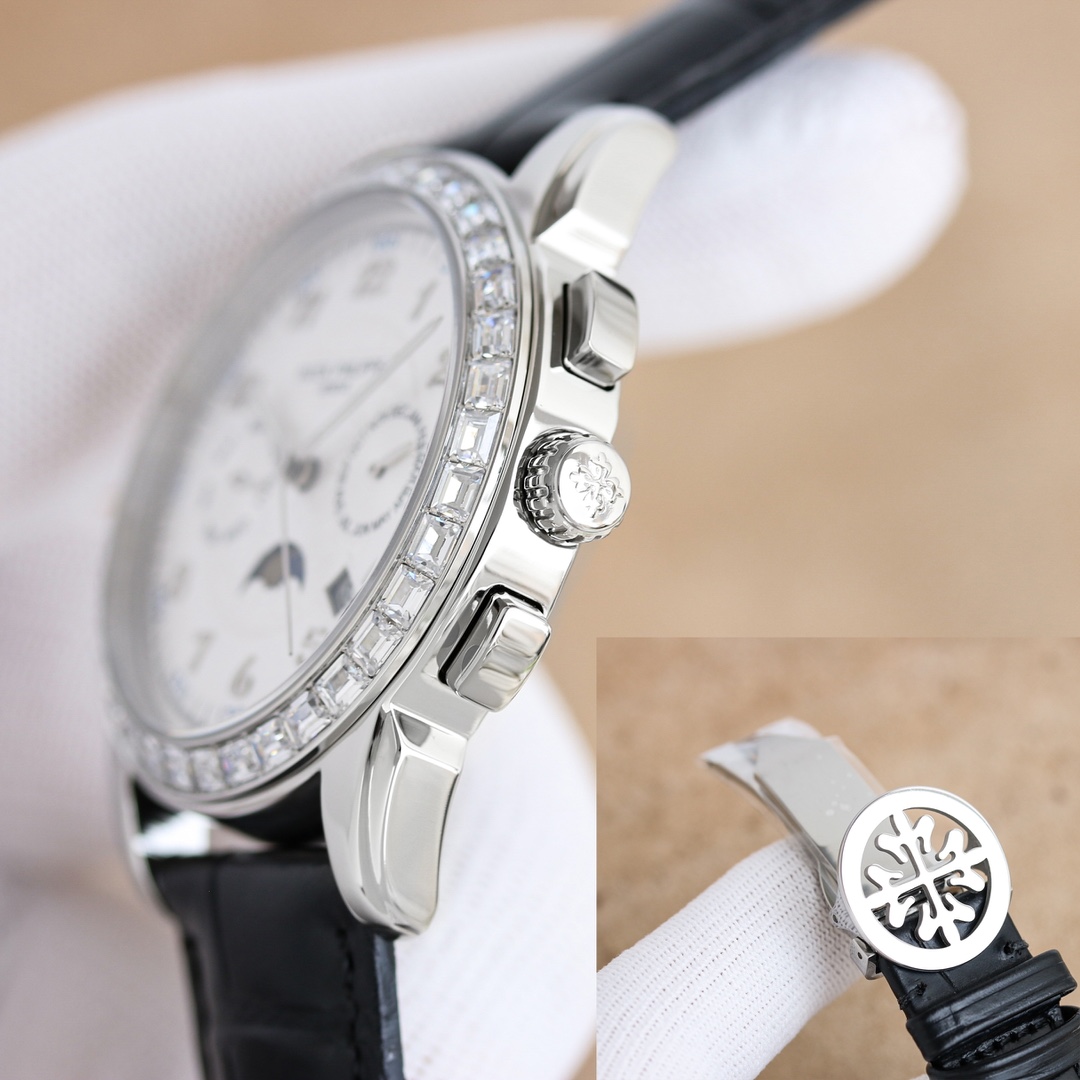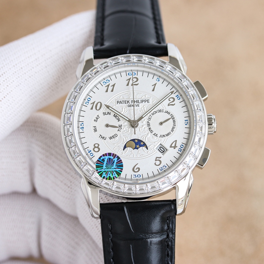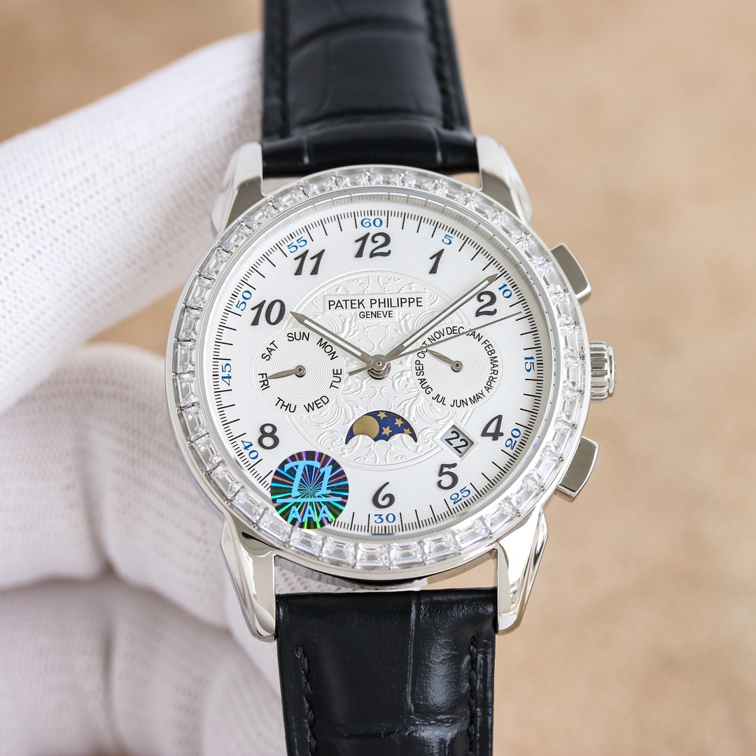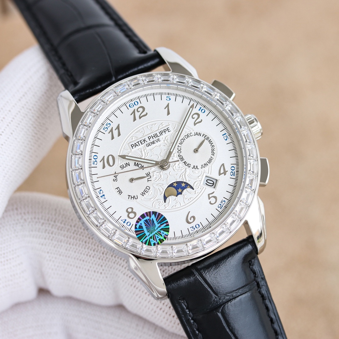 这款手表是AAAAA 1:1 质量 (非常棒). 使用了和原版一模一样的材料. 商标部分也保持了和百达翡丽/Patek Philippe一样. 图片拍摄是实物手表拍摄, 您所收到的实物保证和我们图片一模一样.