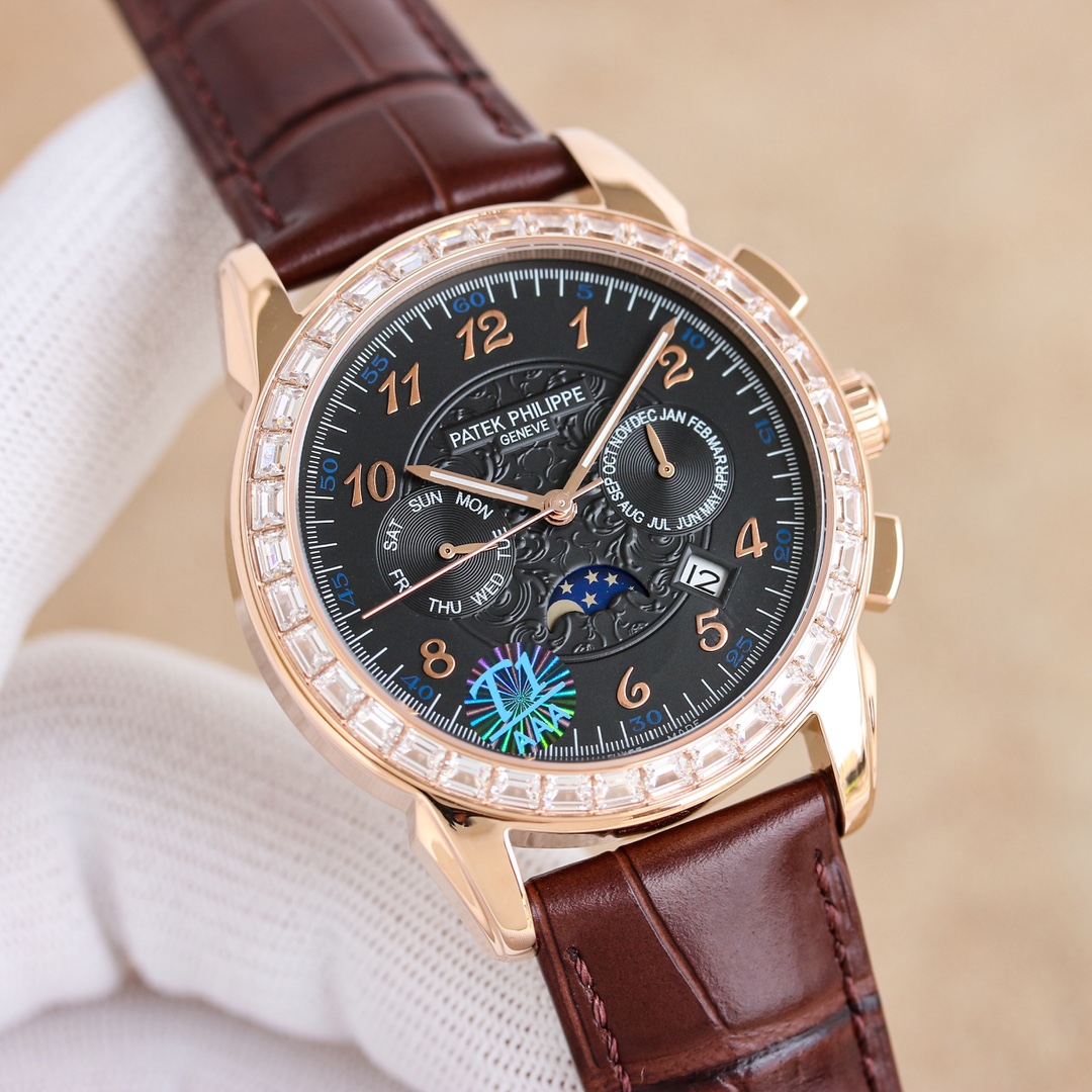 这款手表是AAAAA 1:1 质量 (非常棒). 使用了和原版一模一样的材料. 商标部分也保持了和百达翡丽/Patek Philippe一样. 图片拍摄是实物手表拍摄, 您所收到的实物保证和我们图片一模一样.