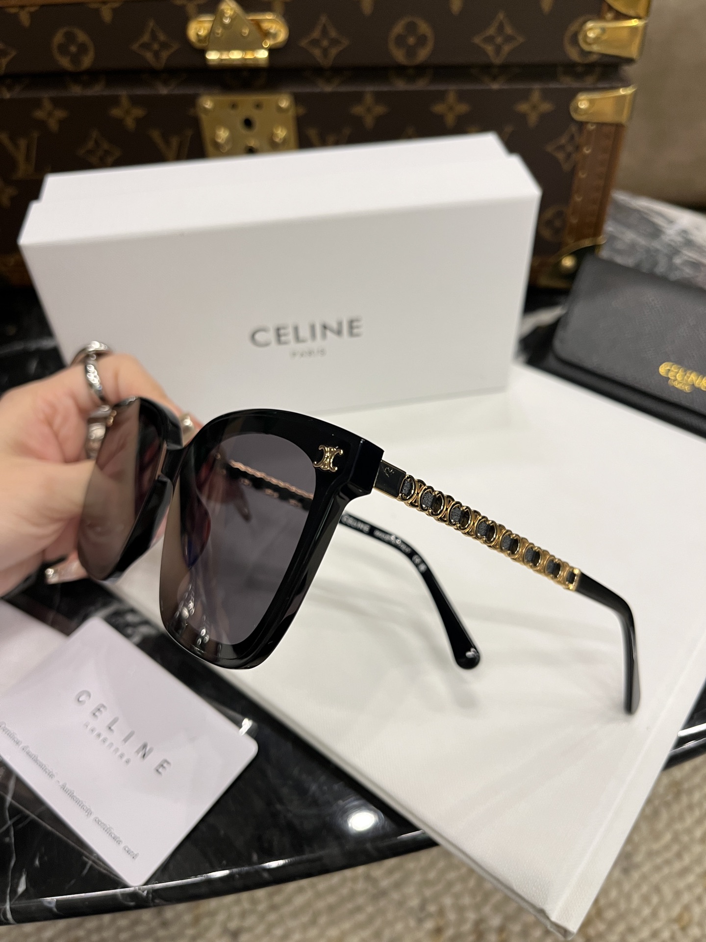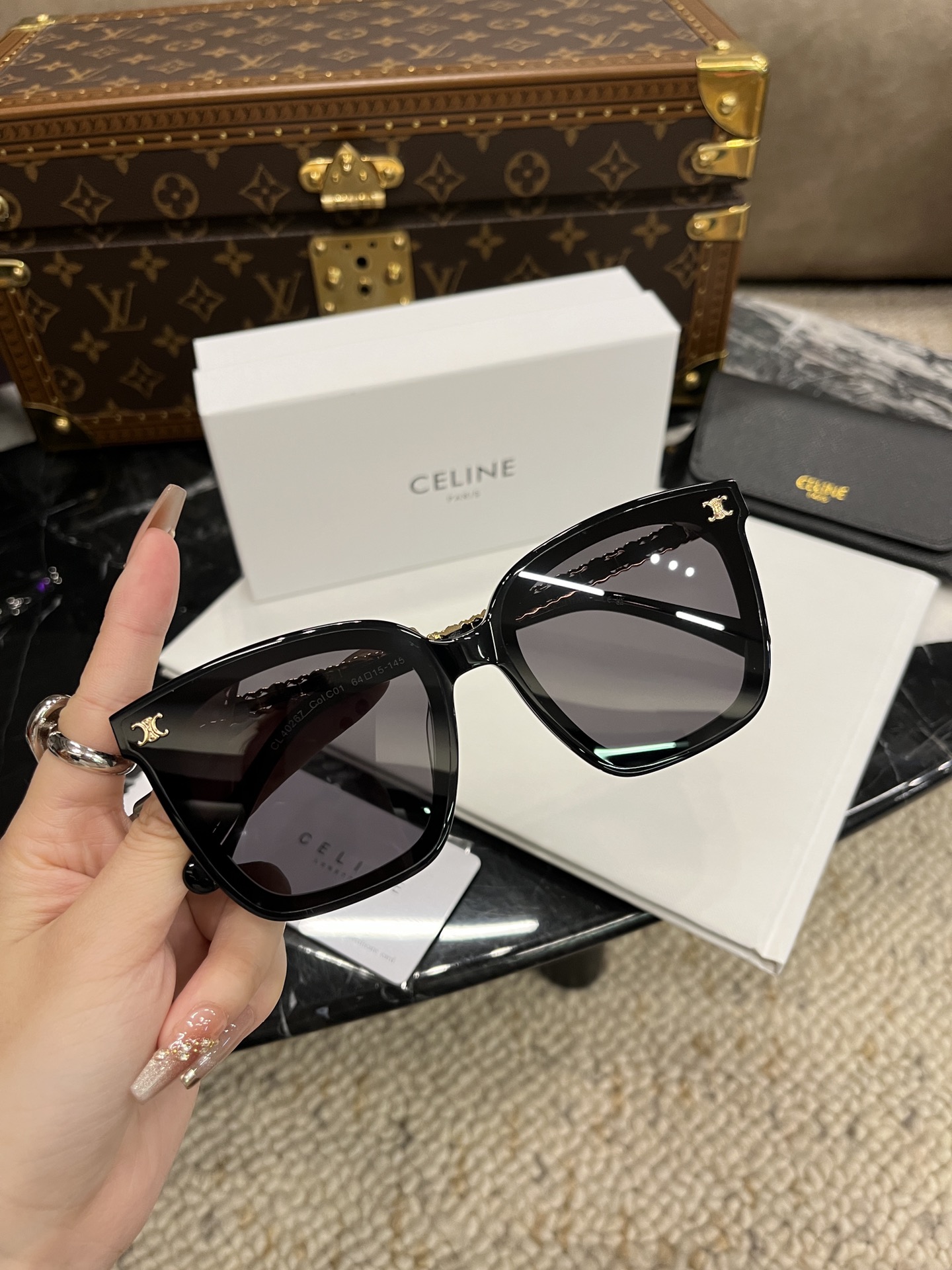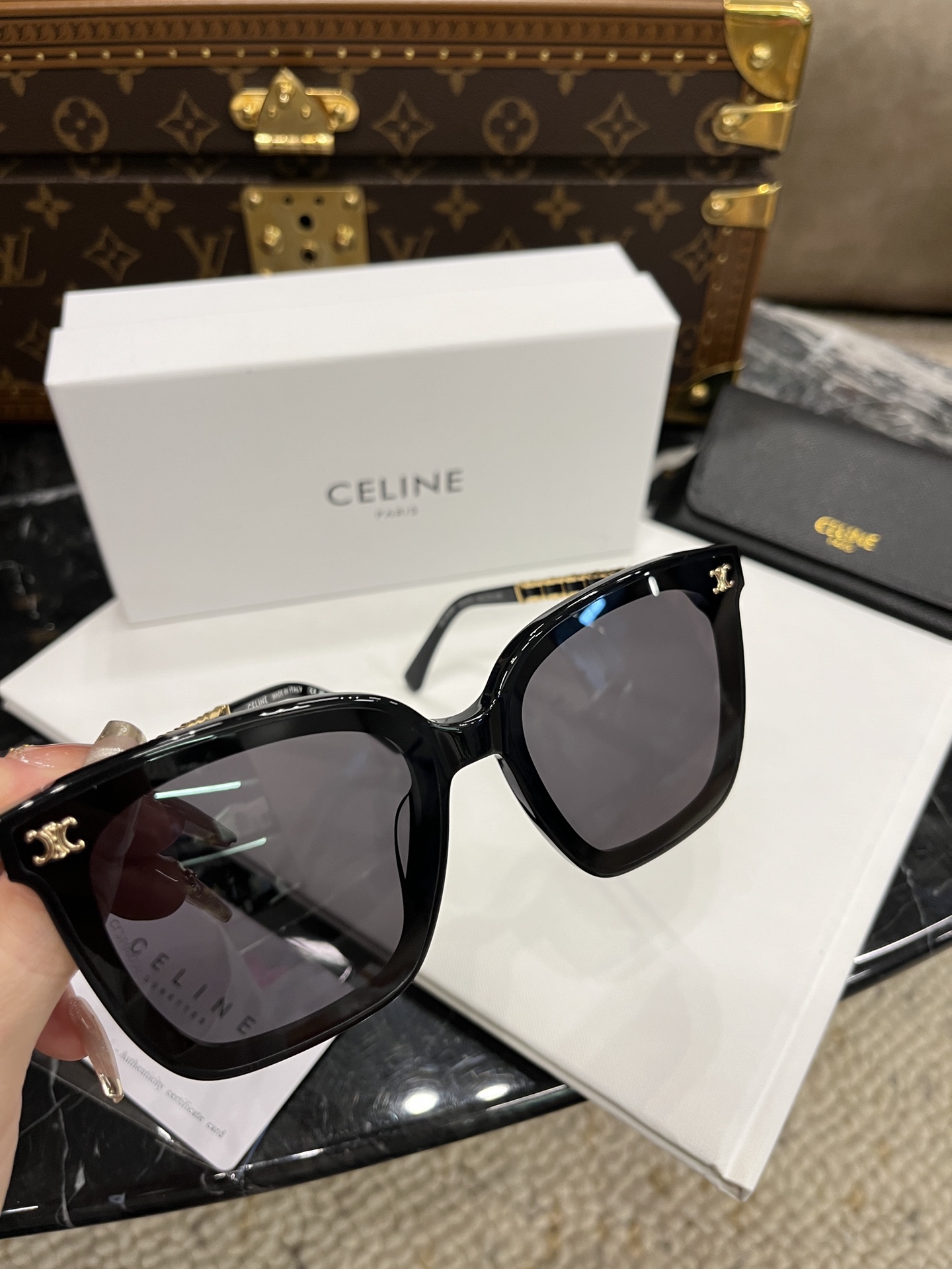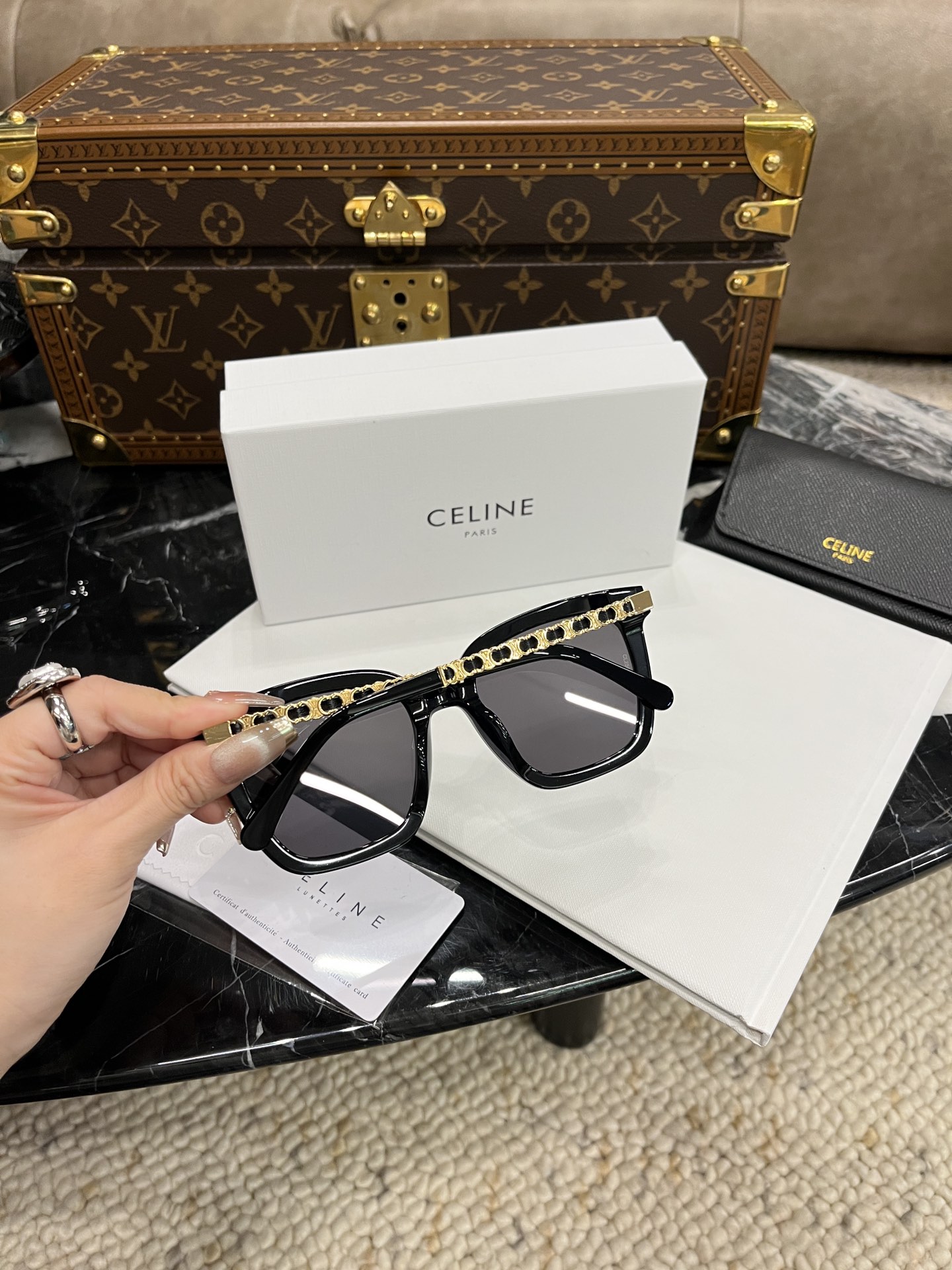 这款太阳眼镜是AAAAA 1:1 质量 (非常棒). 使用了和原版一模一样的材料. 商标部分也保持了和思琳/Celine一样. 图片拍摄是实物太阳眼镜拍摄, 您所收到的实物保证和我们图片一模一样.