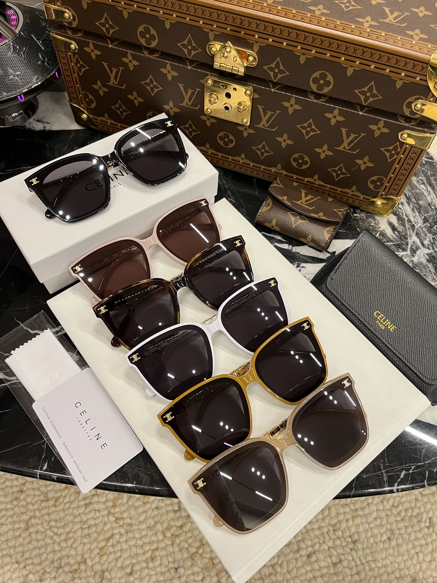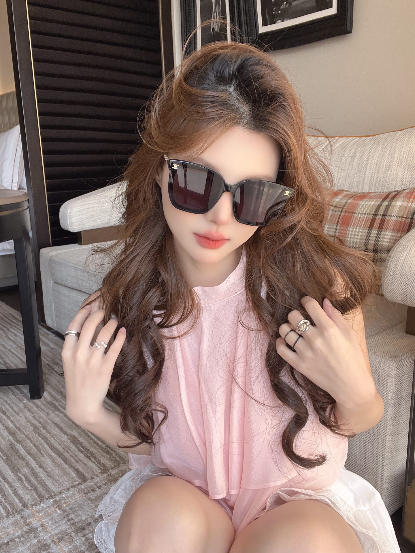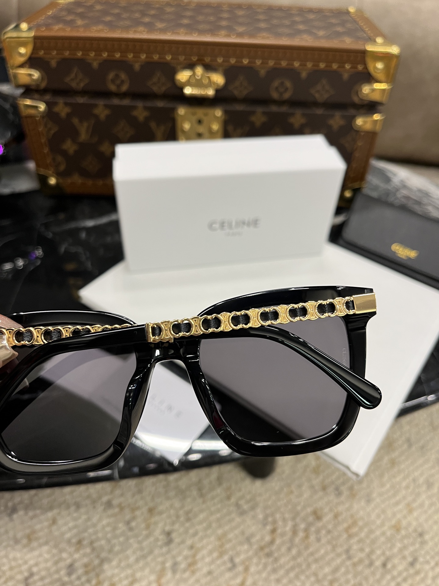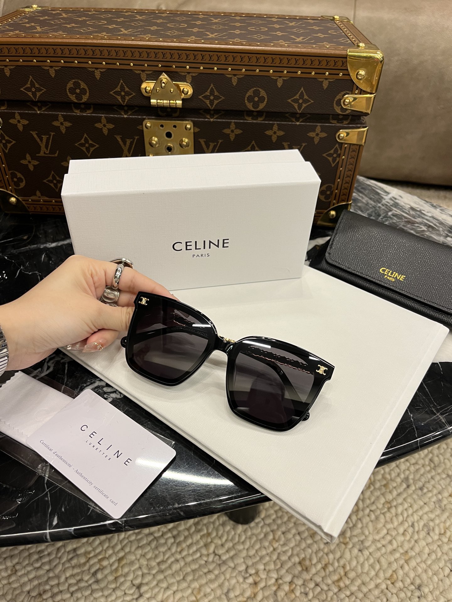 这款太阳眼镜是AAAAA 1:1 质量 (非常棒). 使用了和原版一模一样的材料. 商标部分也保持了和思琳/Celine一样. 图片拍摄是实物太阳眼镜拍摄, 您所收到的实物保证和我们图片一模一样.