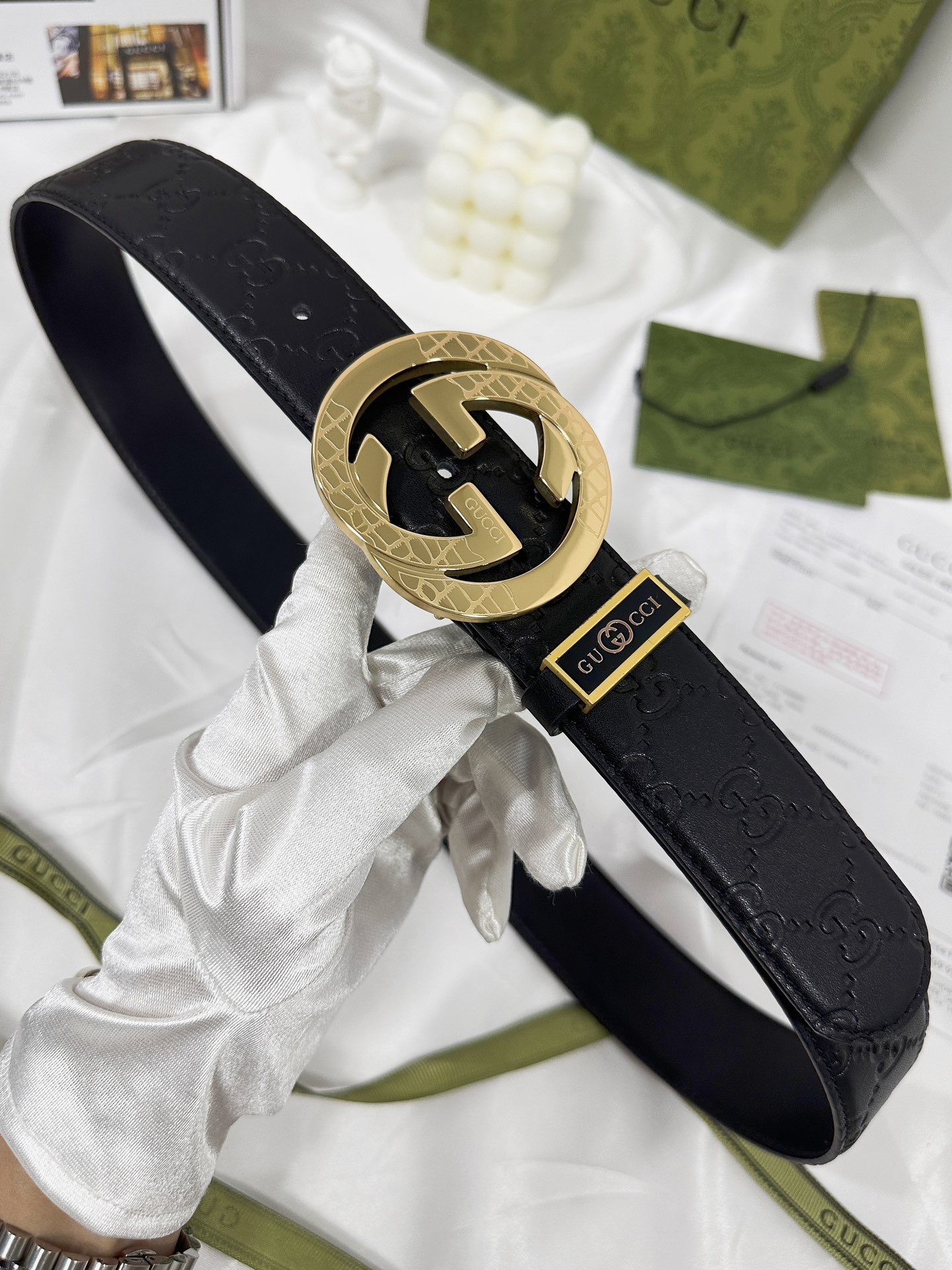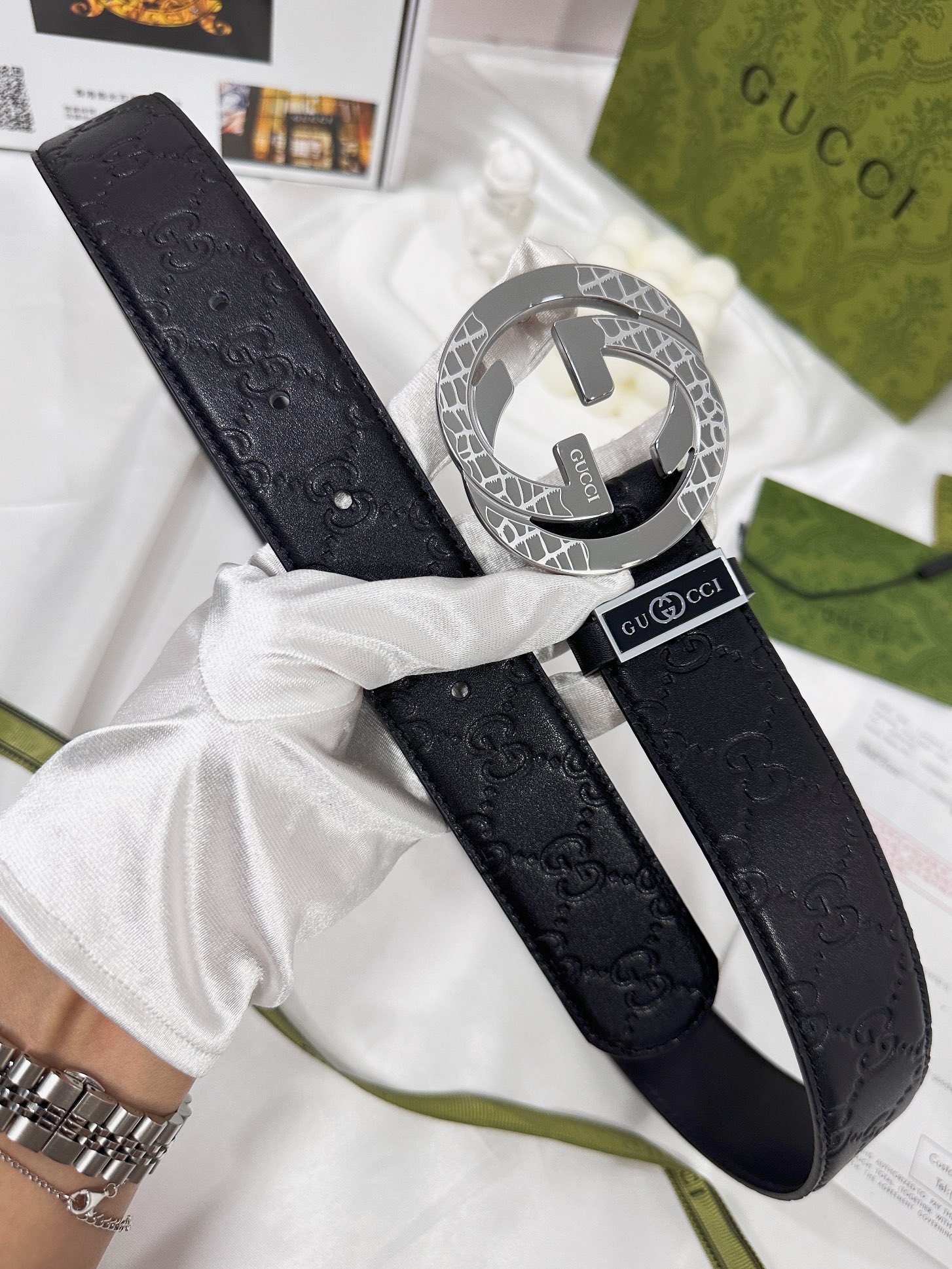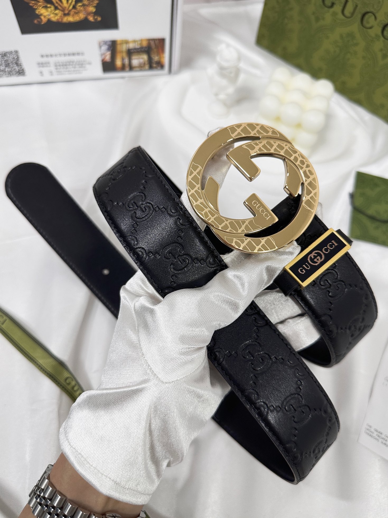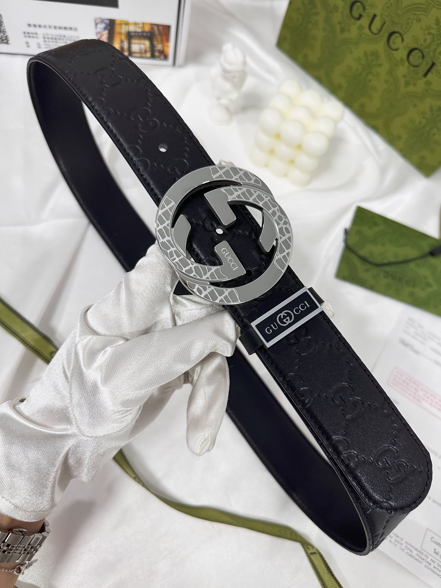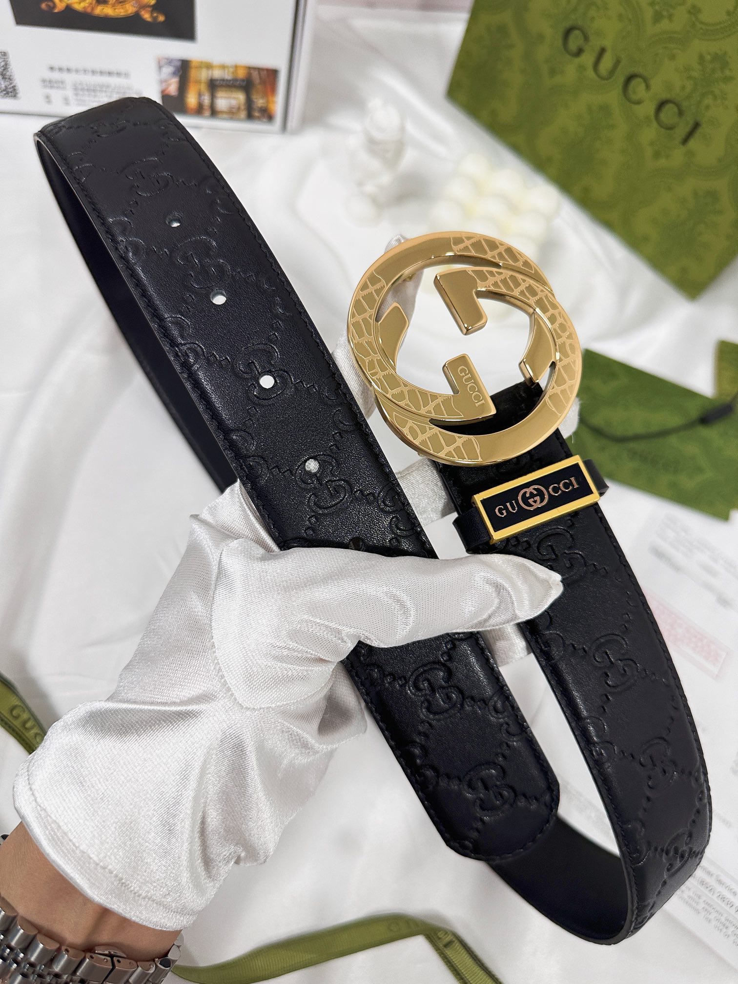 这款皮带是AAAAA 1:1 质量 (非常棒). 使用了和原版一模一样的材料. 商标部分也保持了和古奇/Gucci一样. 图片拍摄是实物皮带拍摄, 您所收到的实物保证和我们图片一模一样.