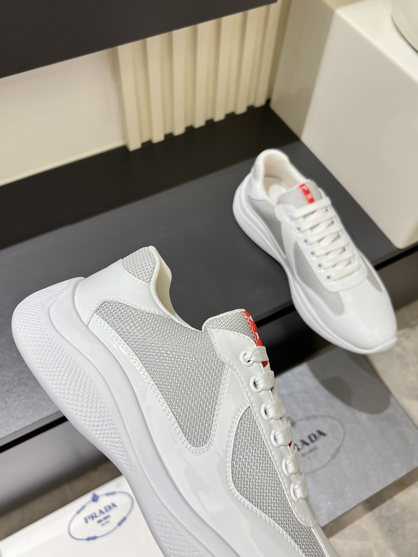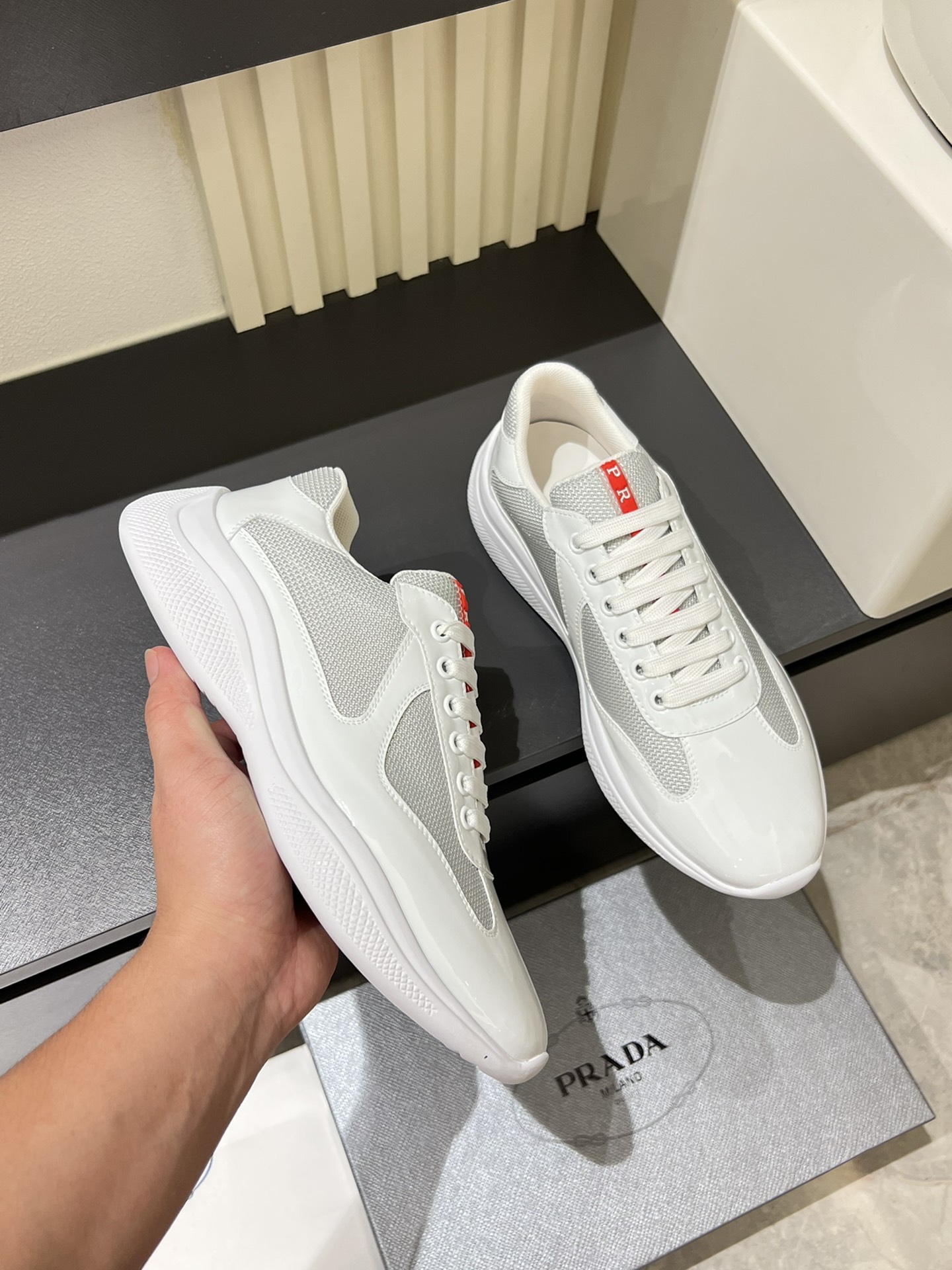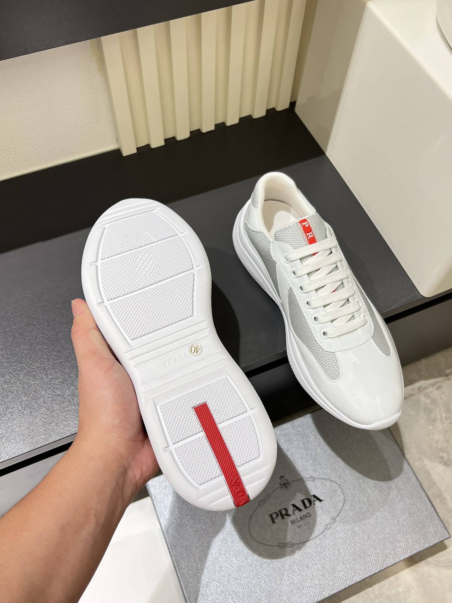 这款鞋子是AAAAA 1:1 质量 (非常棒). 使用了和原版一模一样的材料. 商标部分也保持了和普拉达/Prada一样. 图片拍摄是实物鞋子拍摄, 您所收到的实物保证和我们图片一模一样.