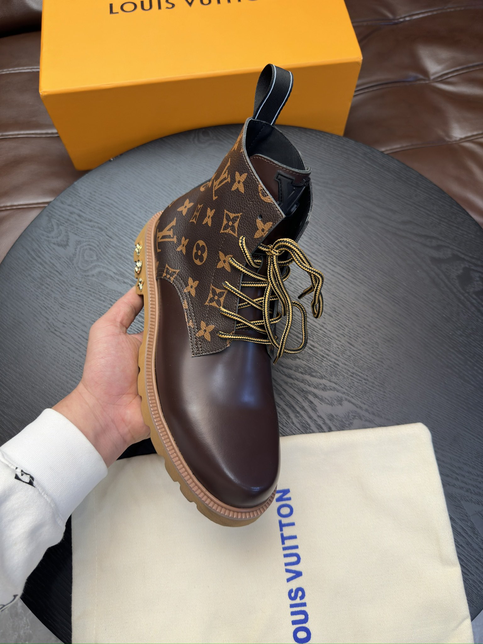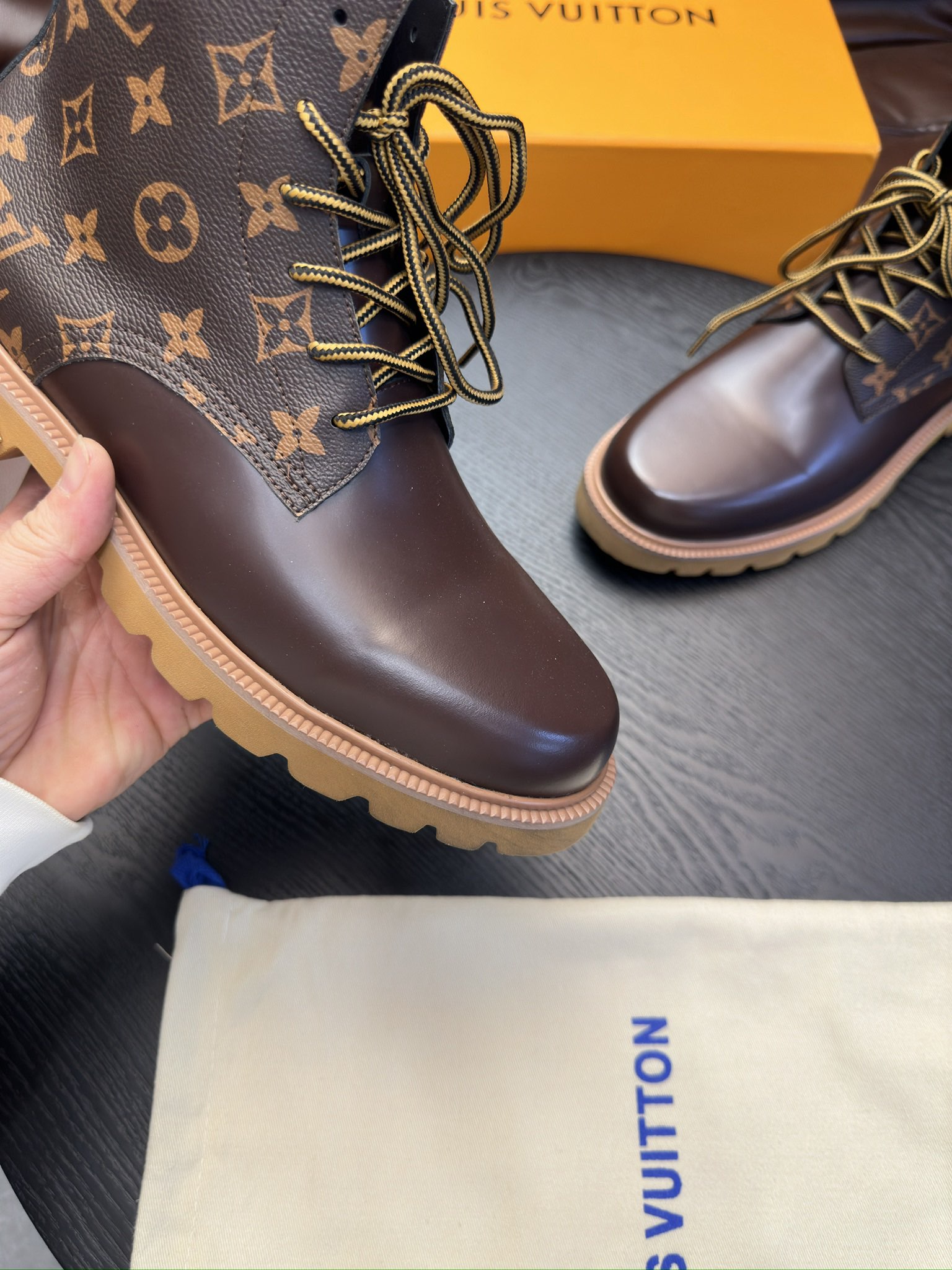这款鞋子是AAAAA 1:1 质量 (非常棒). 使用了和原版一模一样的材料. 商标部分也保持了和路易威登/Louis Vuitton一样. 图片拍摄是实物鞋子拍摄, 您所收到的实物保证和我们图片一模一样.