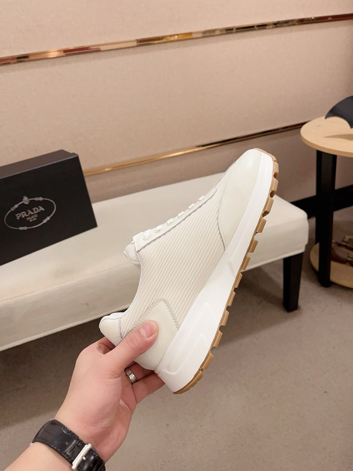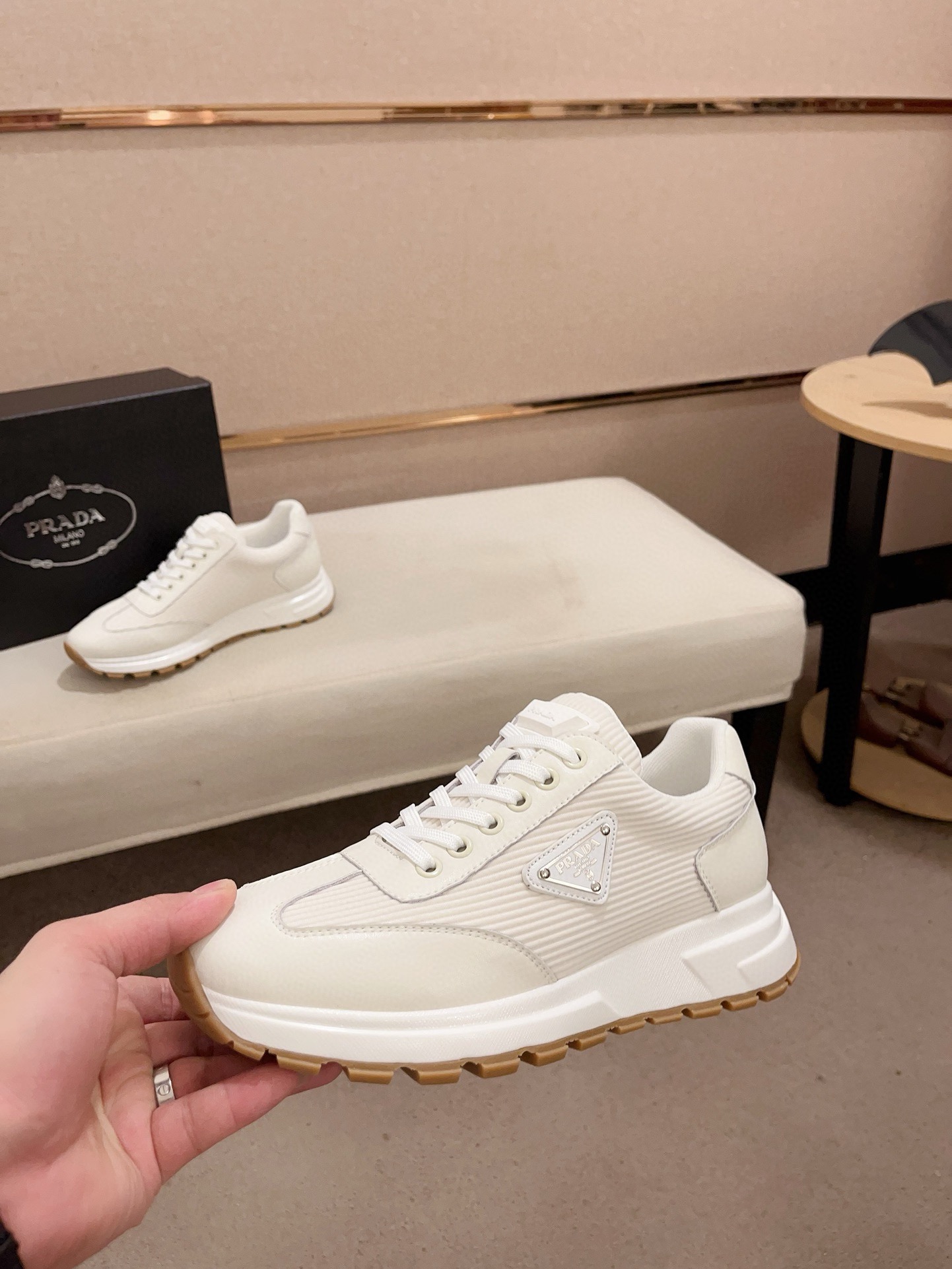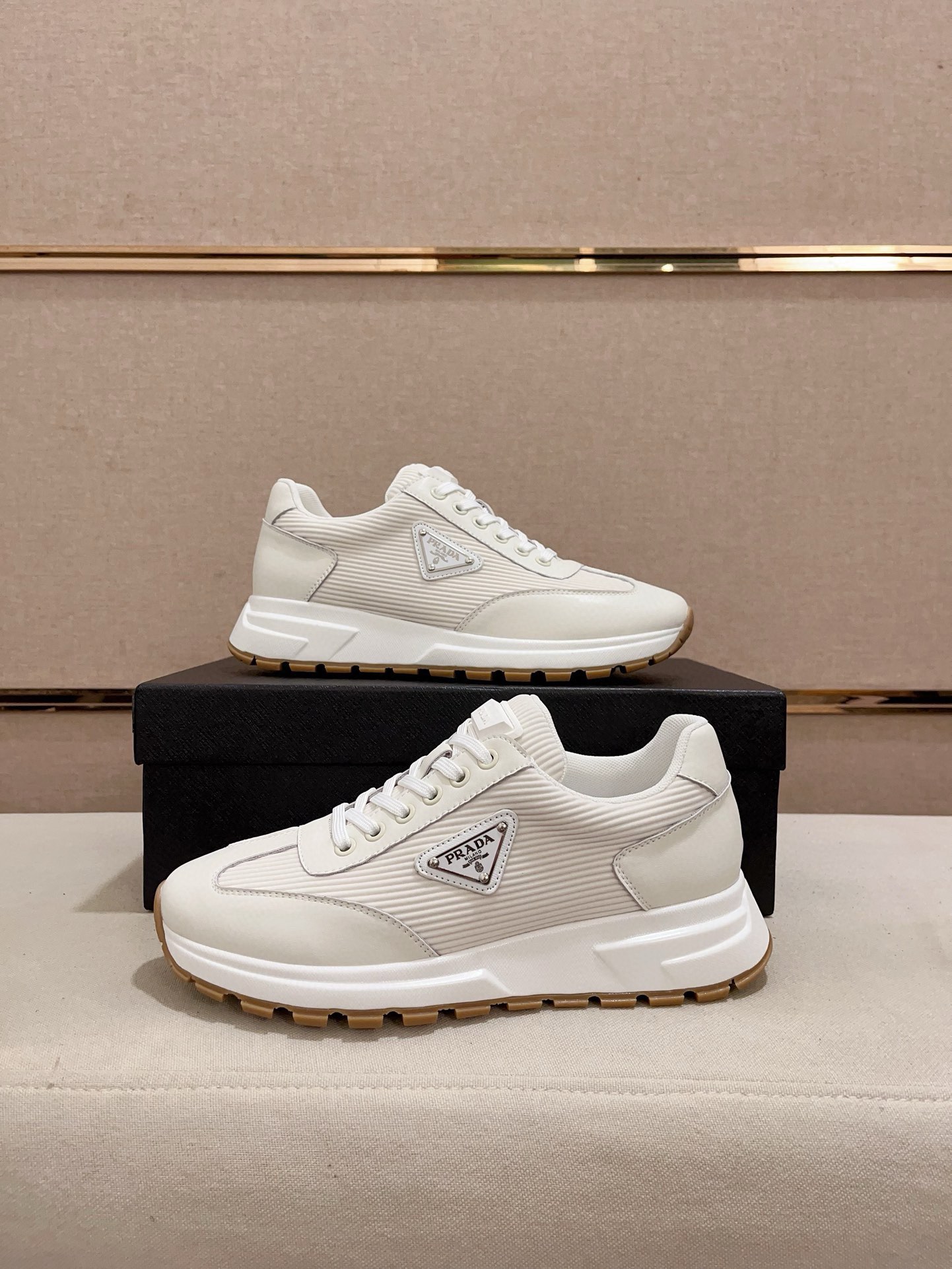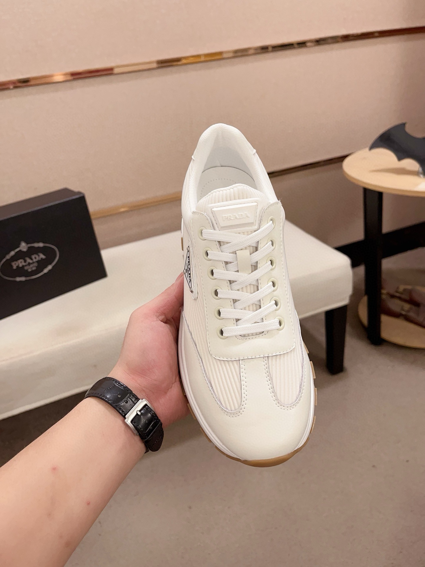 这款鞋子是AAAAA 1:1 质量 (非常棒). 使用了和原版一模一样的材料. 商标部分也保持了和普拉达/Prada一样. 图片拍摄是实物鞋子拍摄, 您所收到的实物保证和我们图片一模一样.