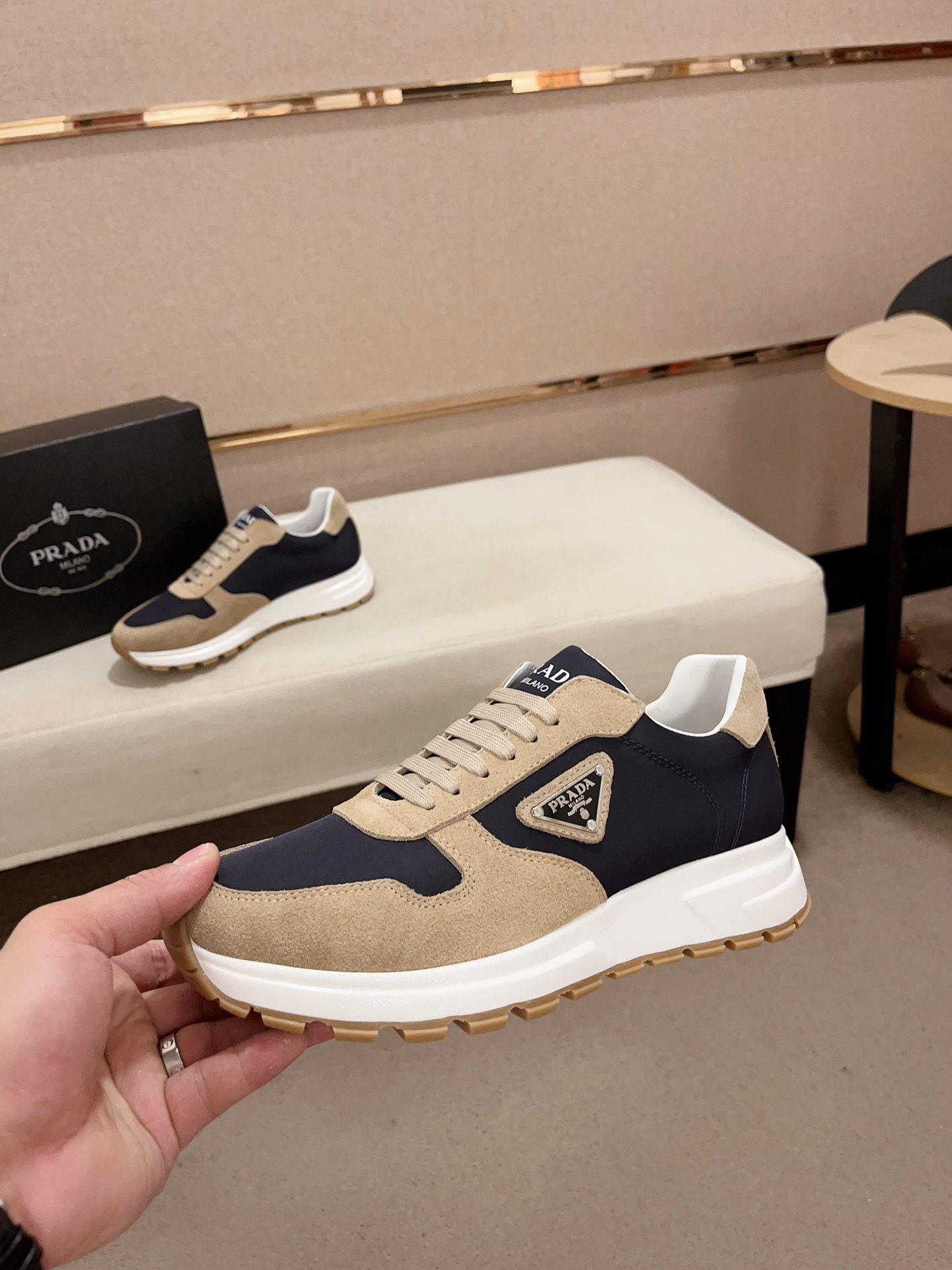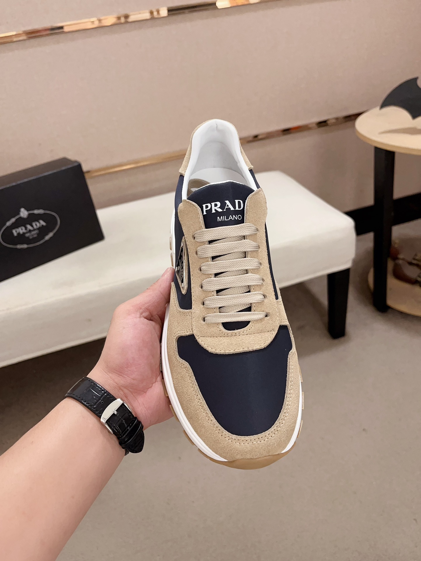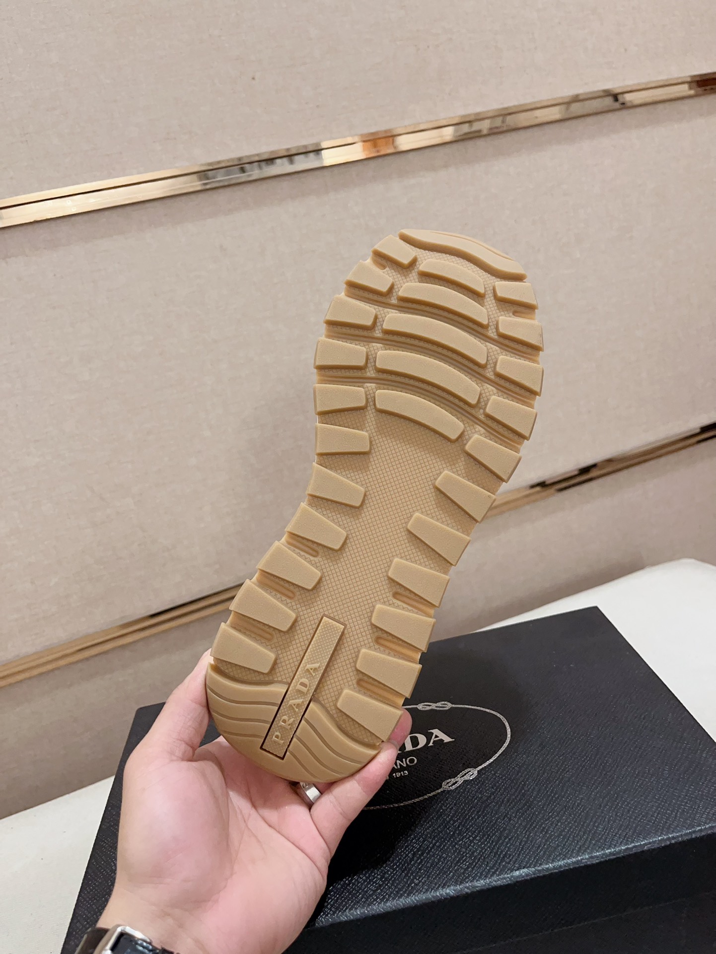 这款鞋子是AAAAA 1:1 质量 (非常棒). 使用了和原版一模一样的材料. 商标部分也保持了和普拉达/Prada一样. 图片拍摄是实物鞋子拍摄, 您所收到的实物保证和我们图片一模一样.