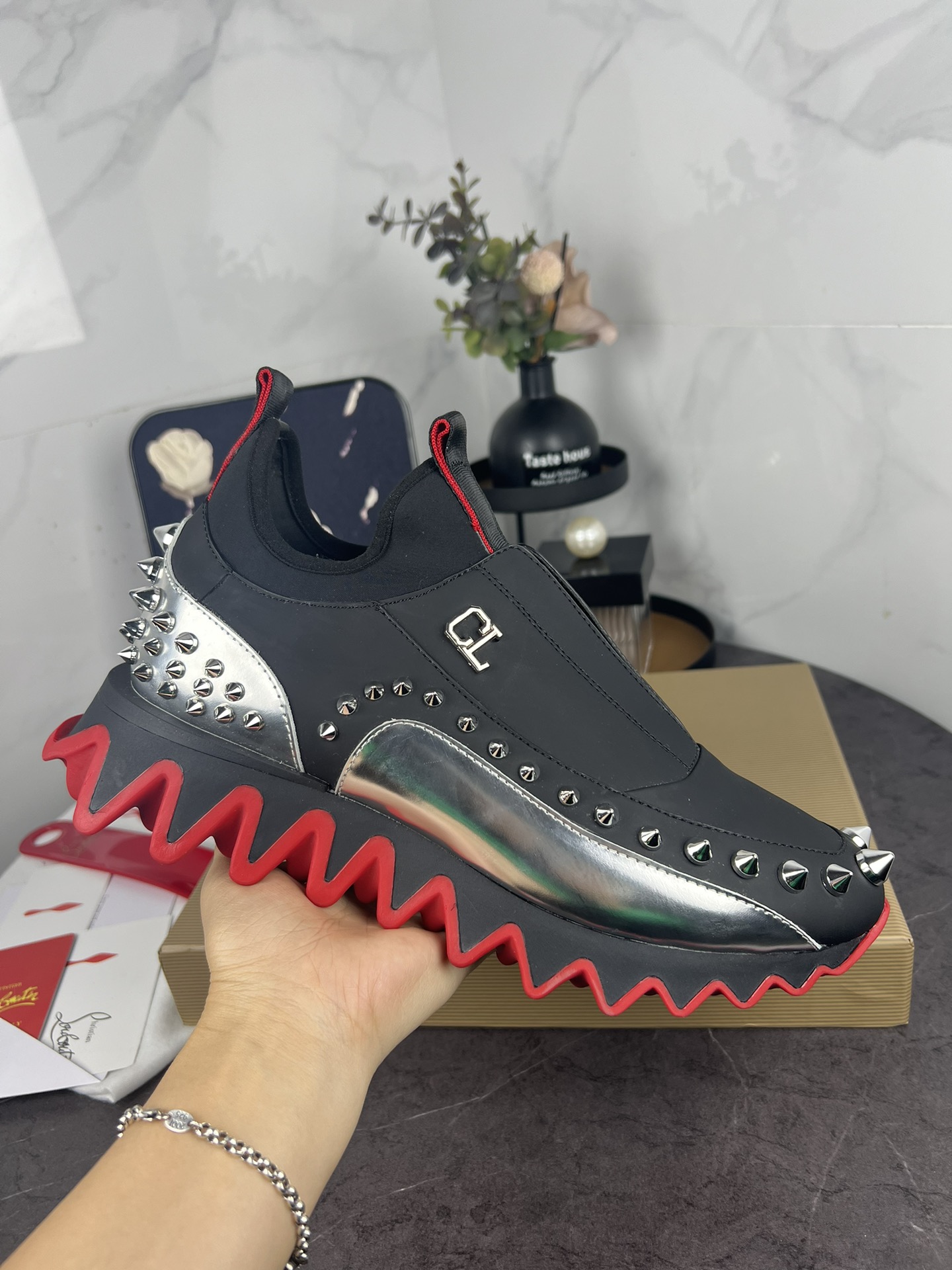 这款鞋子是AAAAA 1:1 质量 (非常棒). 使用了和原版一模一样的材料. 商标部分也保持了和克里斯提·鲁布托/Christian Louboutin一样. 图片拍摄是实物鞋子拍摄, 您所收到的实物保证和我们图片一模一样.
